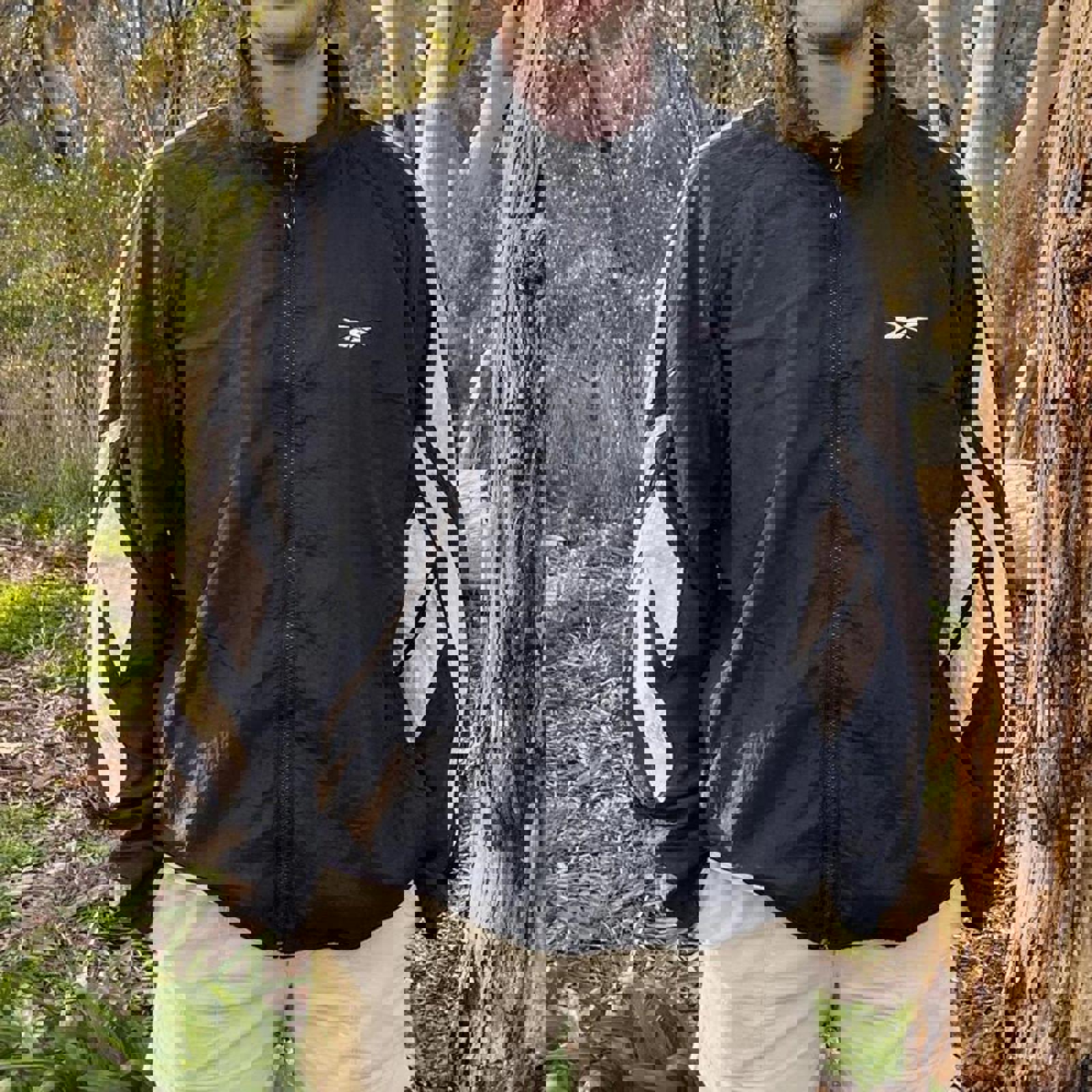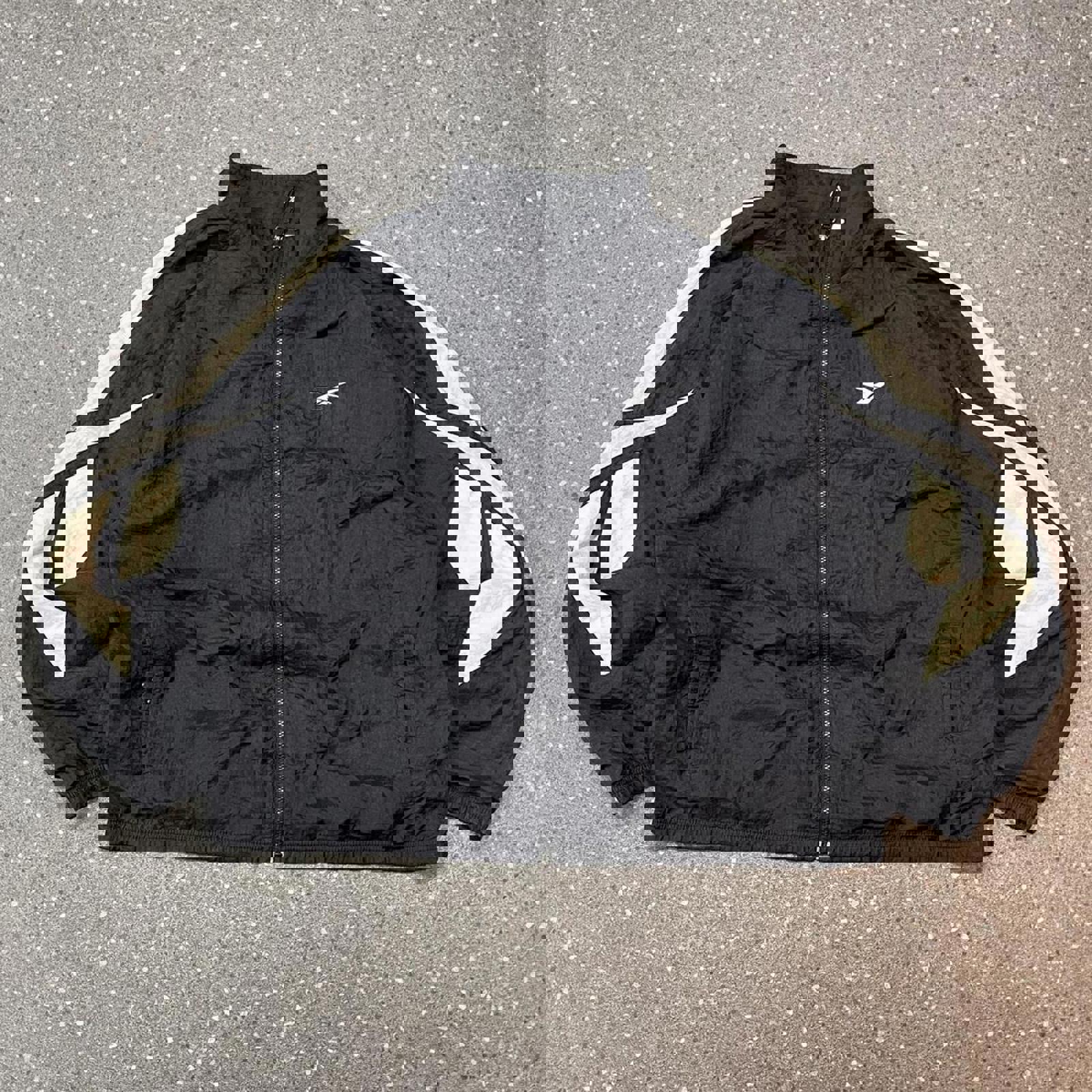 Black Reebok windbreaker jacket with white Reebok logos on the sleeves and a white embroidered logo on the chest