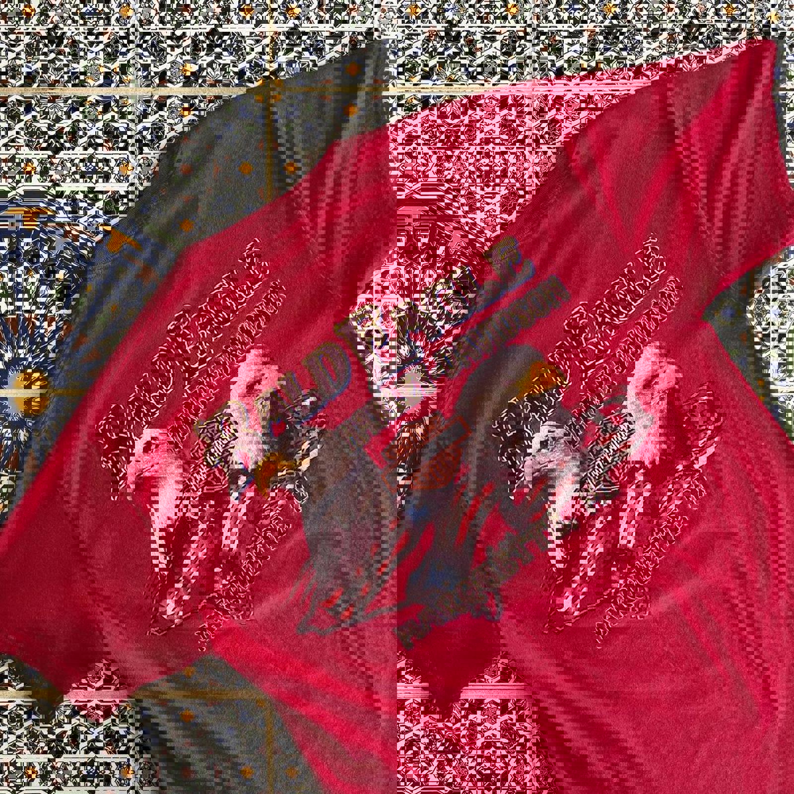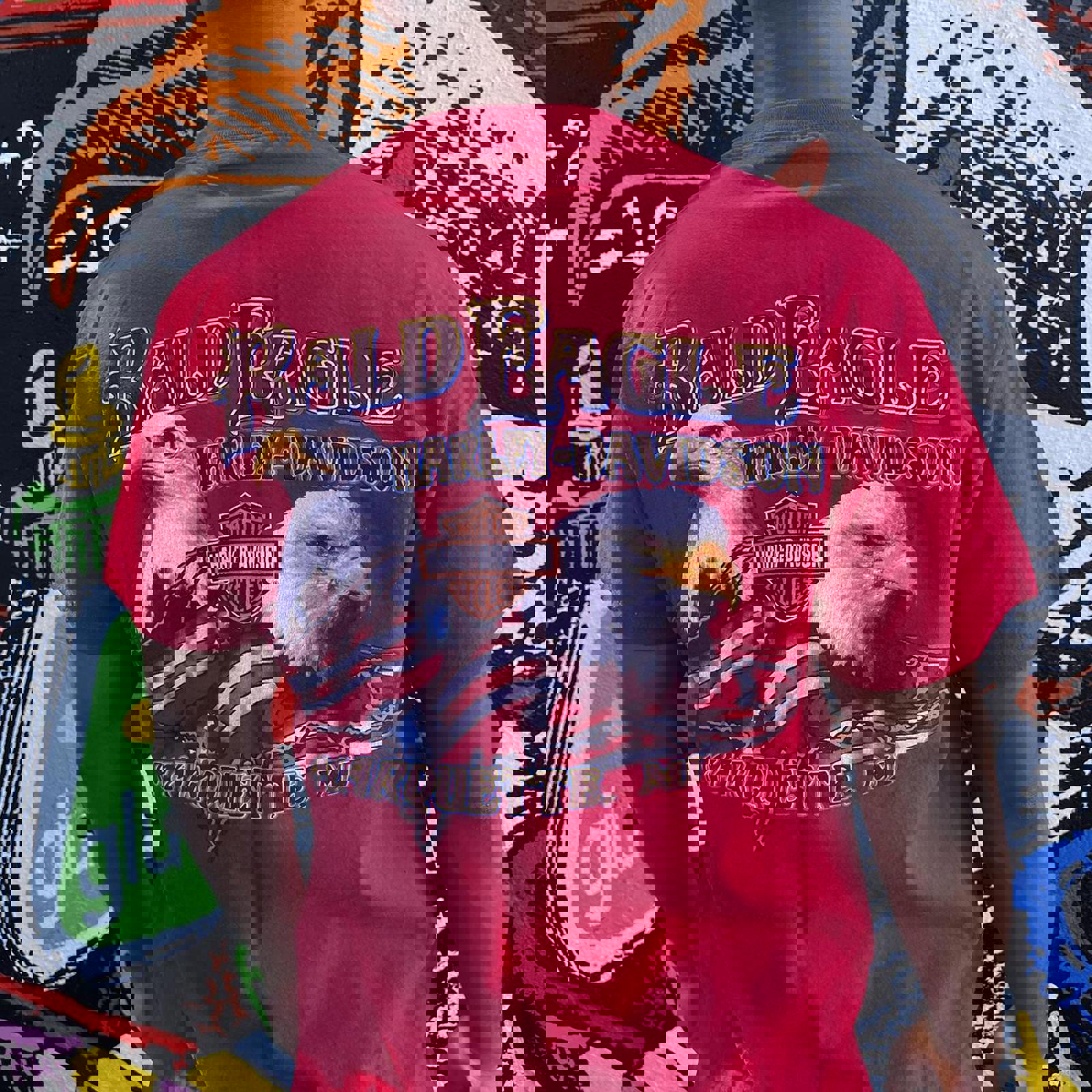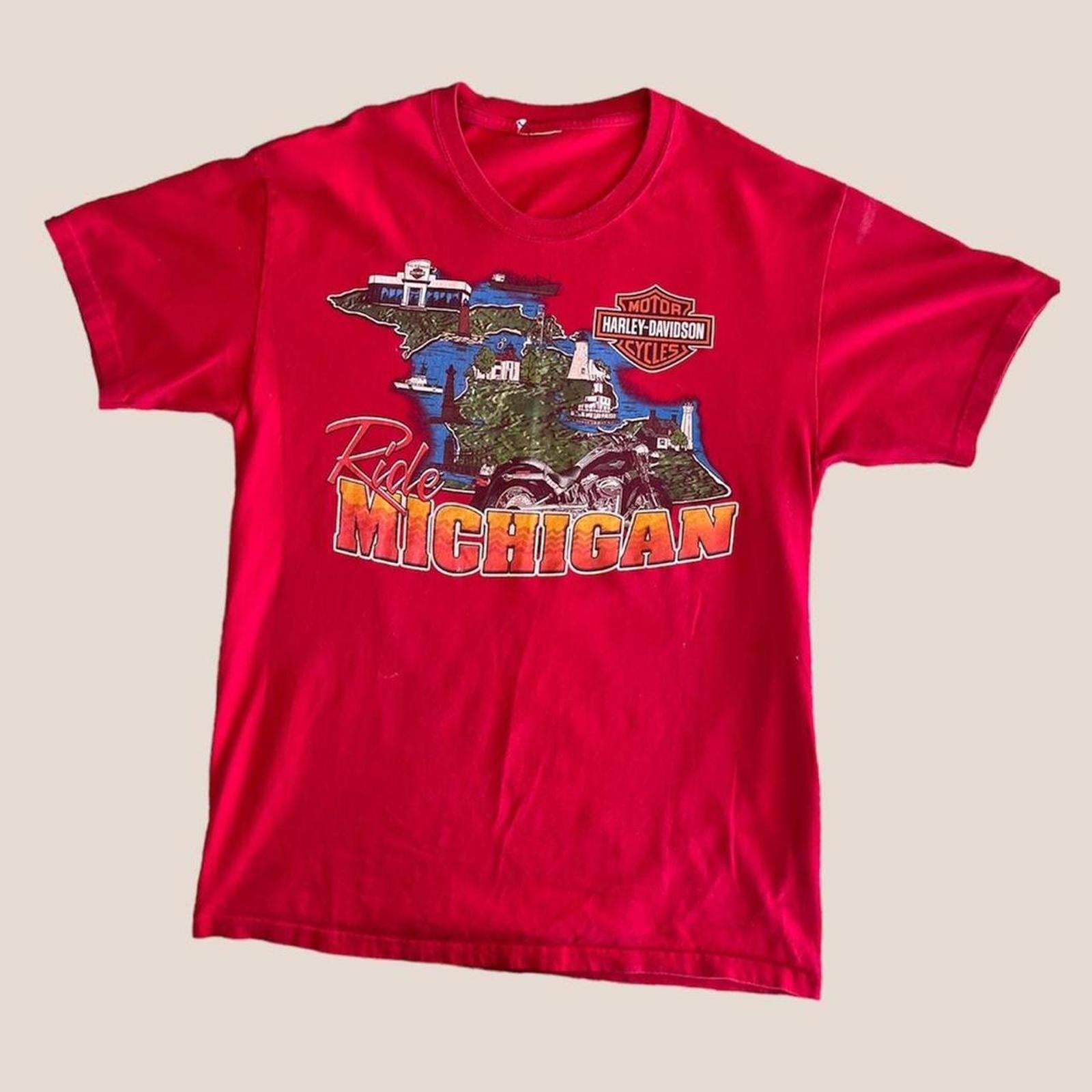Red tee with a ride Michigan Harley Davidson graphic in the front and a Marquette Michigan bald eagle graphic on the back