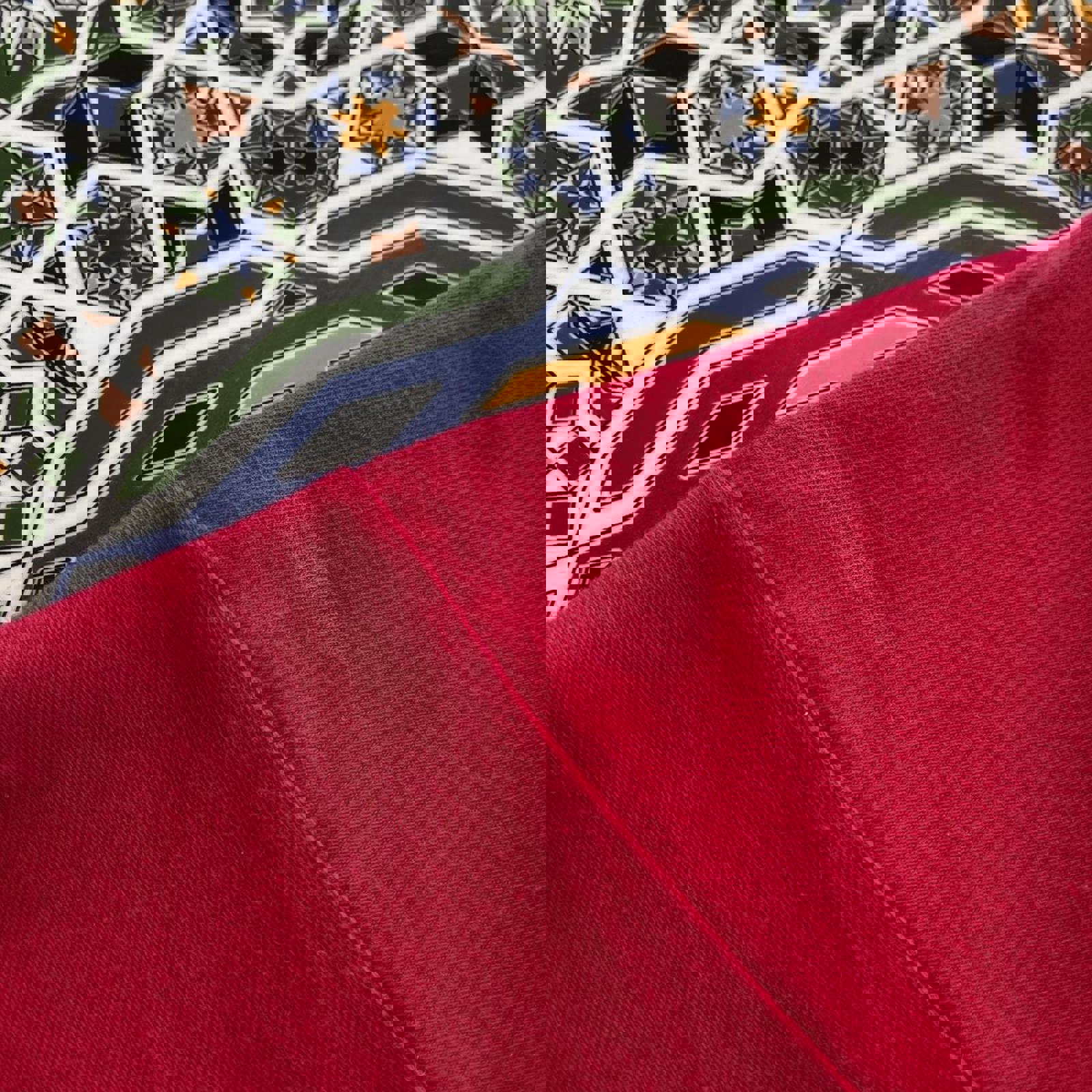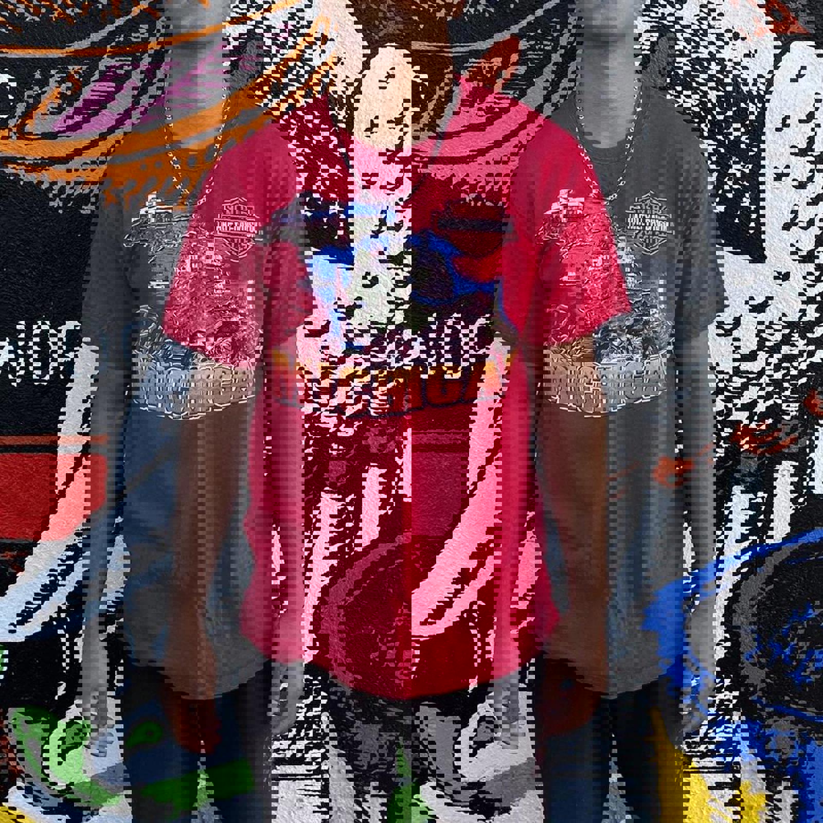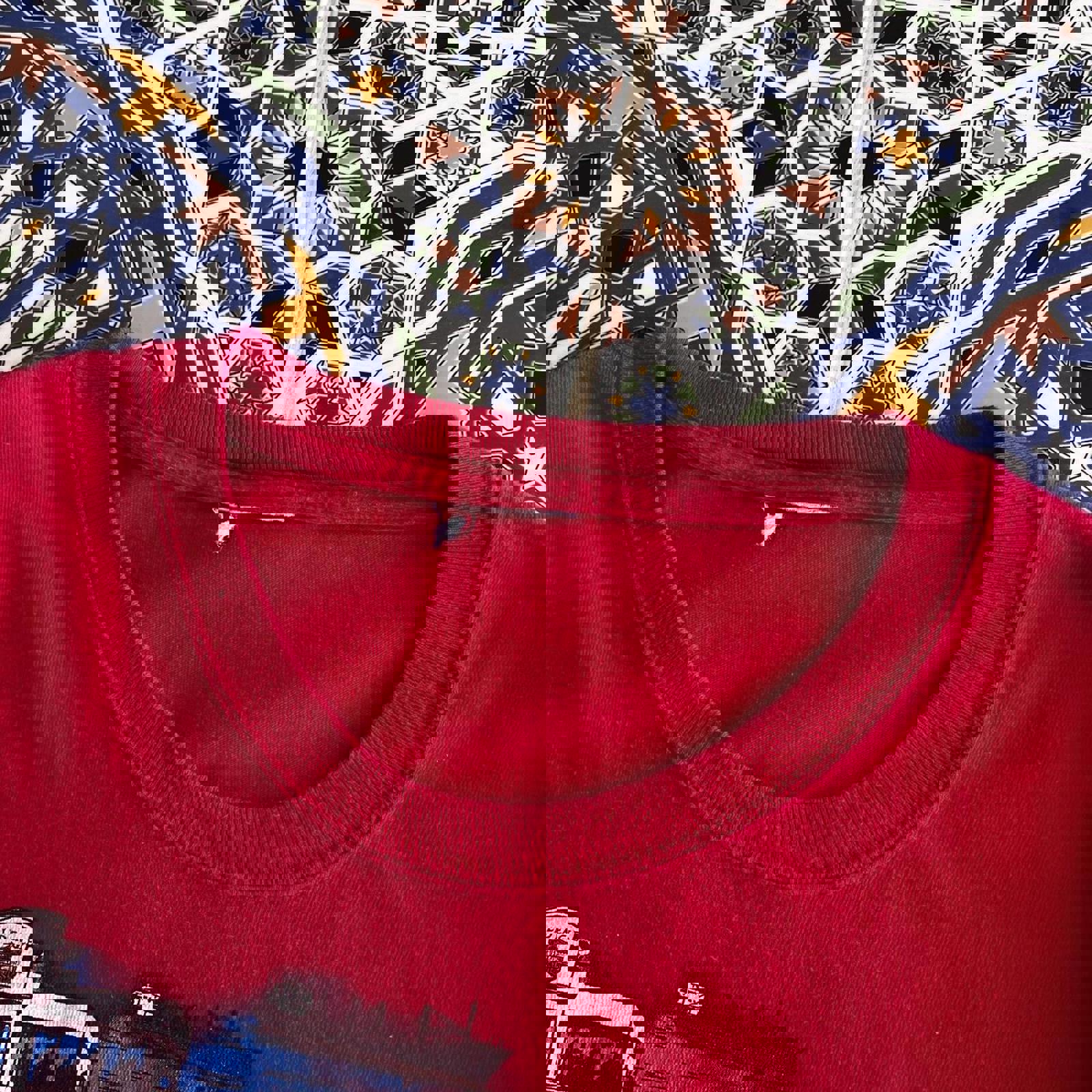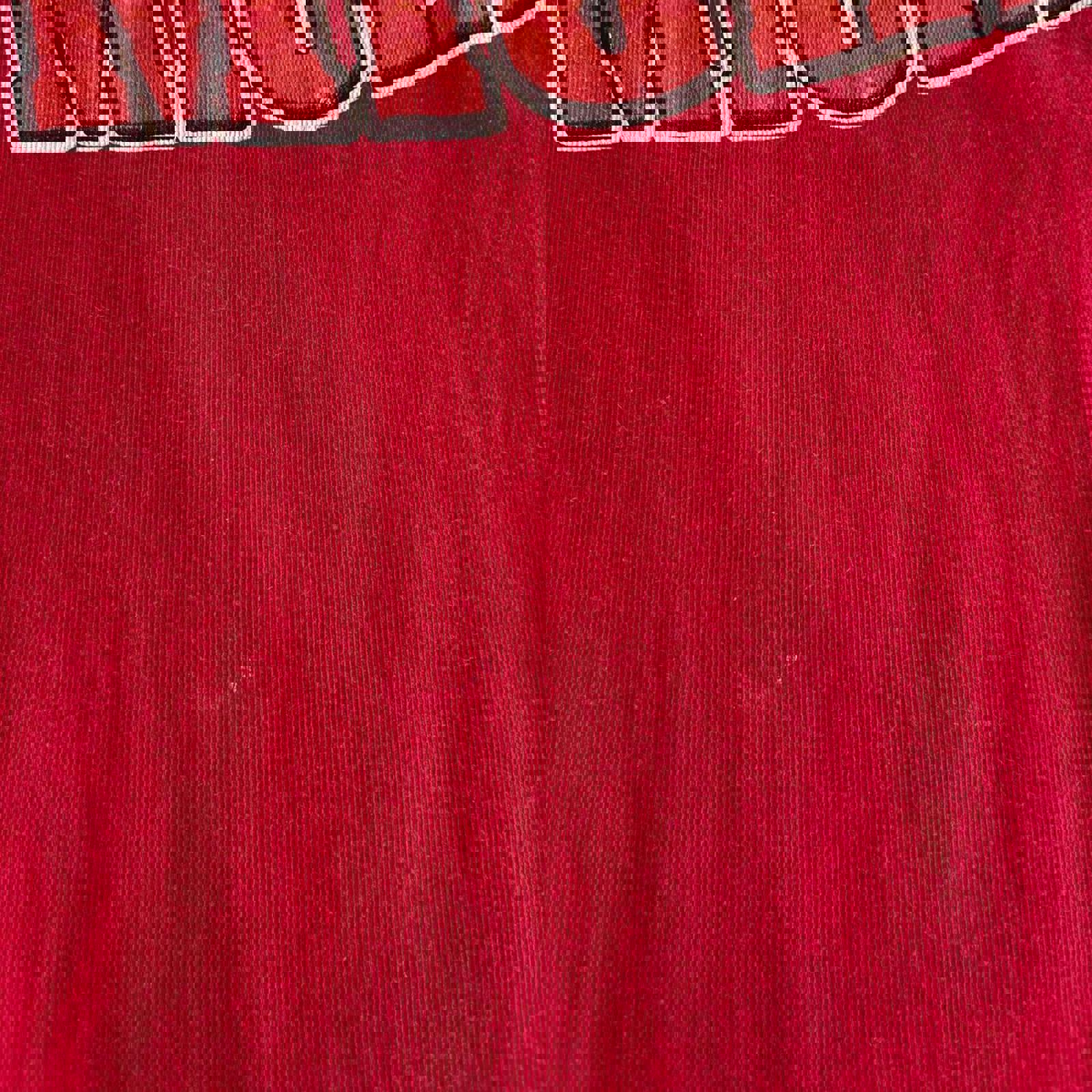 Red tee with a ride Michigan Harley Davidson graphic in the front and a Marquette Michigan bald eagle graphic on the back