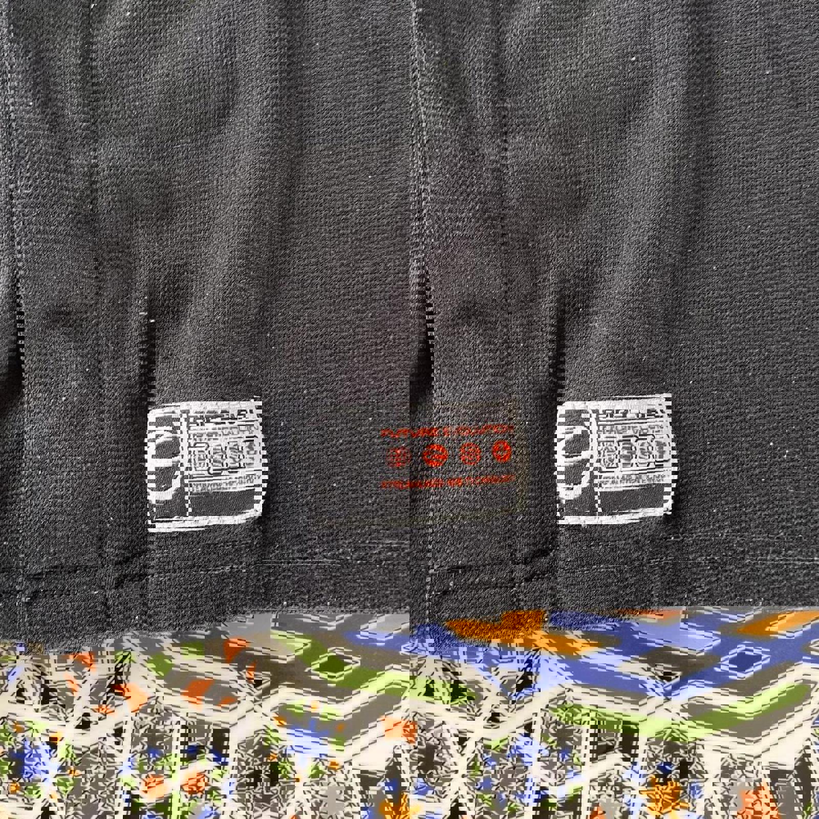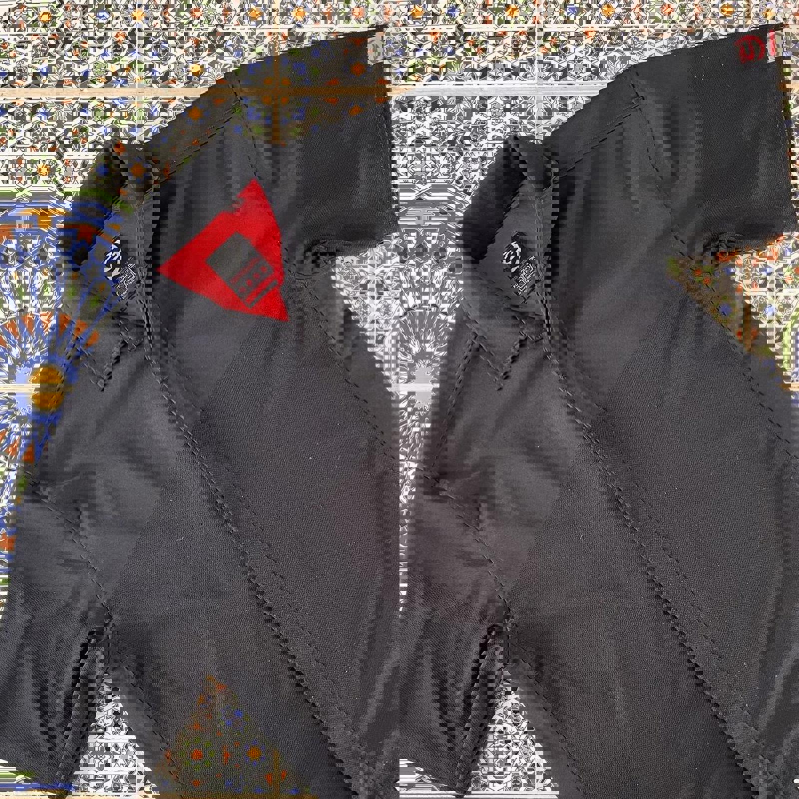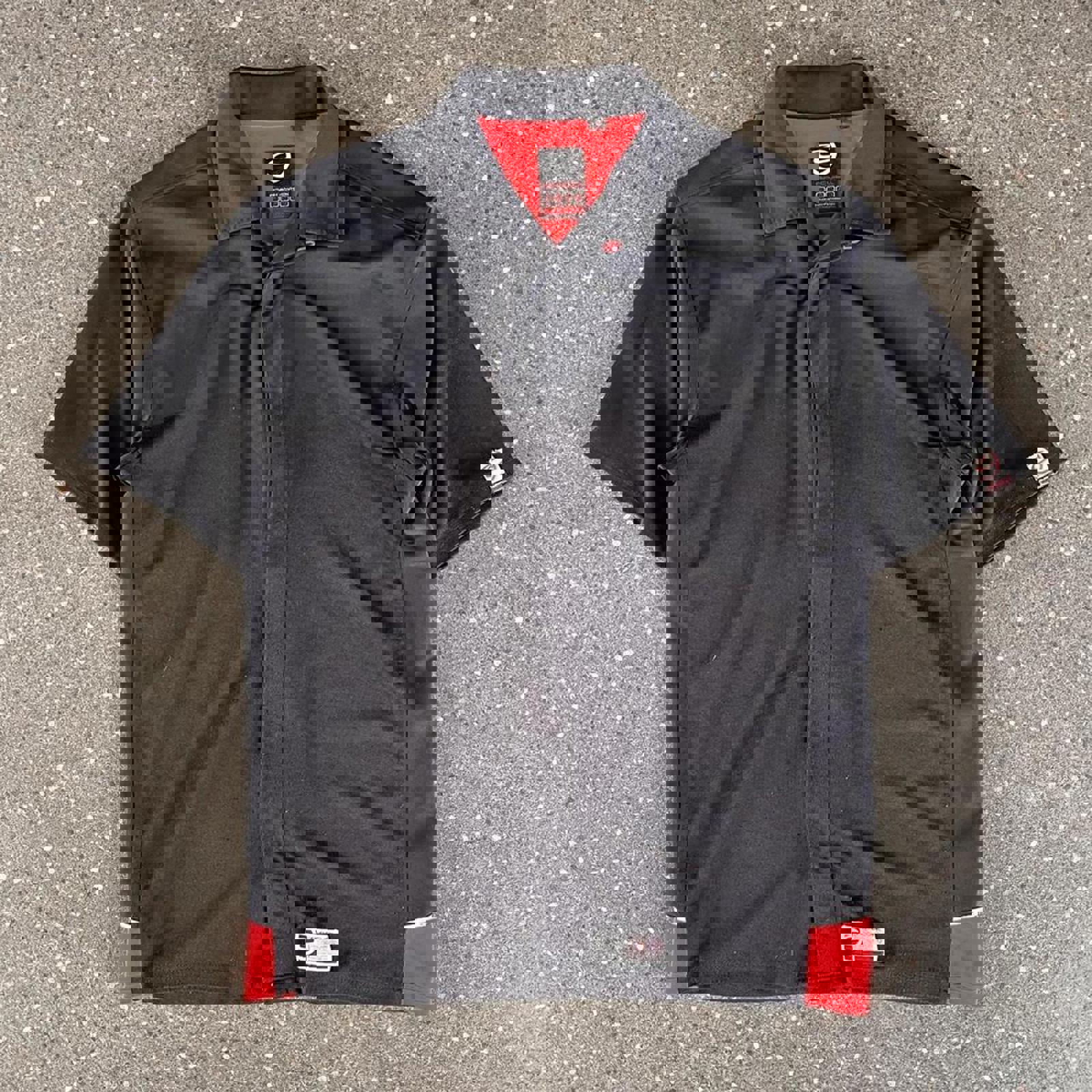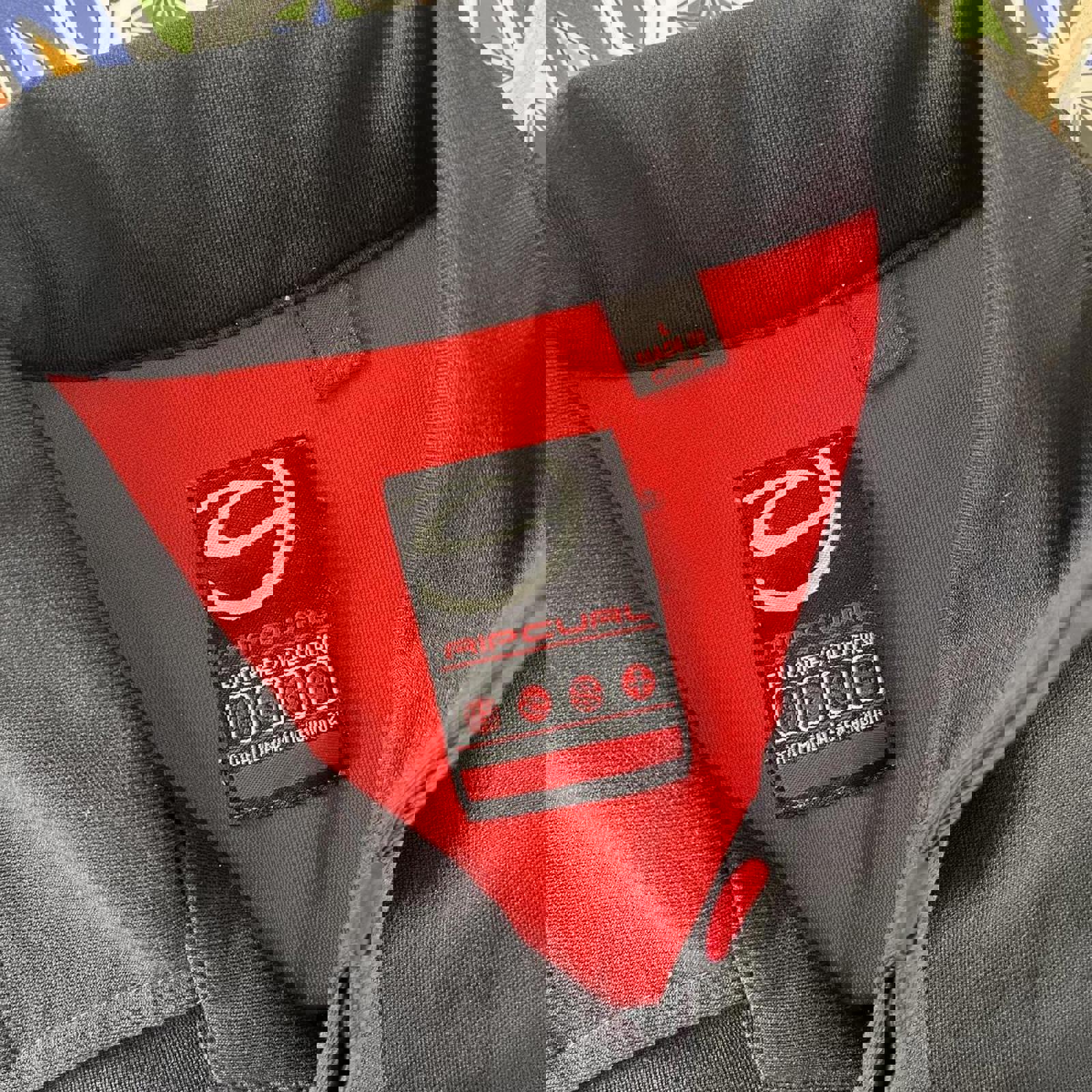 red, black and white ripcurl short sleeved button up shirt with hidden buttons and a patch on the hip