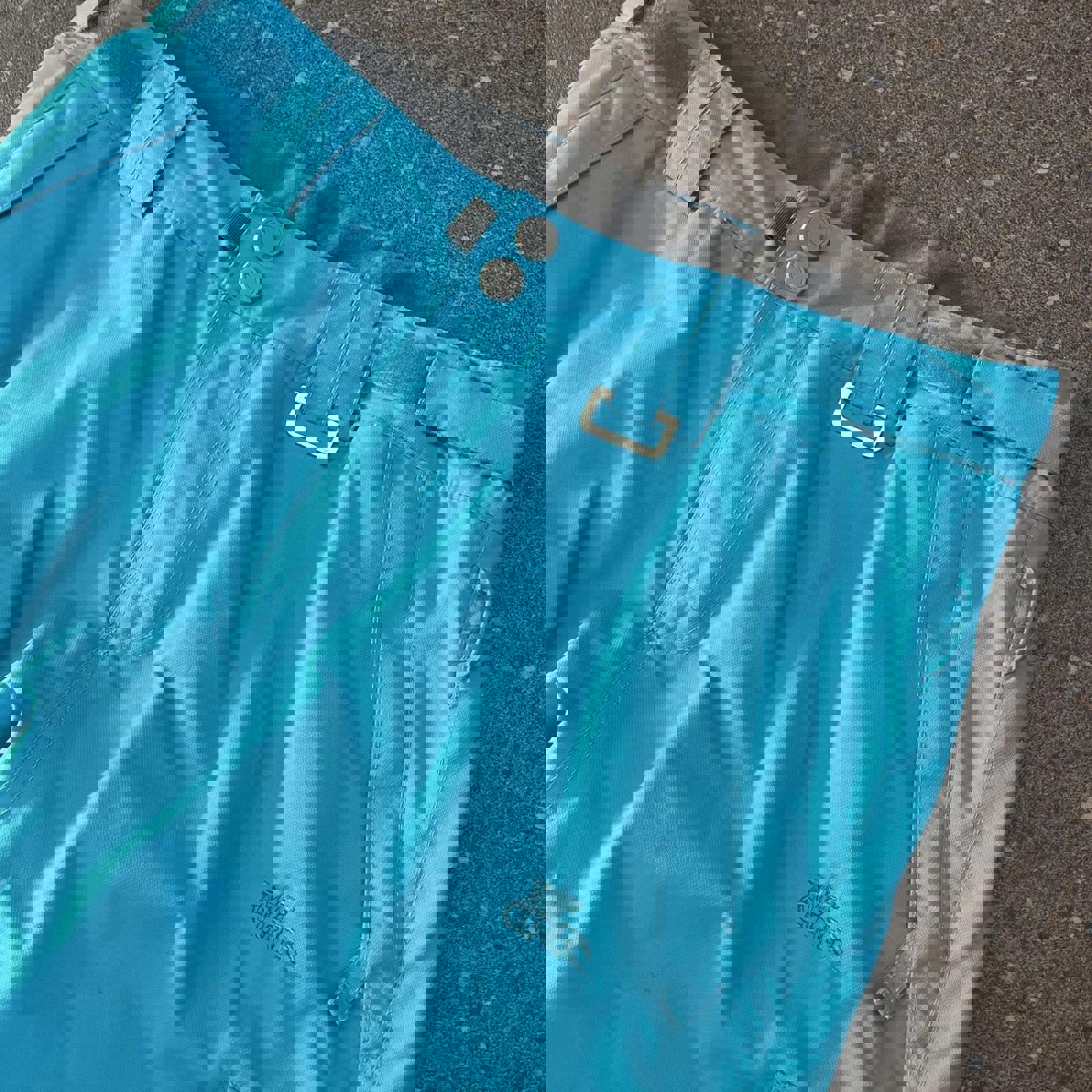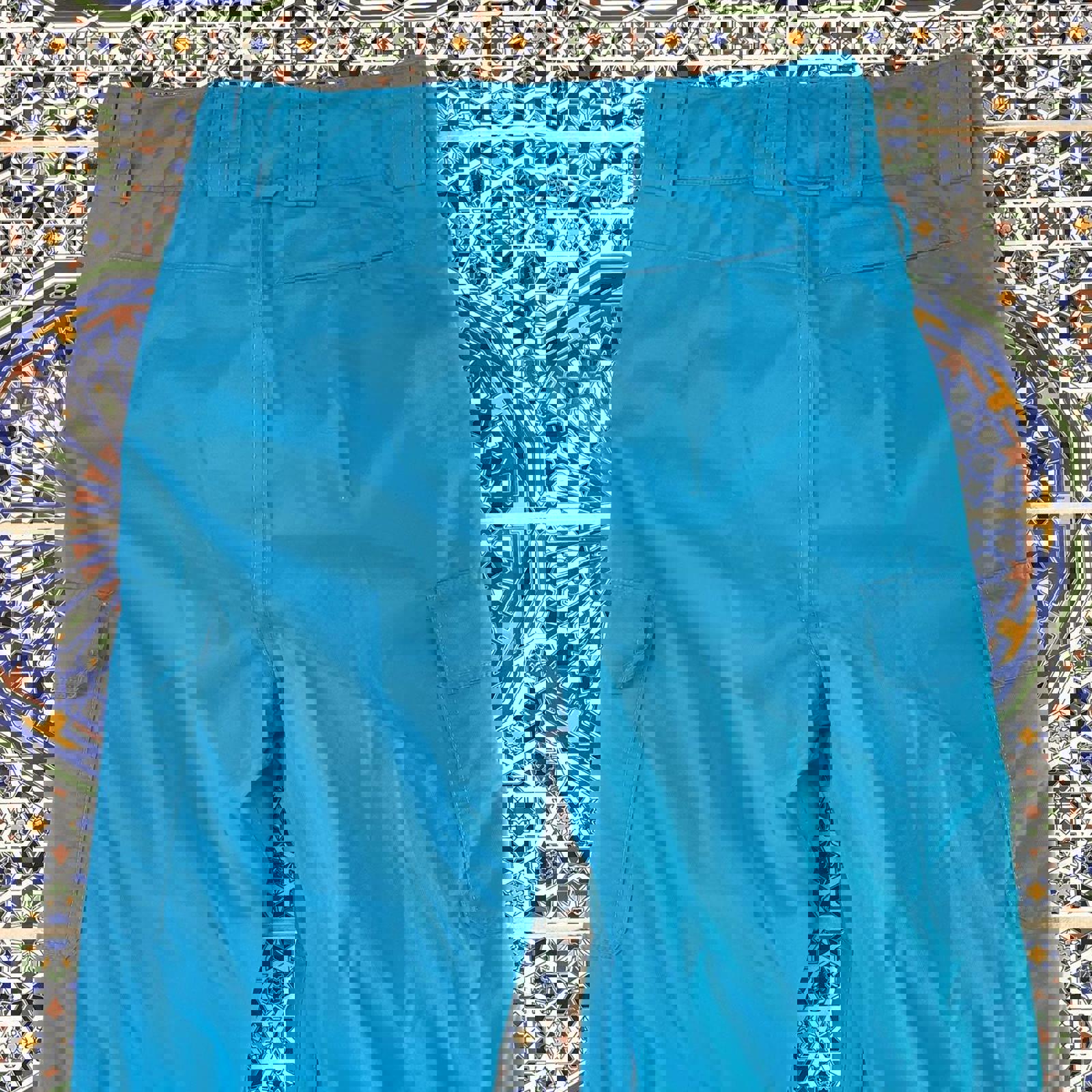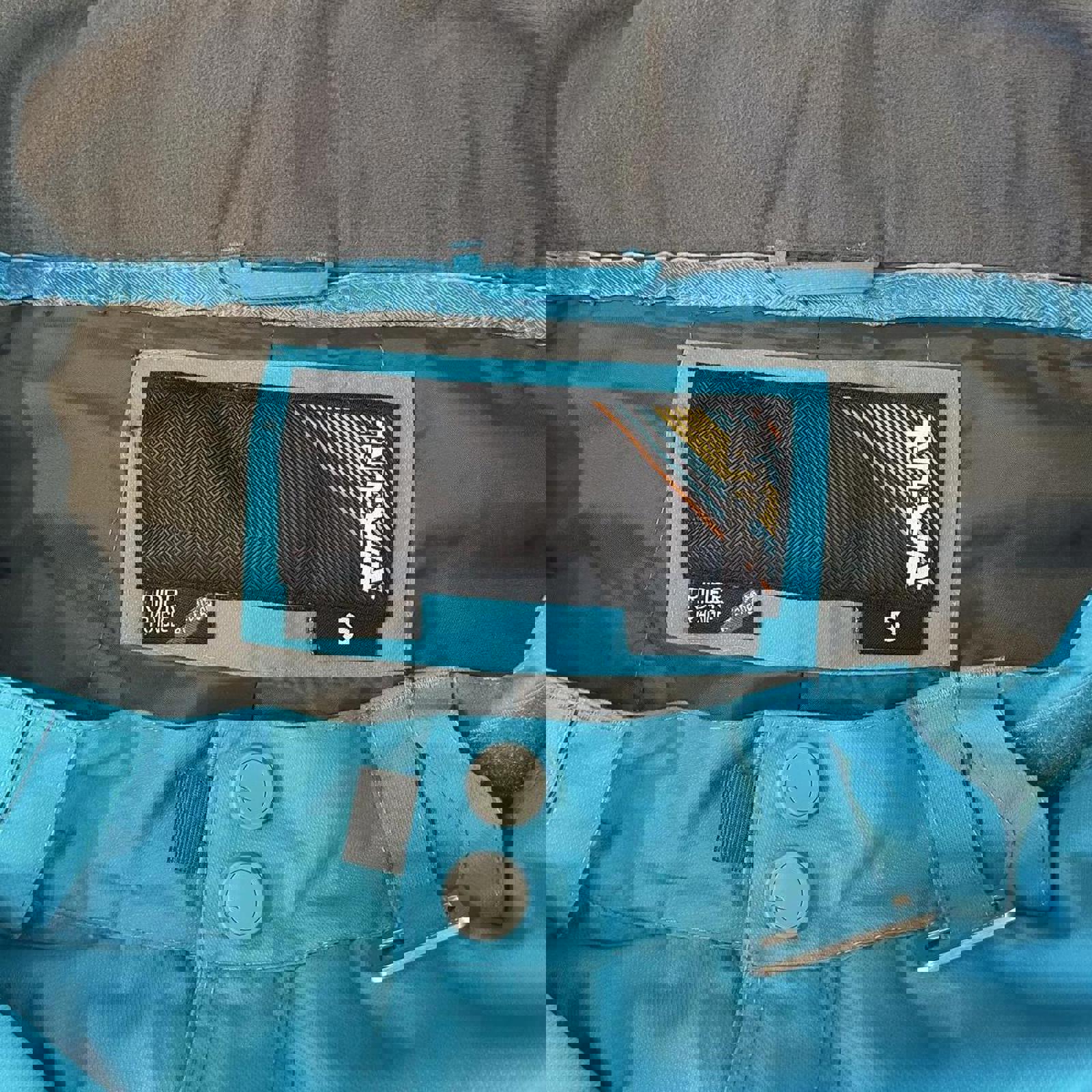 blue ripcurl snow ski pants with a chrome key clip, detailed buttons, adjustable at the waist and blue embroidered logo on the thigh
