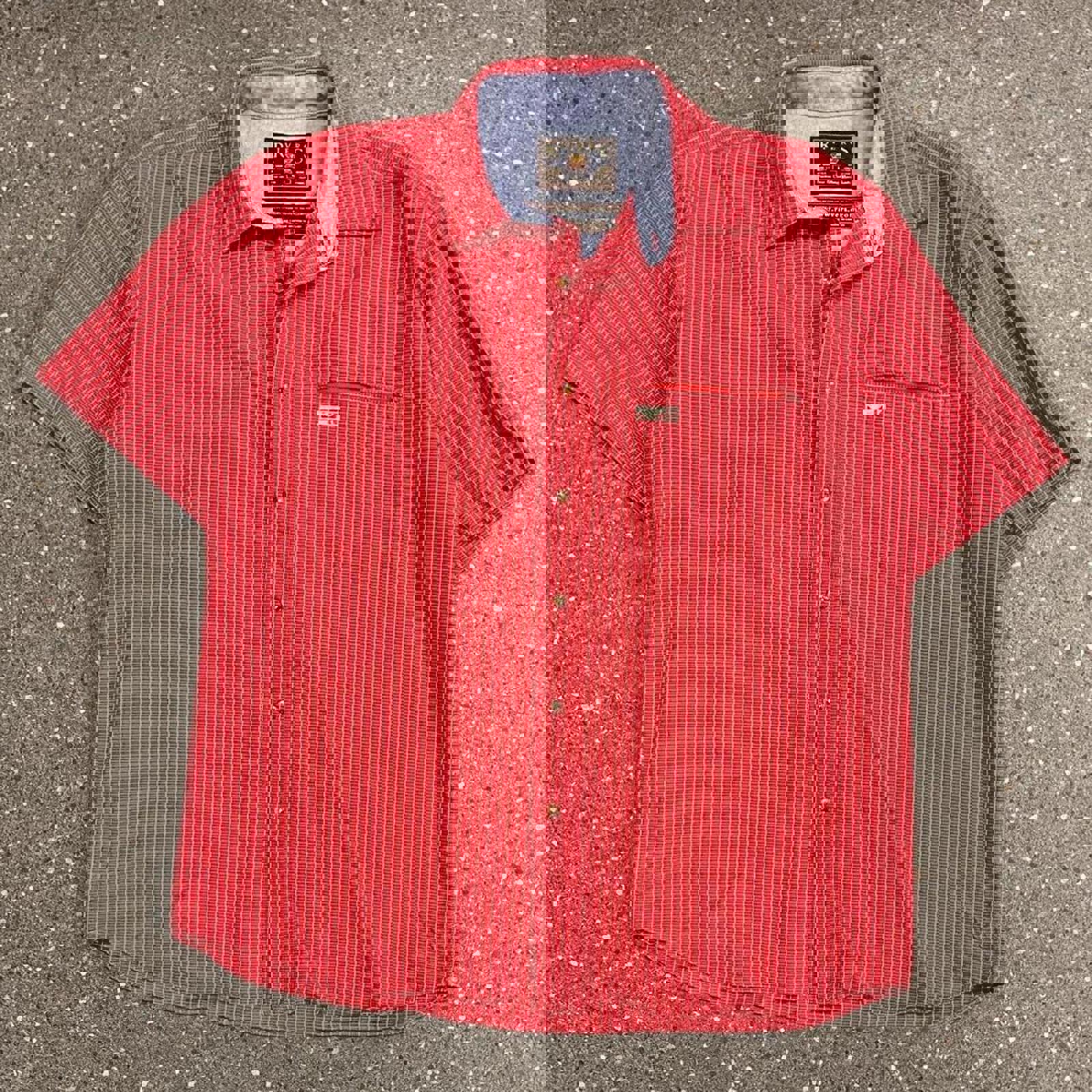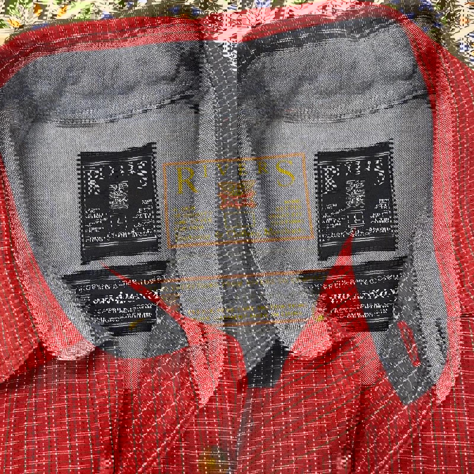 red, black and white checkered short sleeved button up shirt with an embroidered rivers eagle on the chest pocket