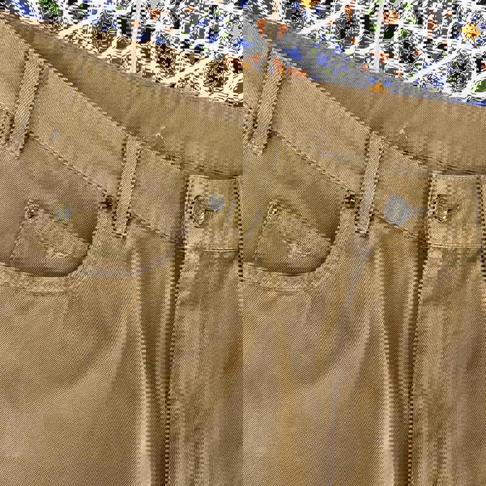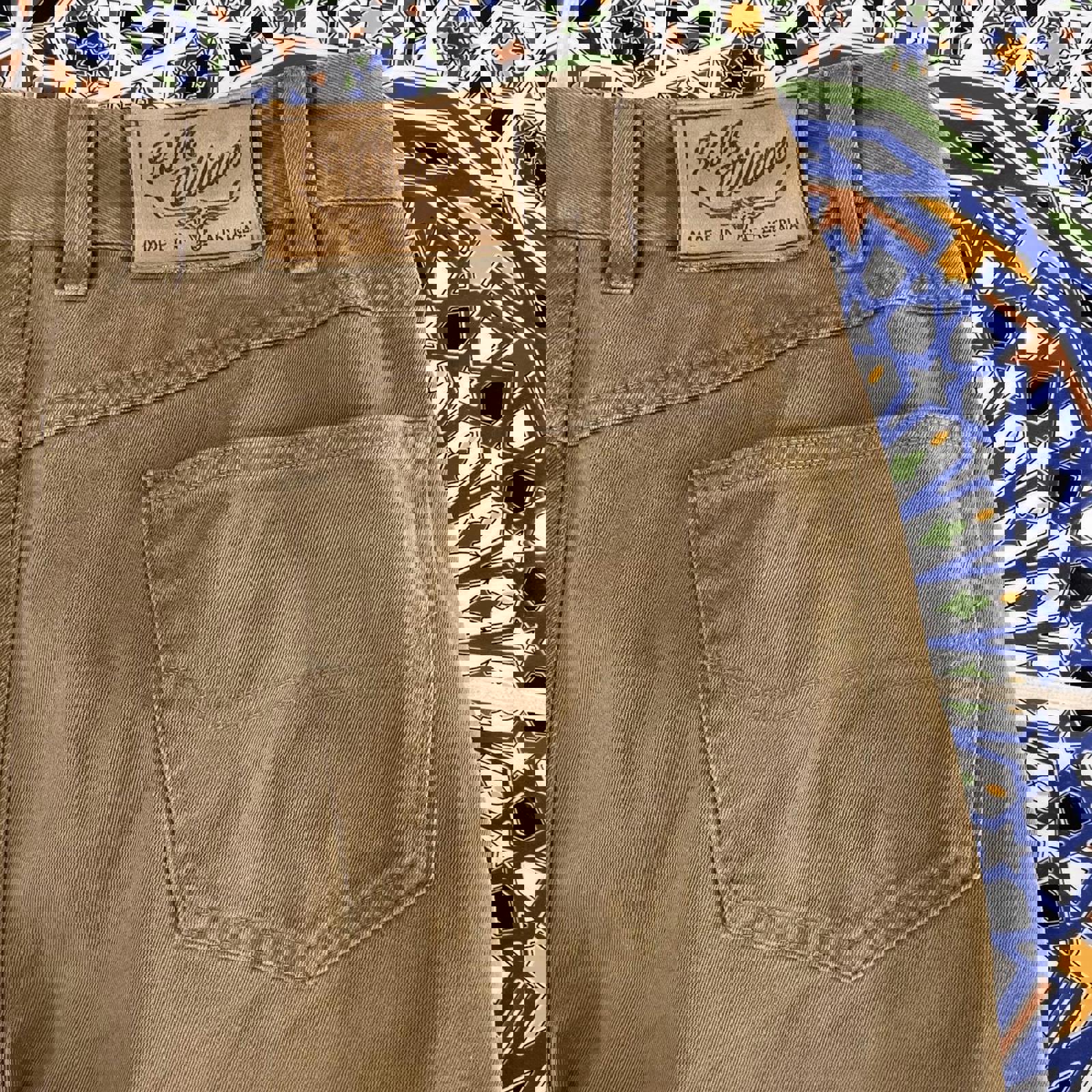 brown RM Williams trousers with a detailed button, embroidered bull on the coin pocket and a tan patch on the back hip