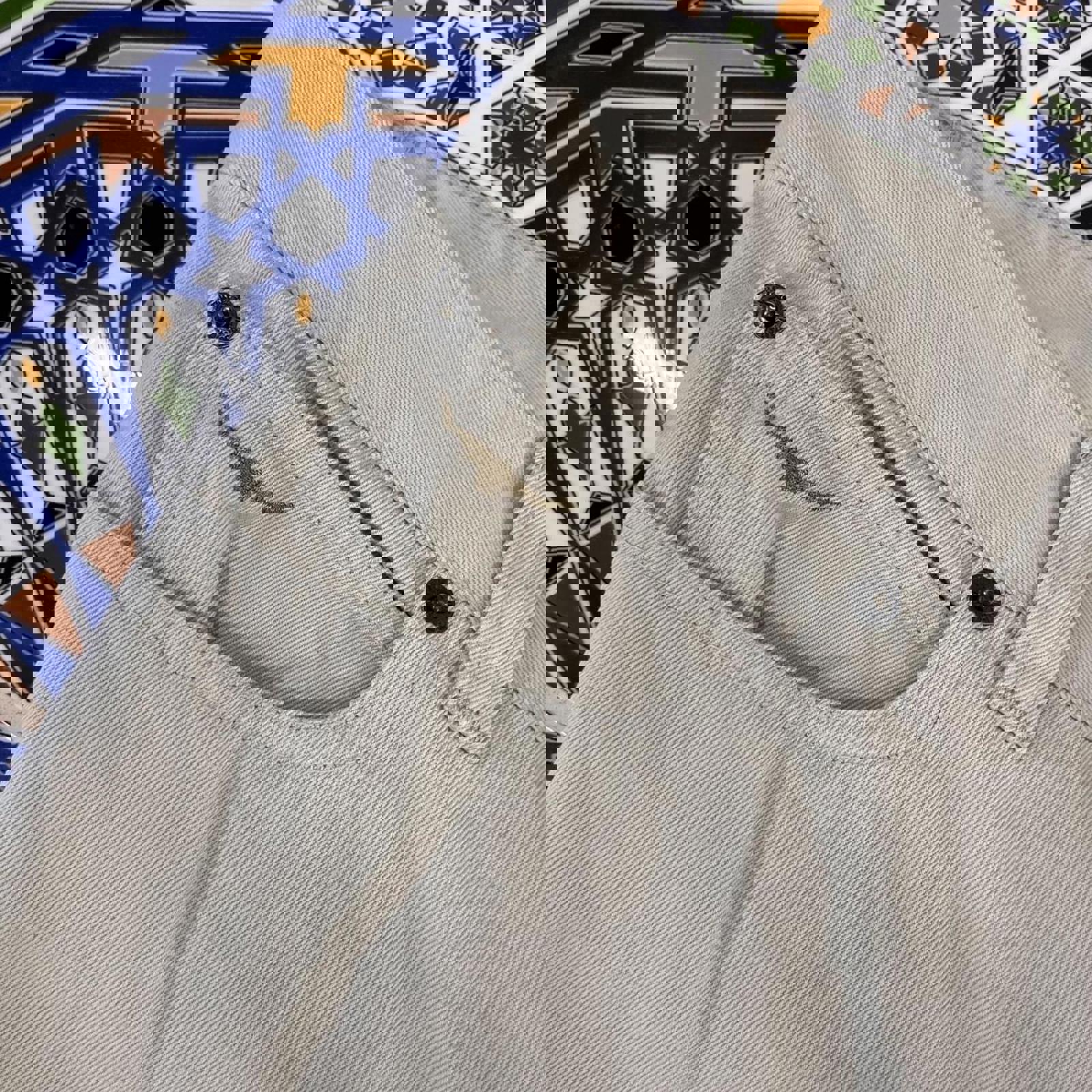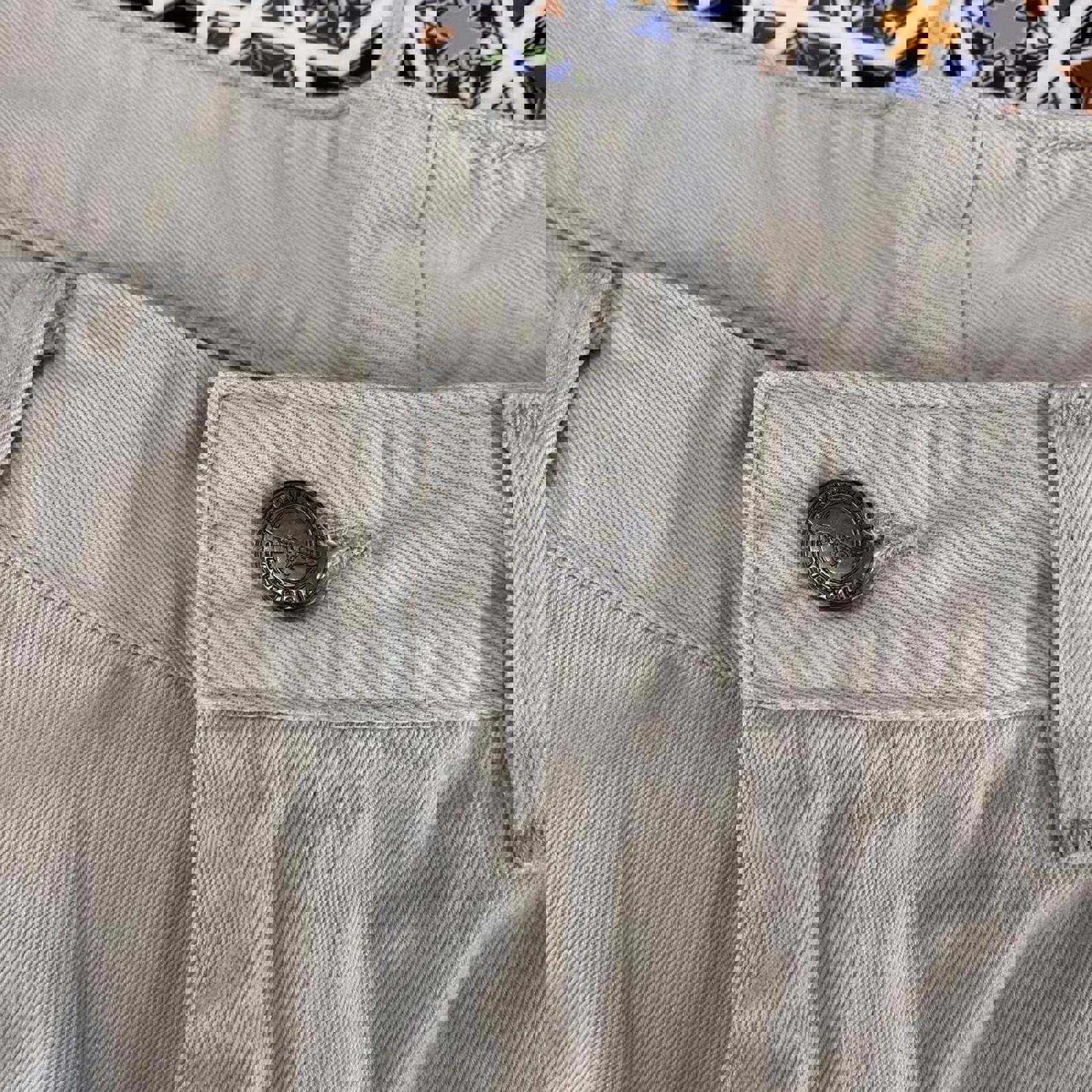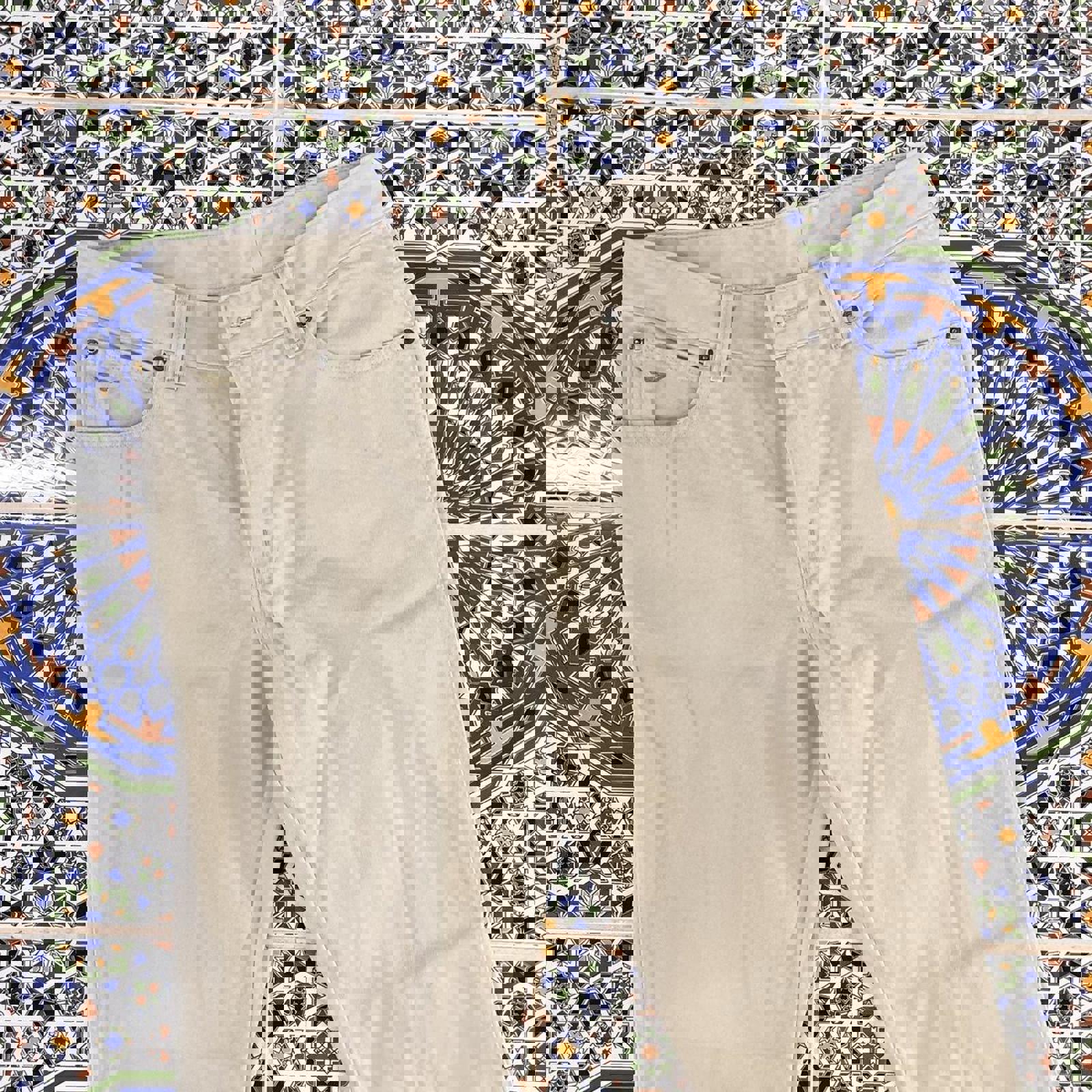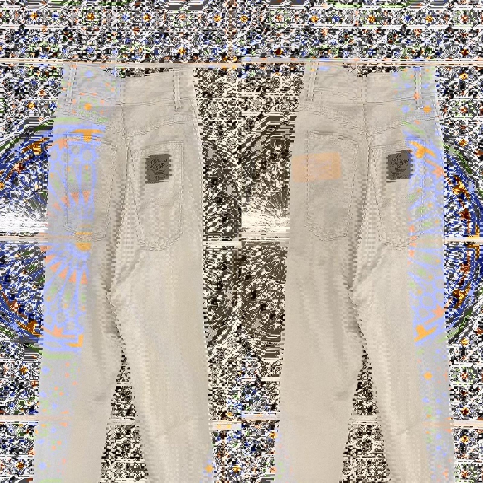 cream RM Williams trousers with a brown embroidered bull on the coin pocket and a tan patch on the back bum pocket