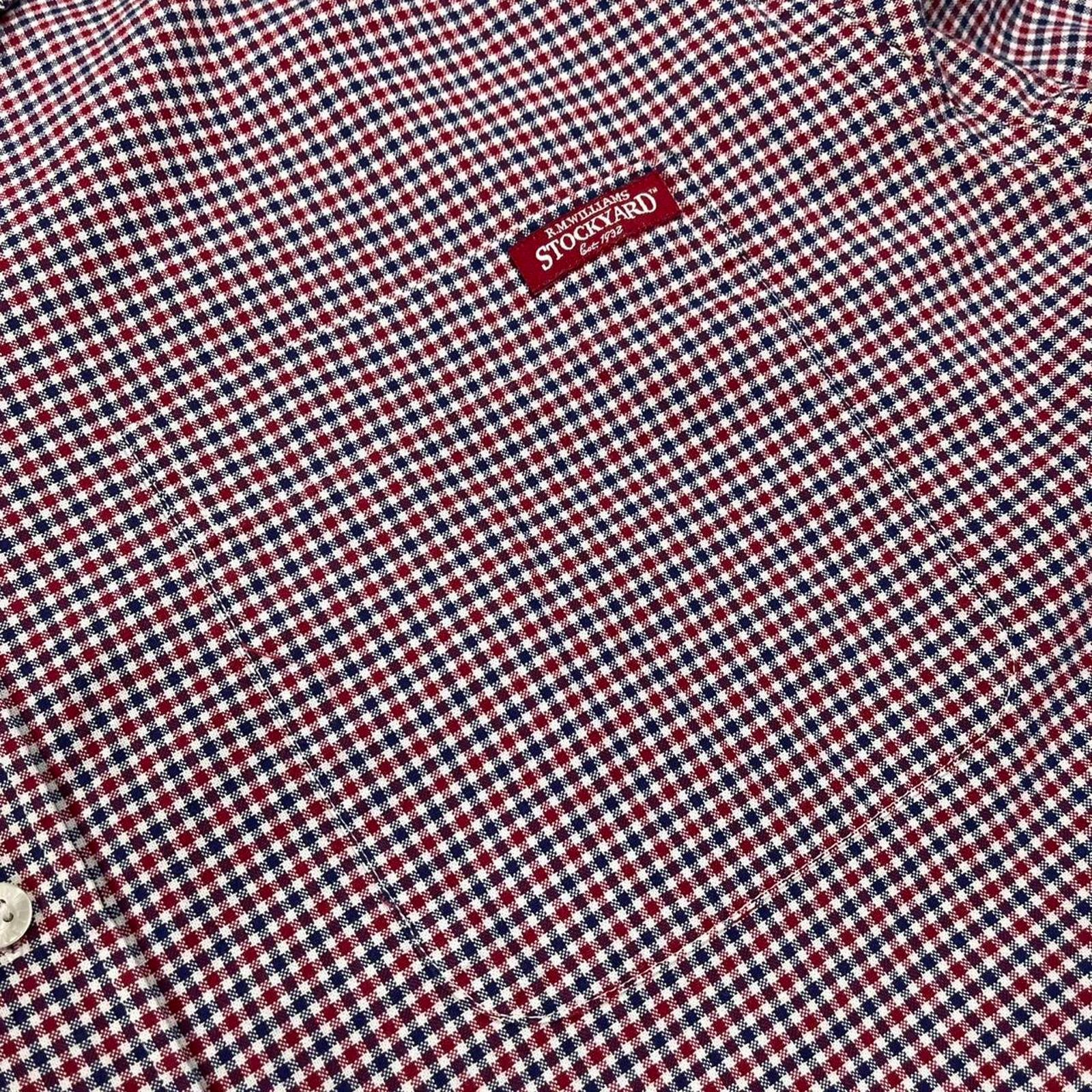 Red white and navy checkered RM Williams long sleeve button up stockyard shirt with a red patch on the chest pocket