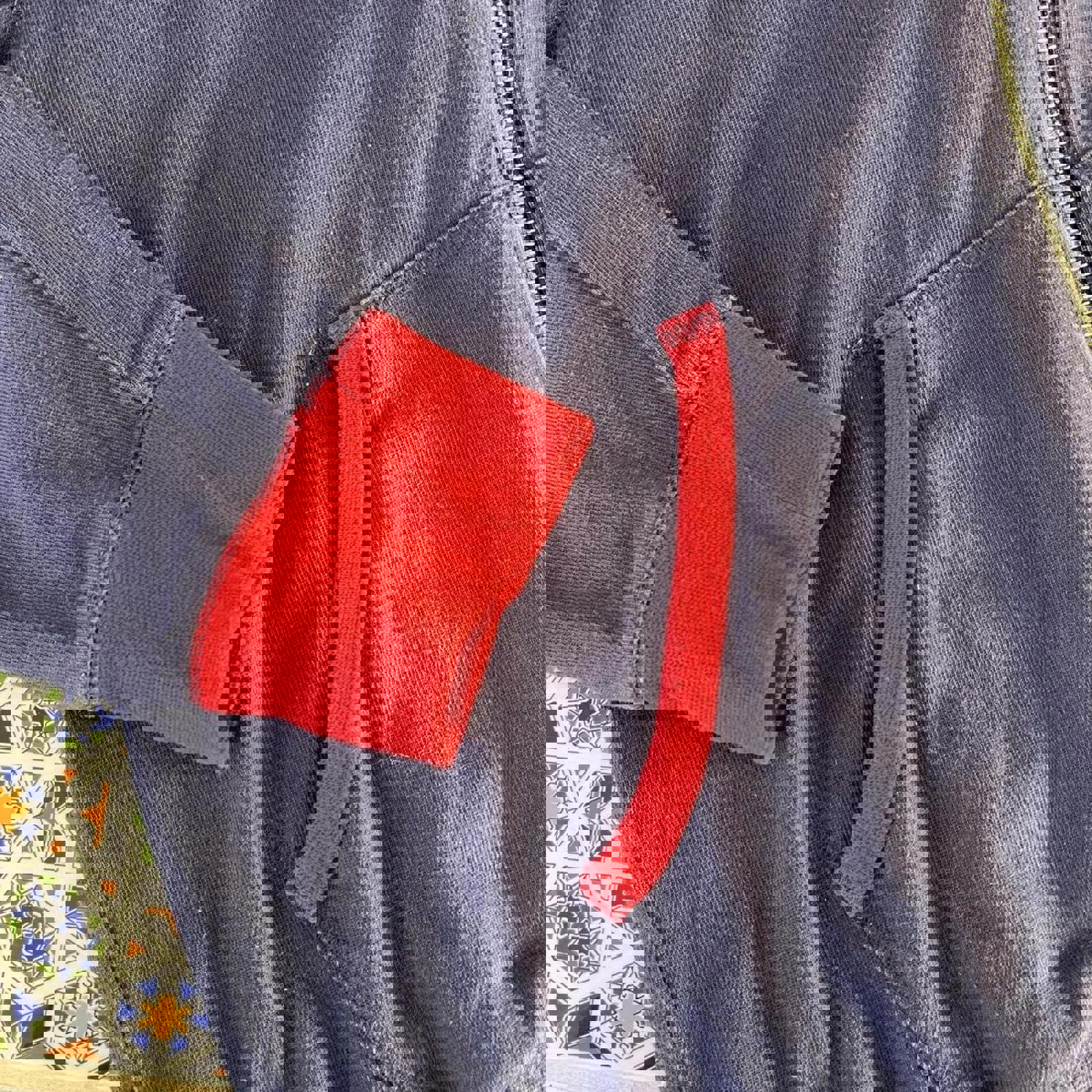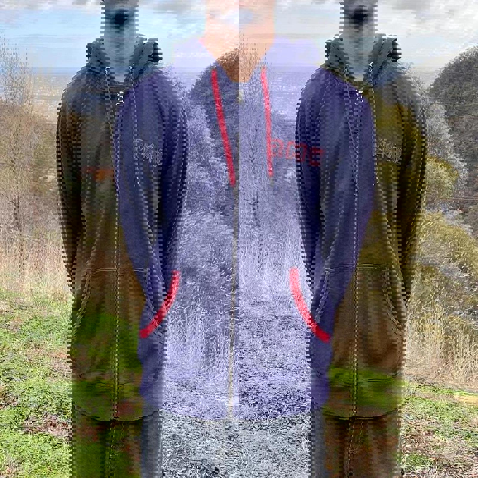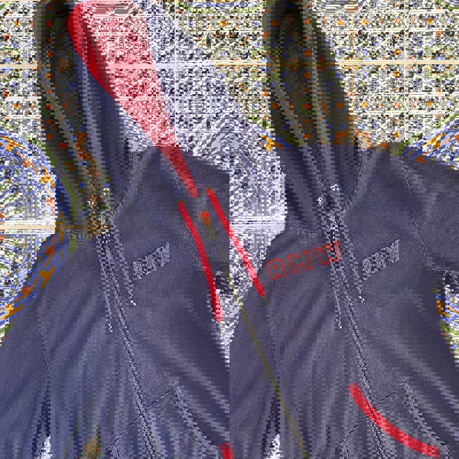 Navy and red RM Williams zip up hoodie with RMW patched on the front