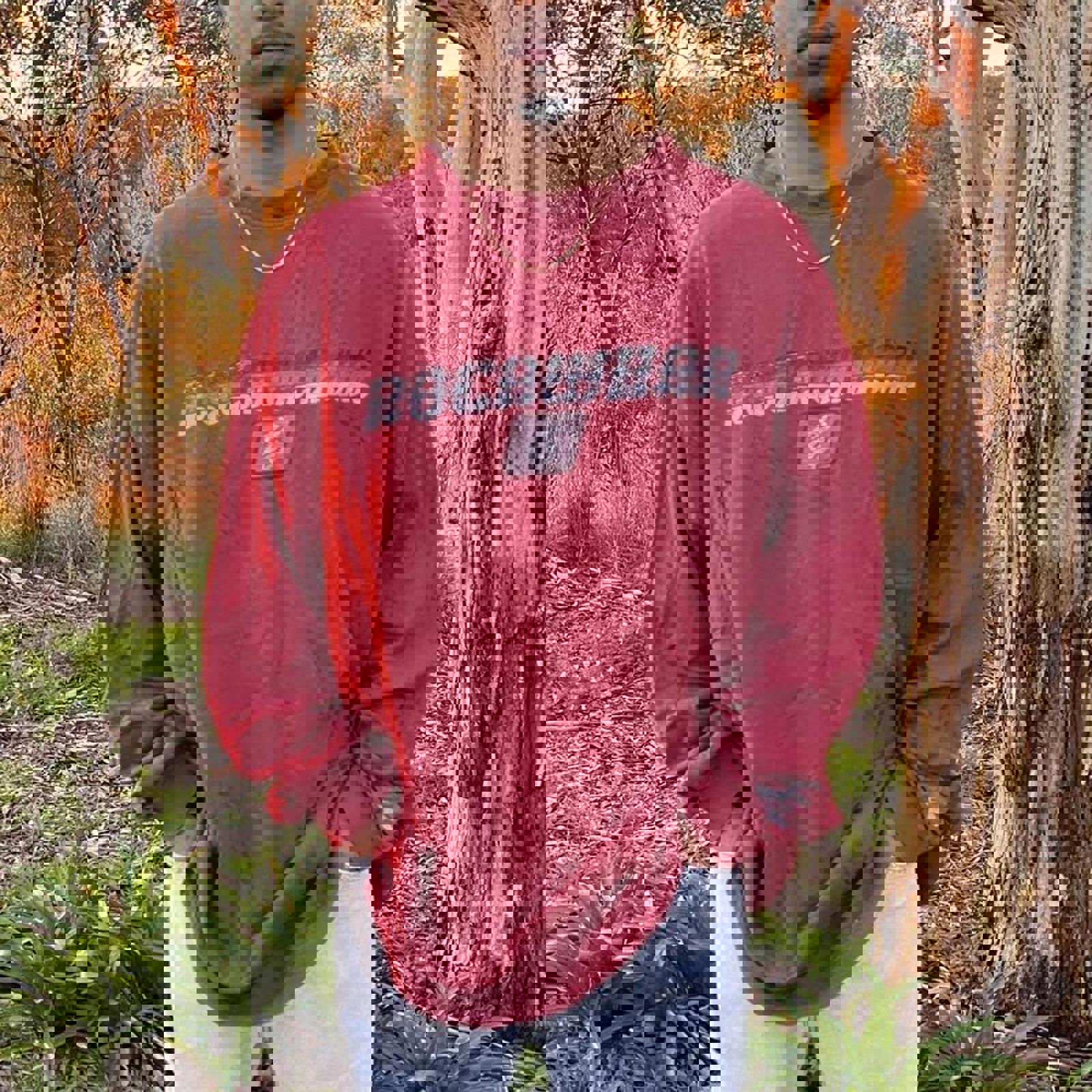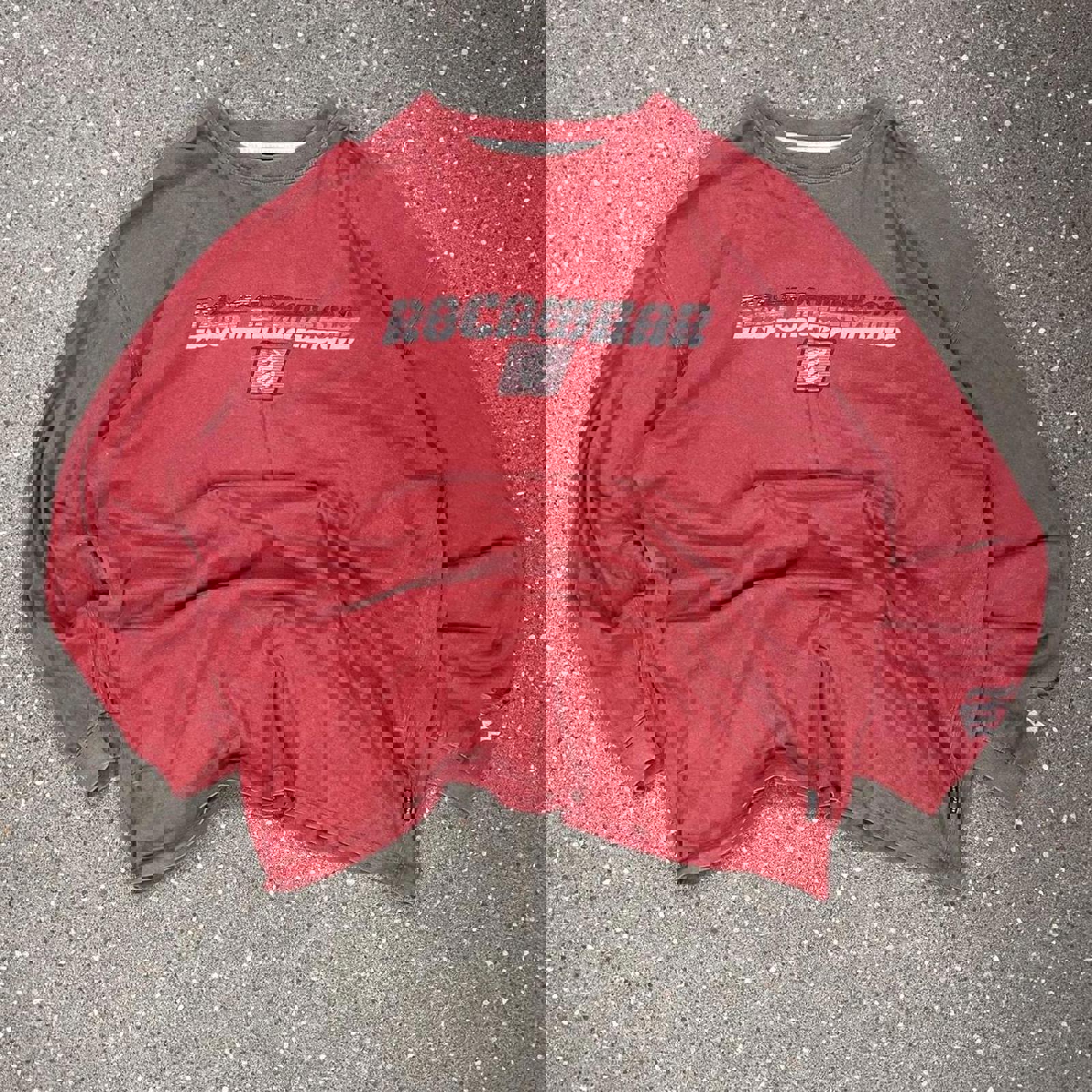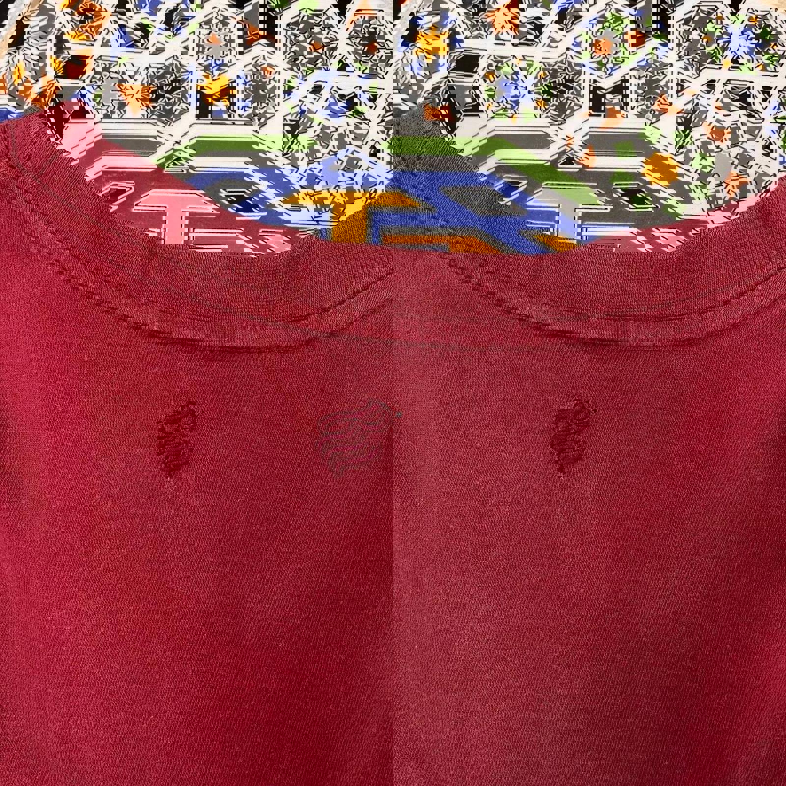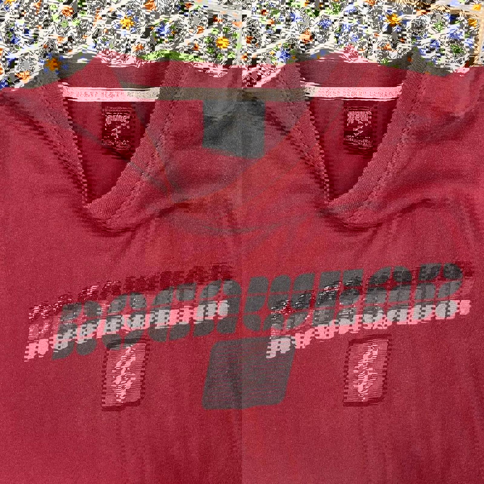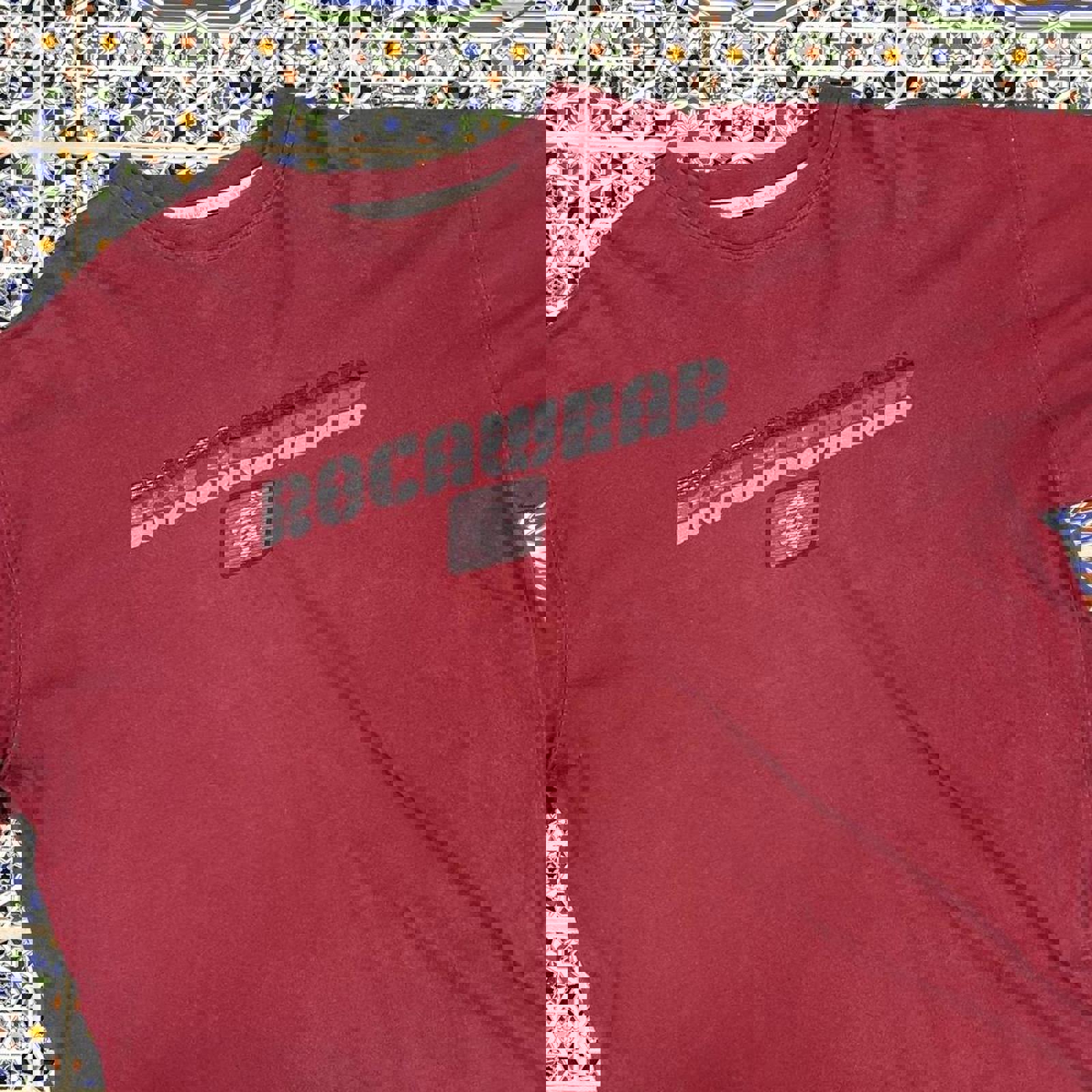 Maroon rocawear long sleeve tshirt with black and grey printed logos on the sleeve and chest, embroidered logo on the back and a tab on the hip
