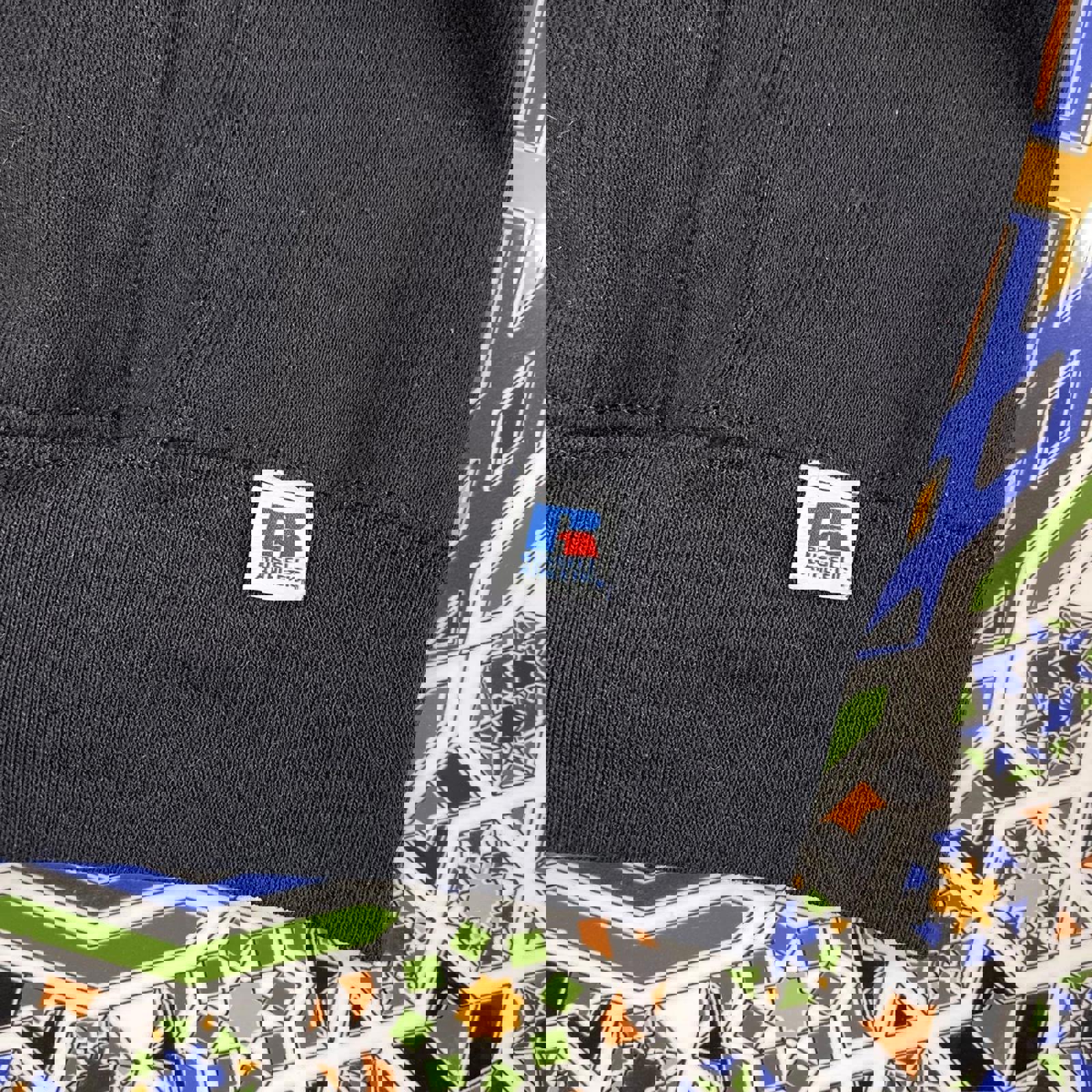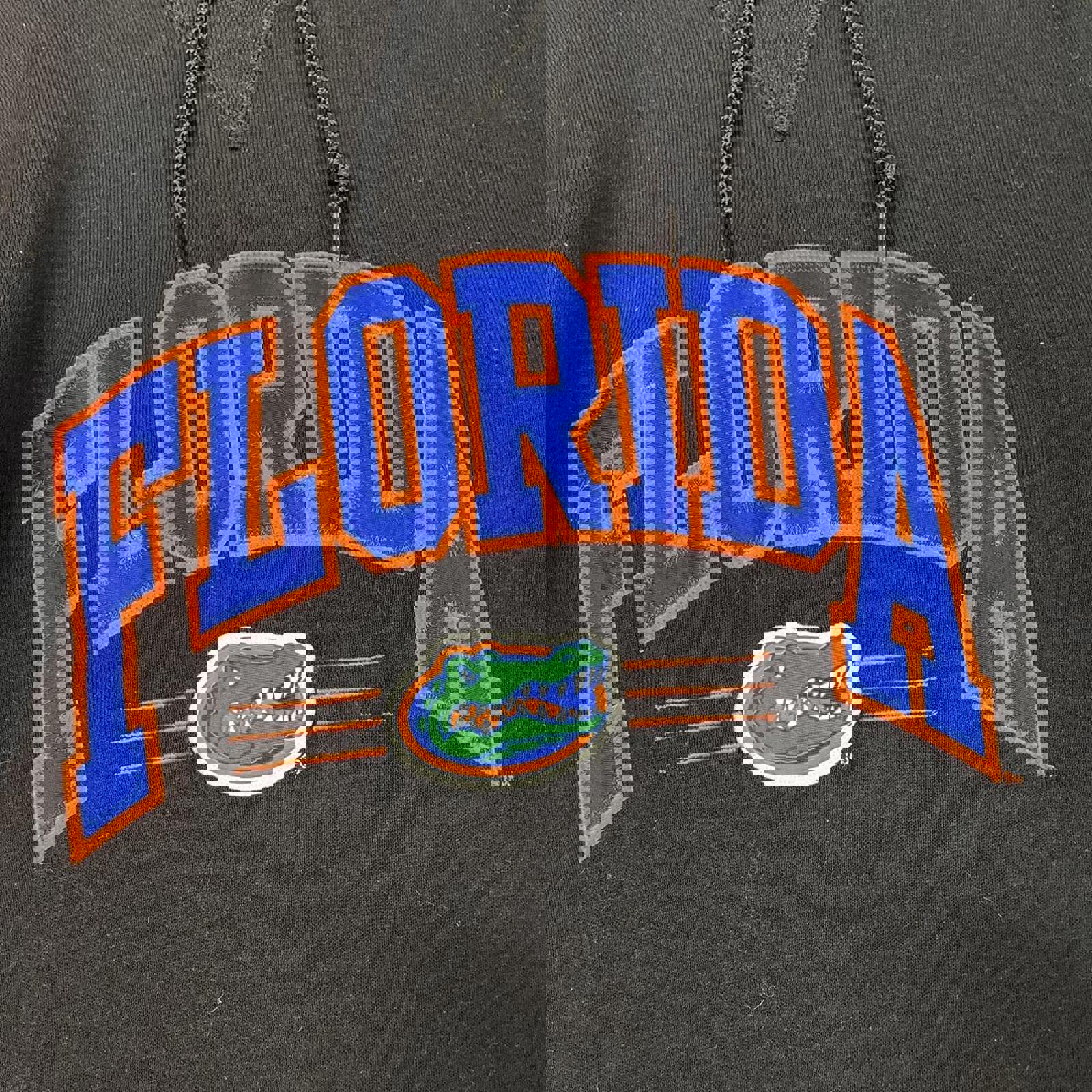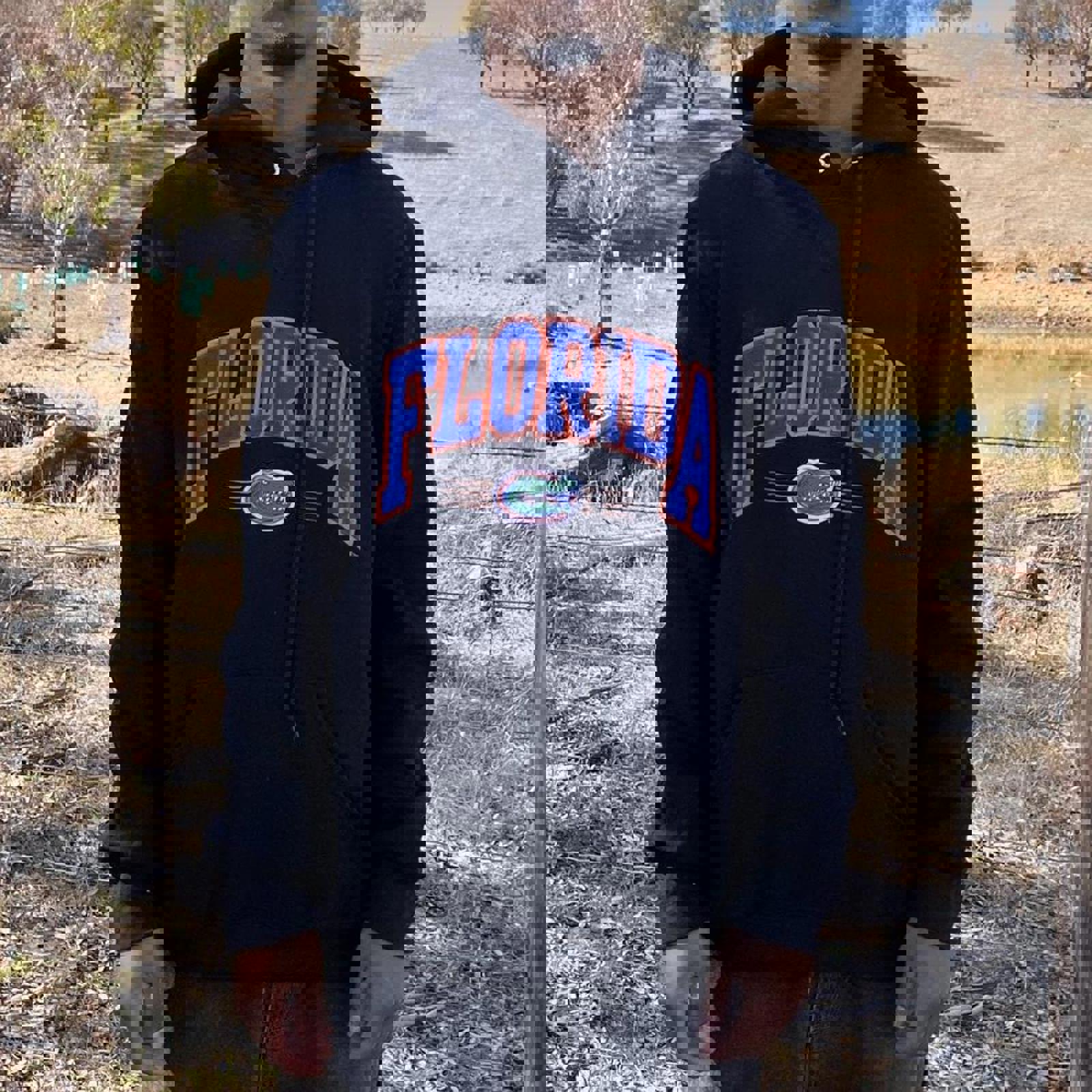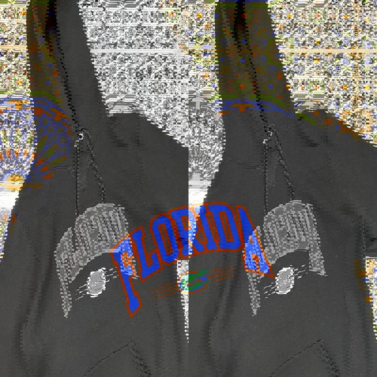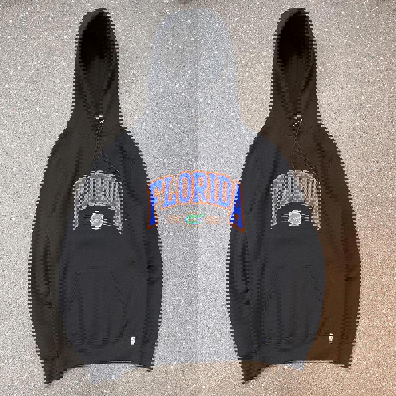 black russell athletic hoodie with blue, orange and green florida gators embroidered graphic on the front and a white Russell athletic tab on the hip