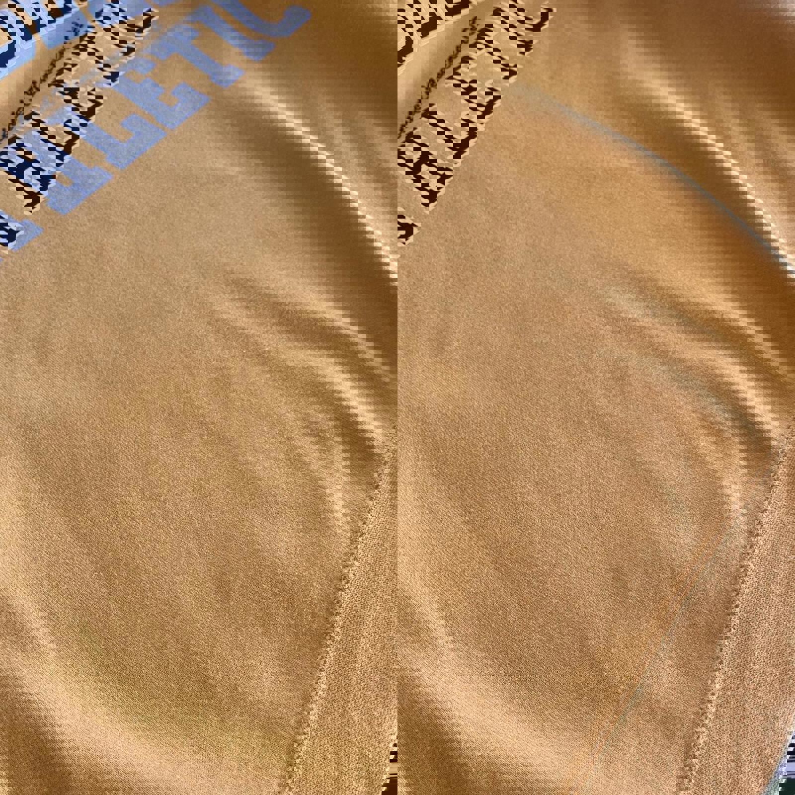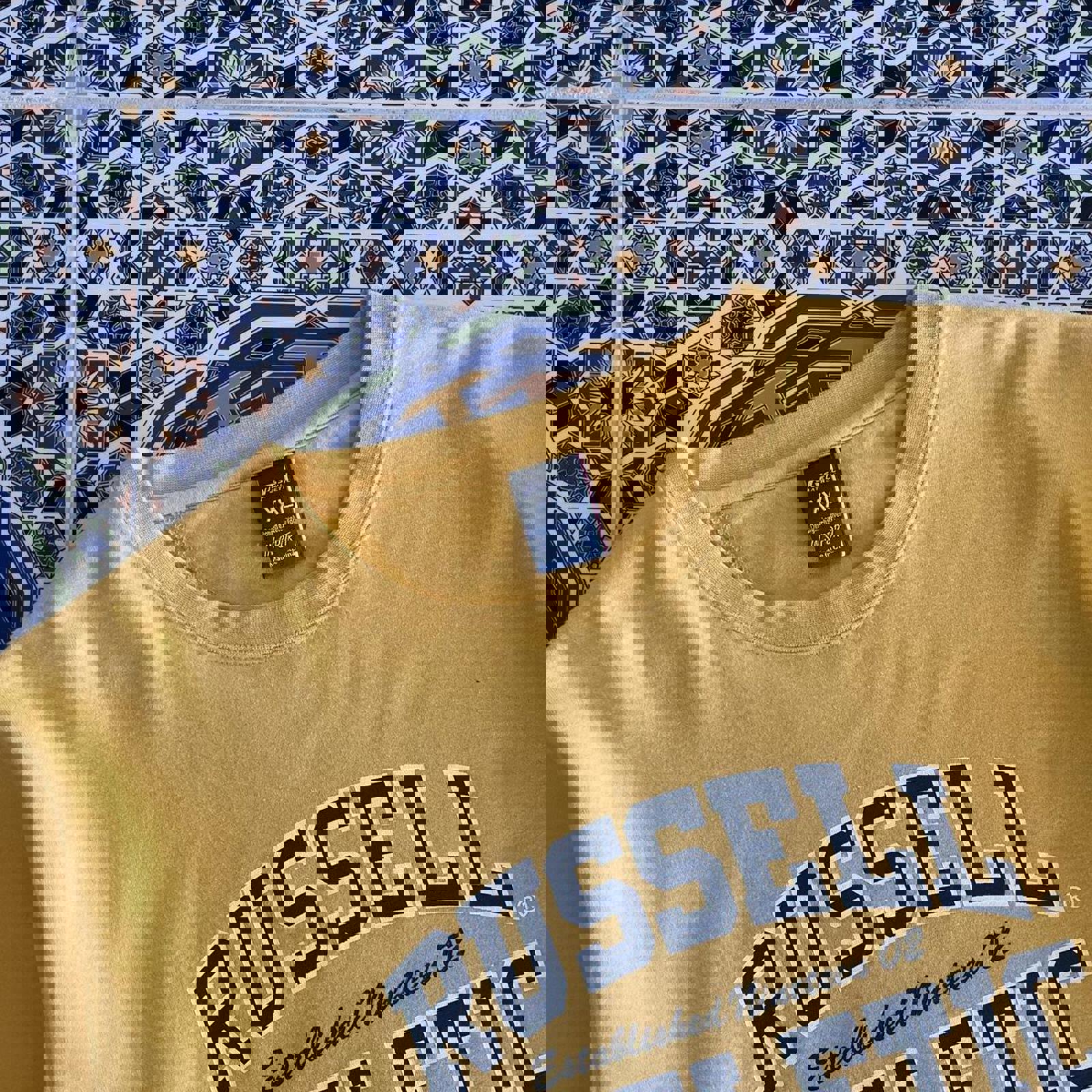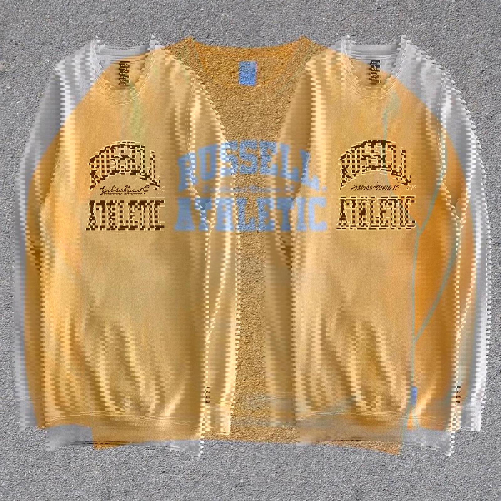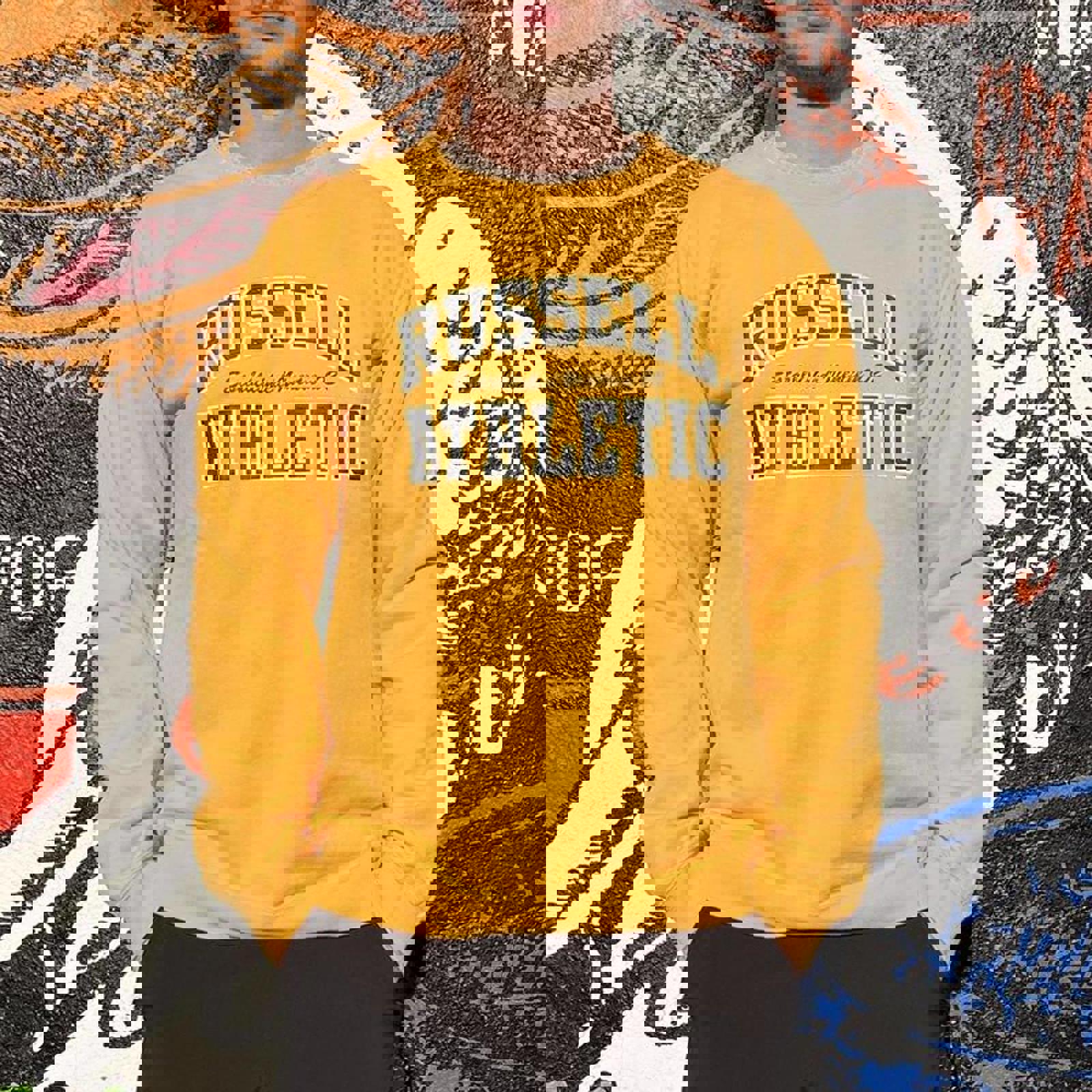 yellow russell athletic sweatshirt with navy and white college style branded graphic on the front