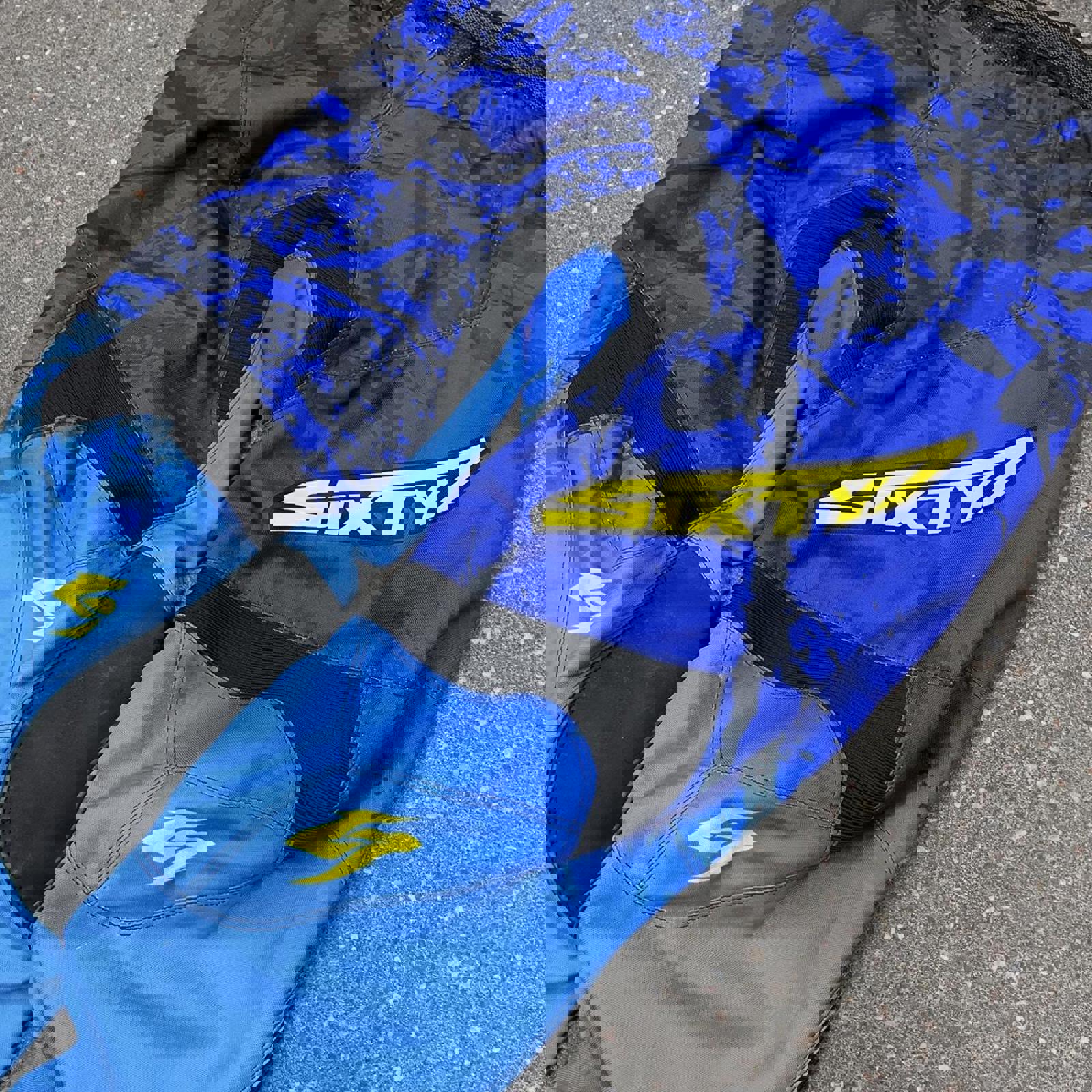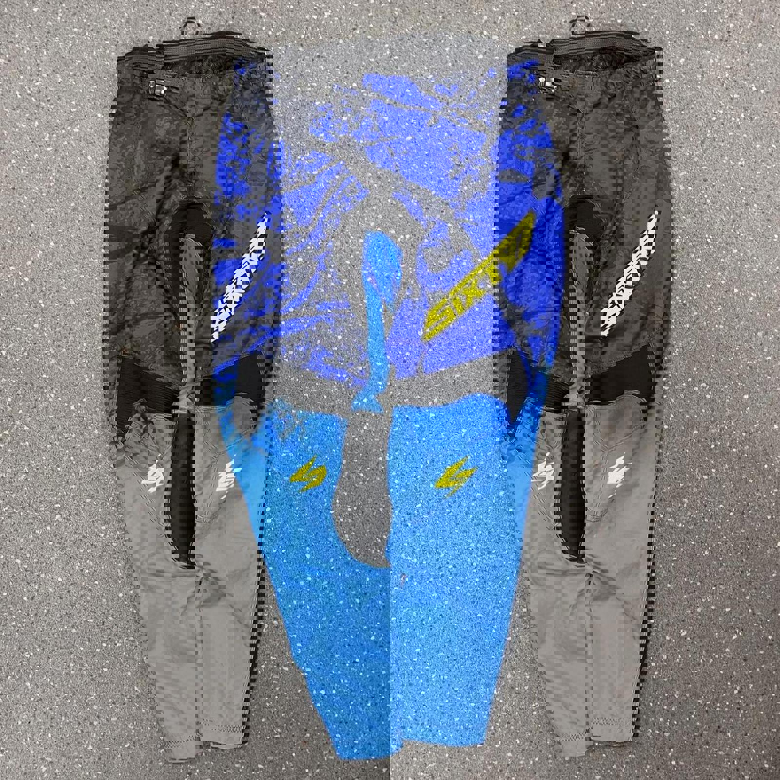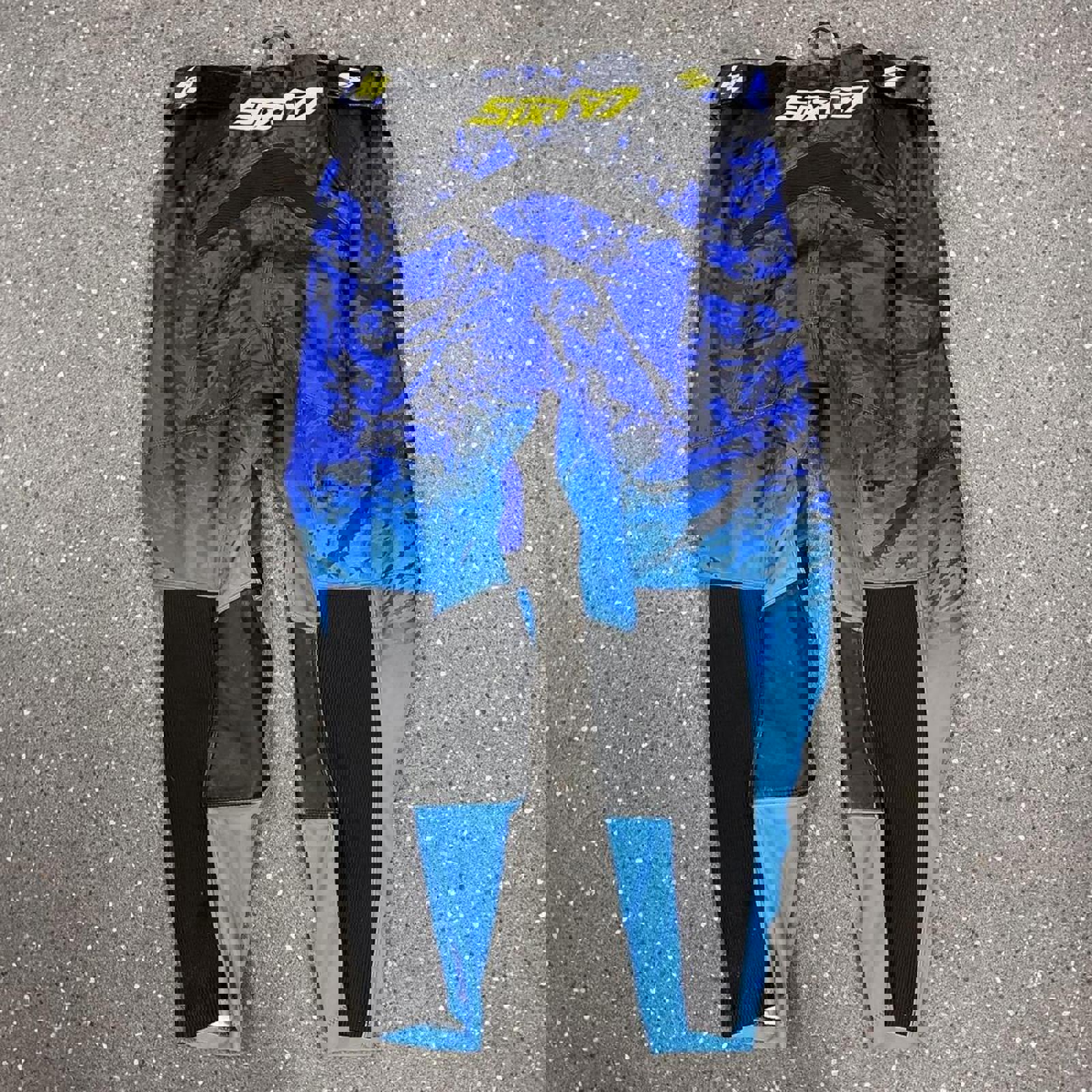 Blue and black sixty moto-x pants with yellow sixty spell outs. Adjustable at waist No protection included