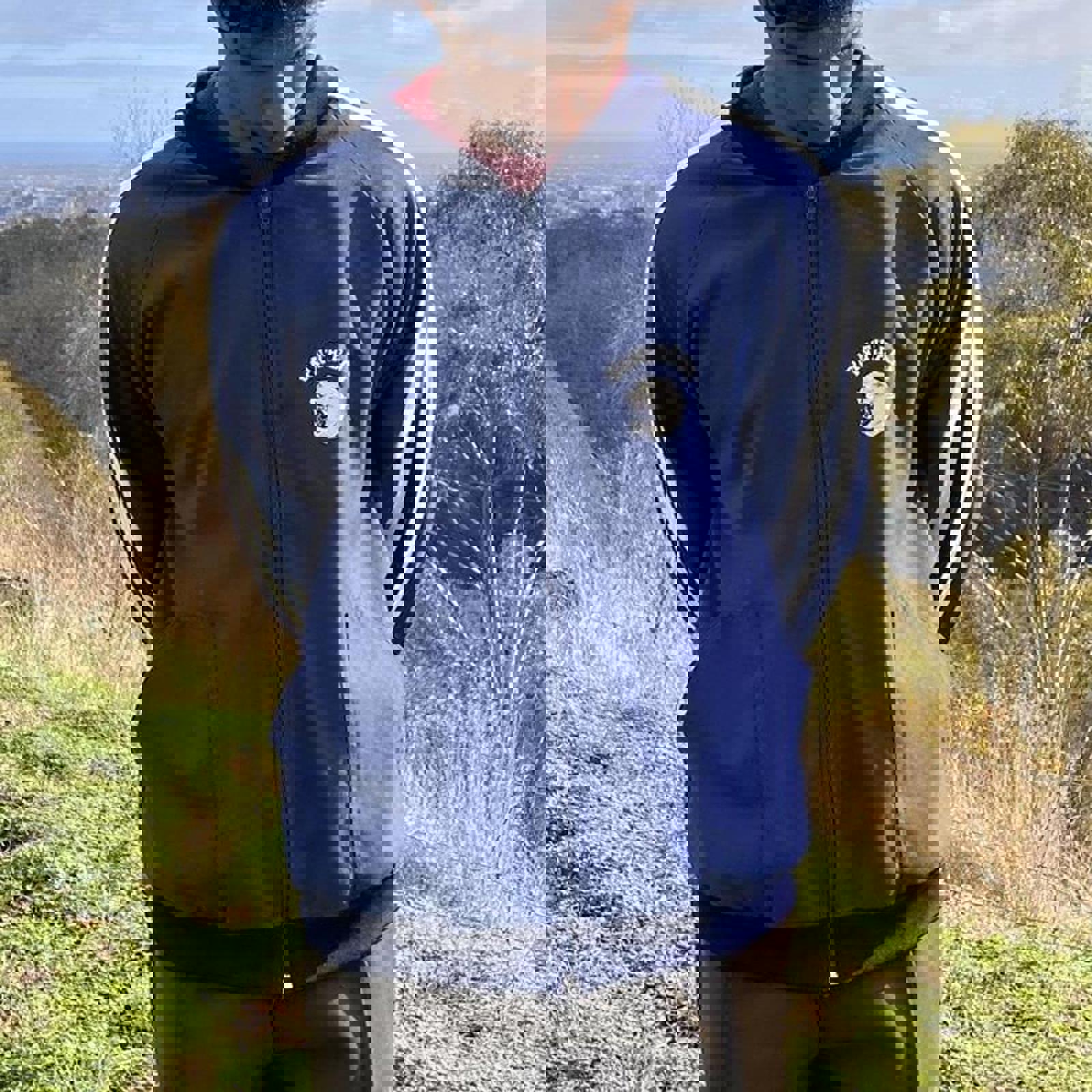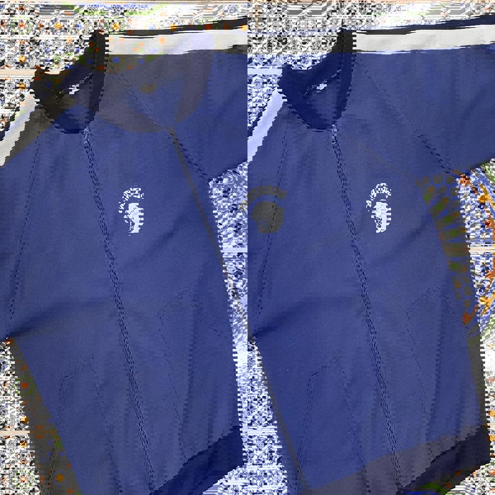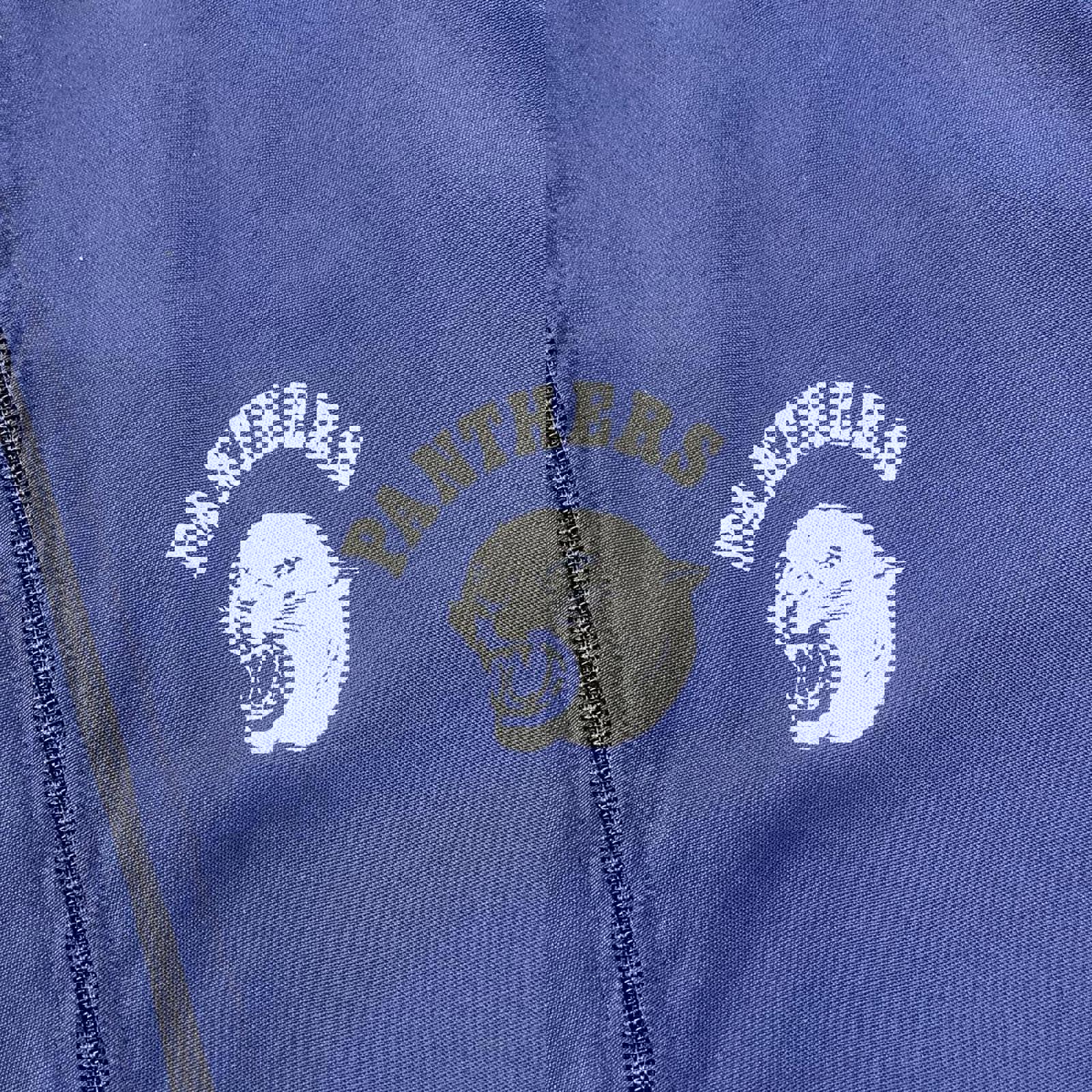 navy and white vintage panthers jacket with a printed white panther on the chest