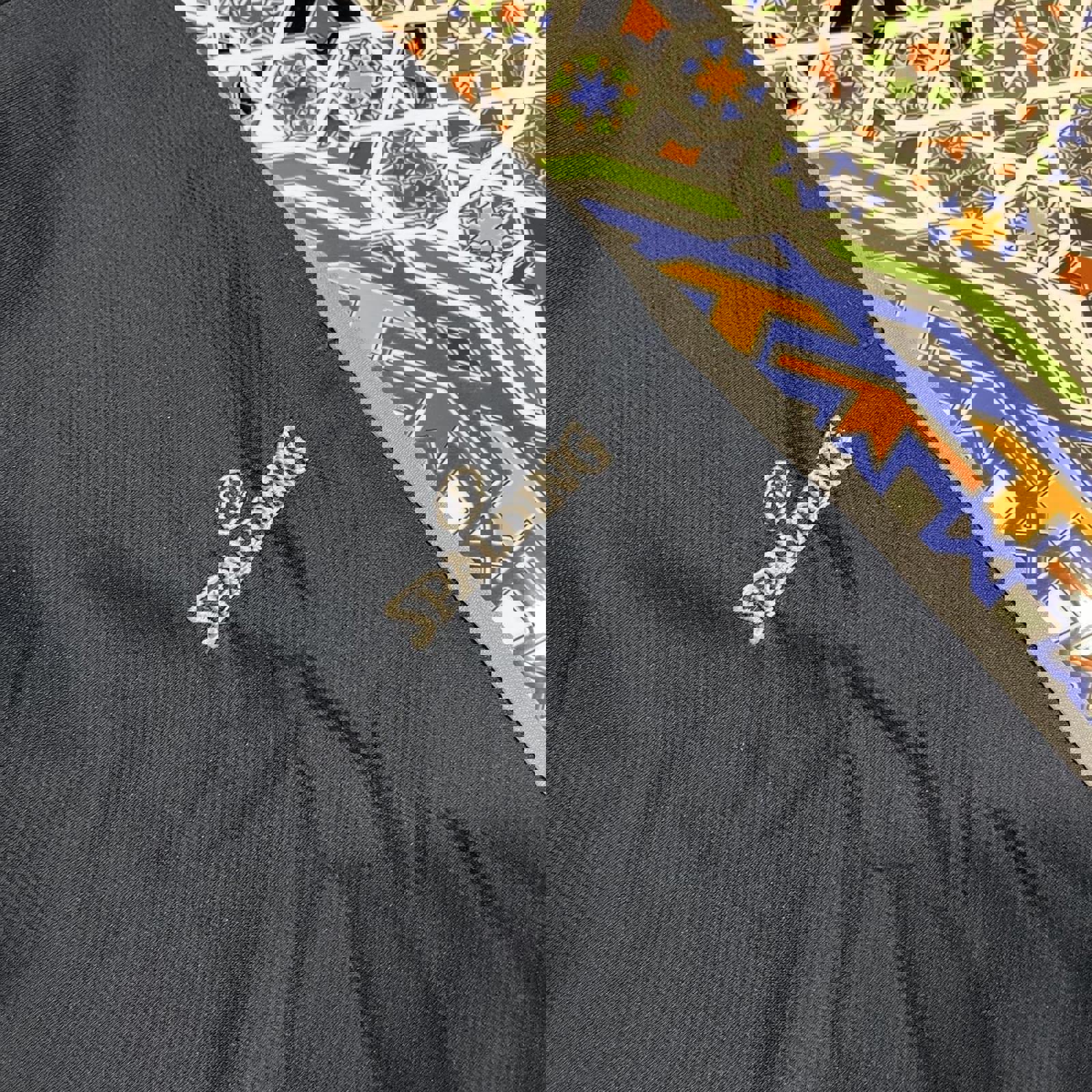 navy spalding sweatpants with a grey block down the leg, grey embroidered spalding on the leg and mesh interior