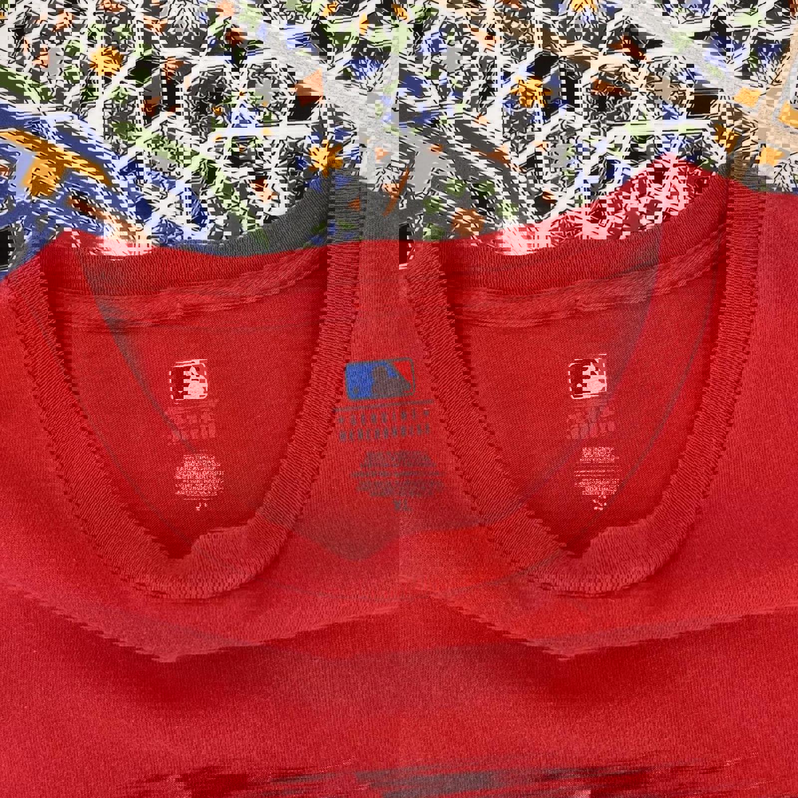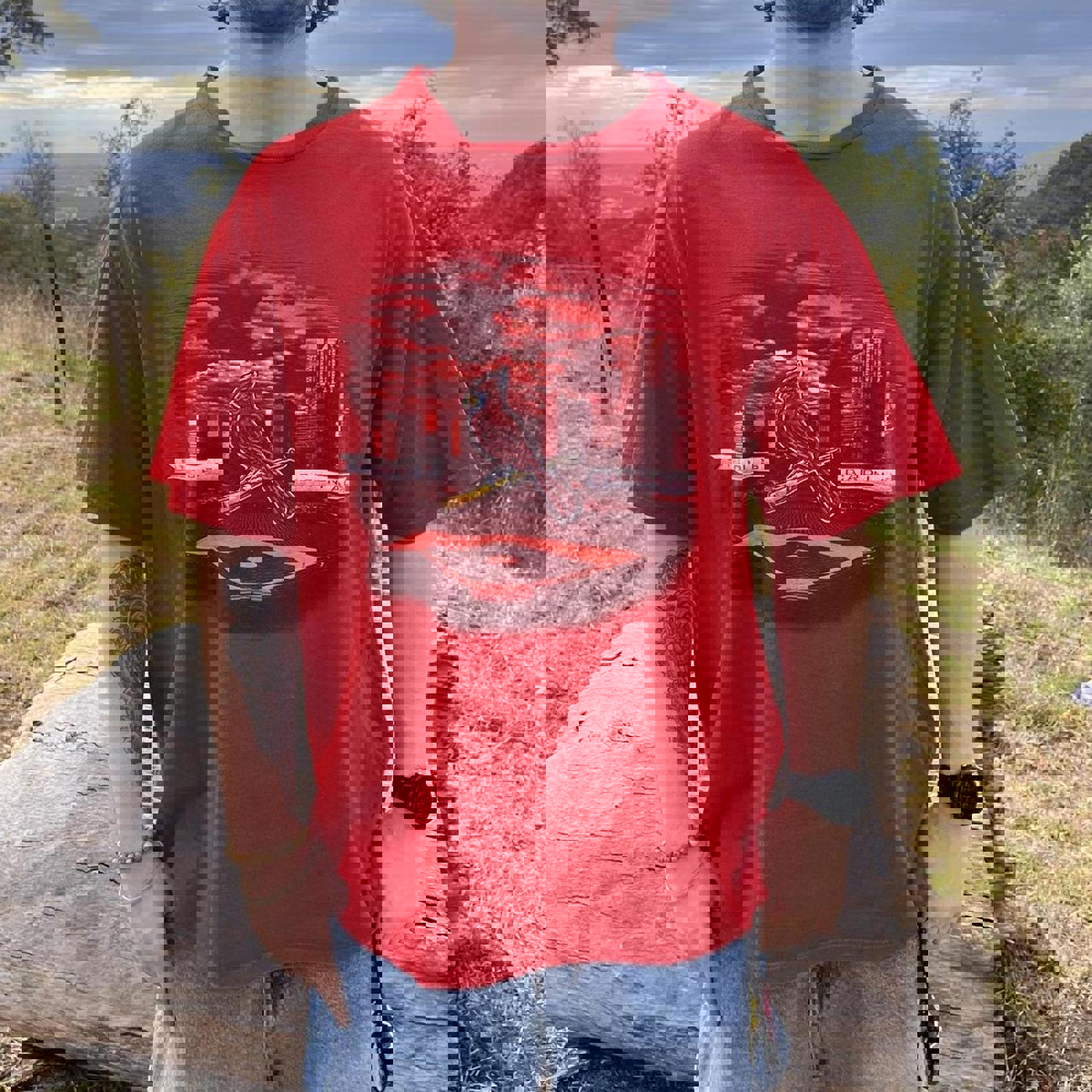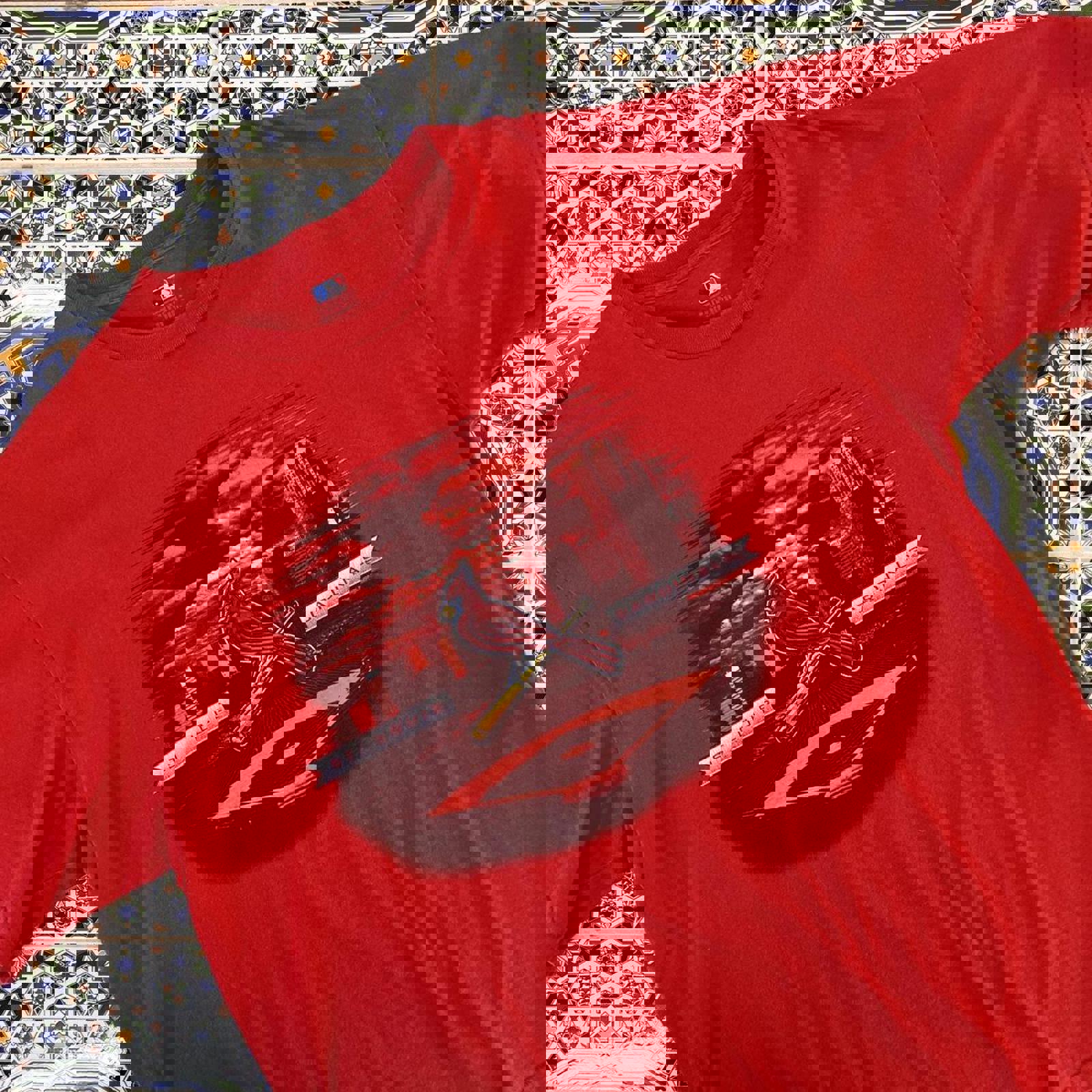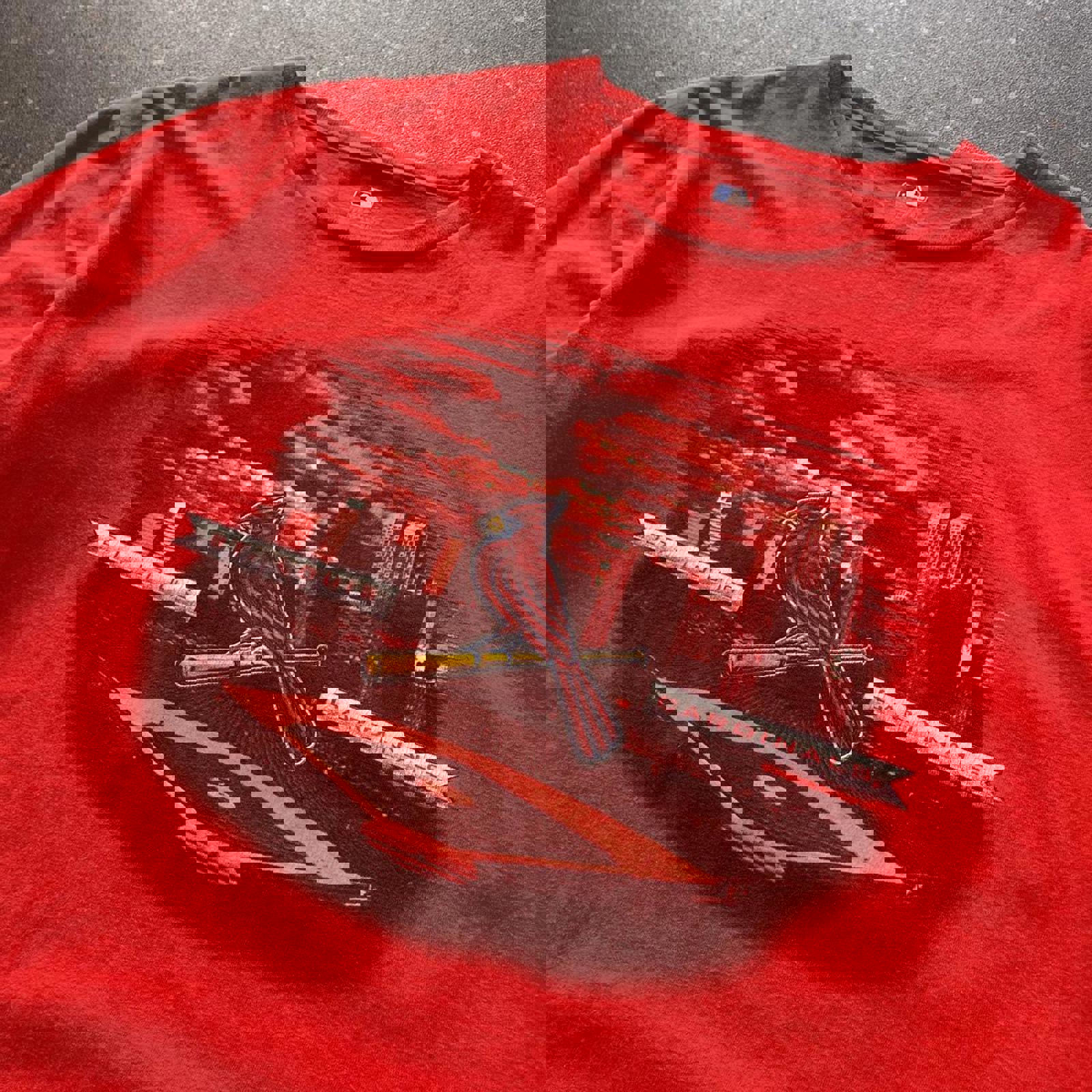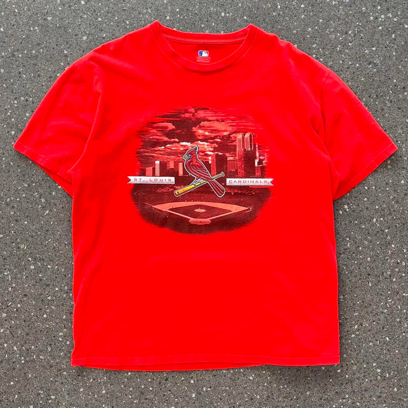 red shirt with a large skyline, baseball field, cardinal graphic on the front