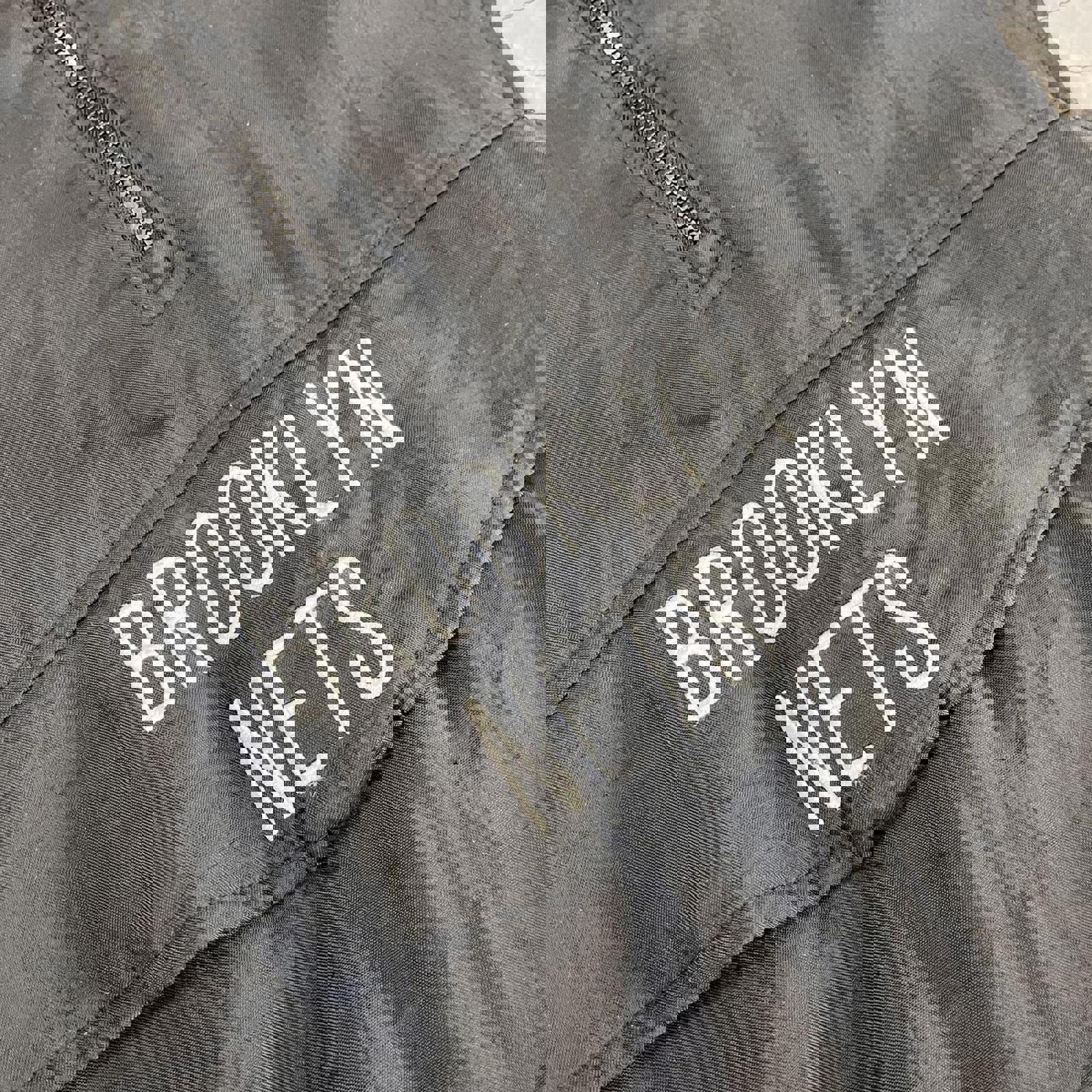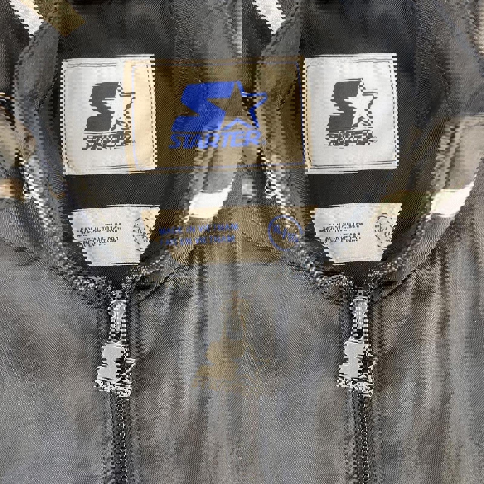 black and white starter jacket with a spell out on the belly and a large nets logo on the back