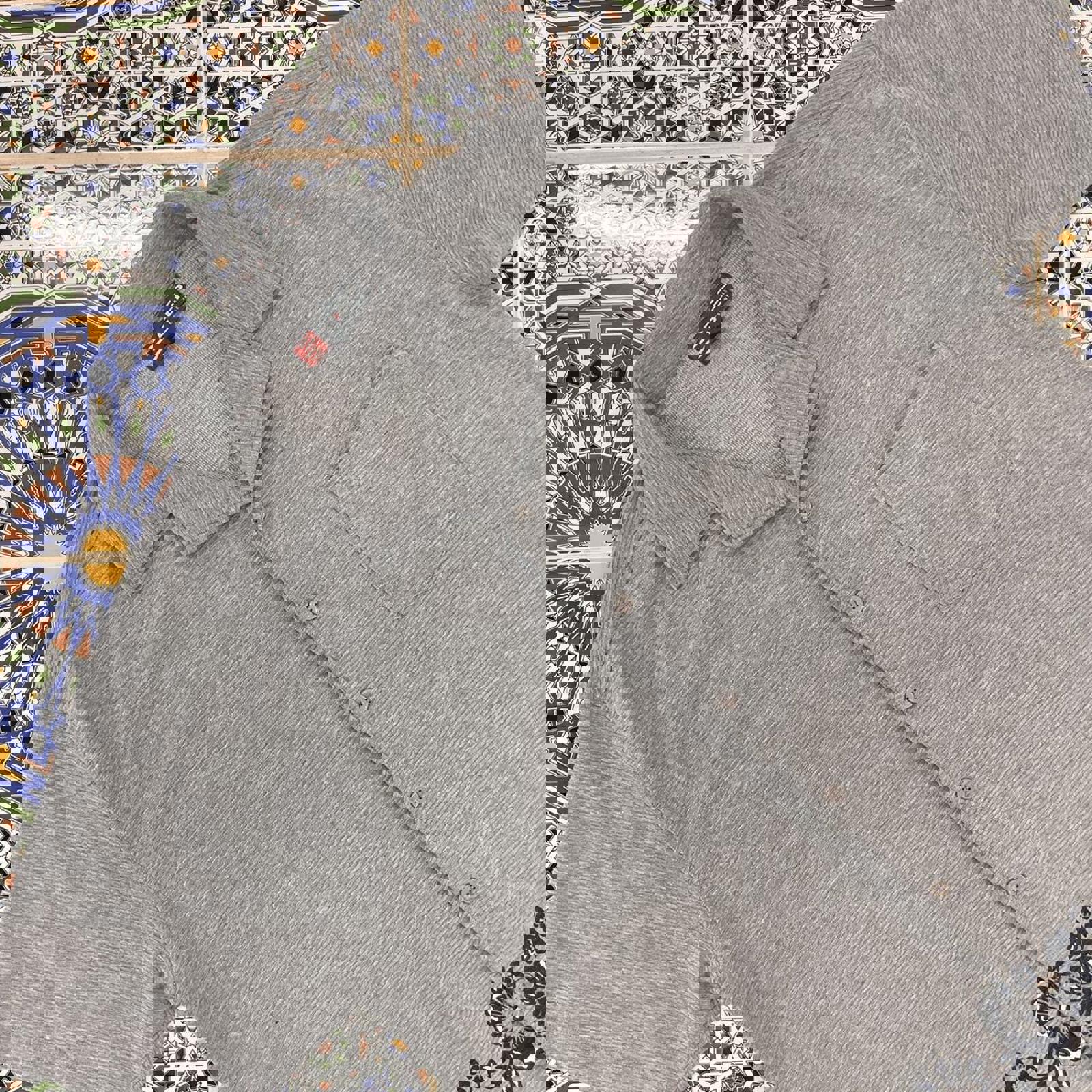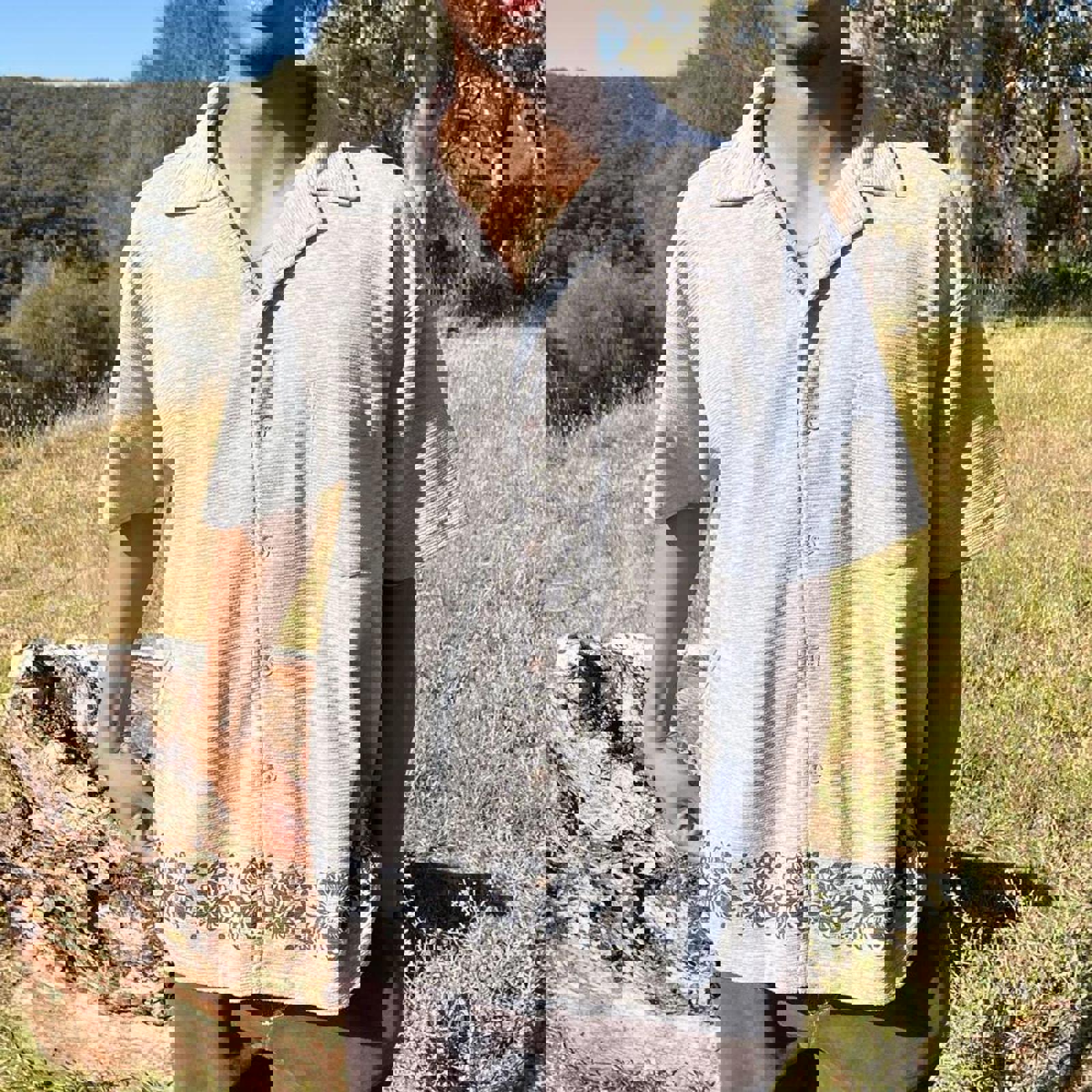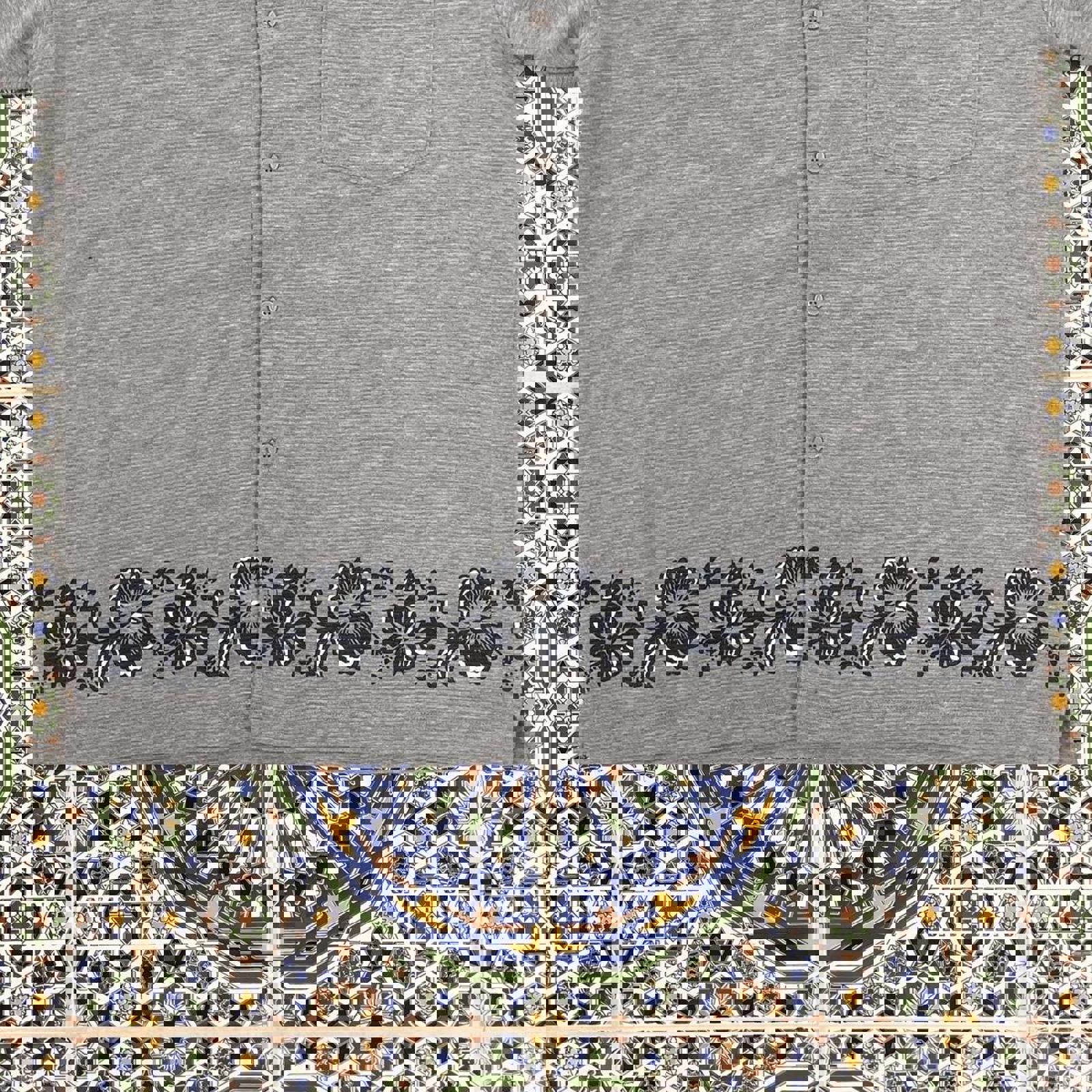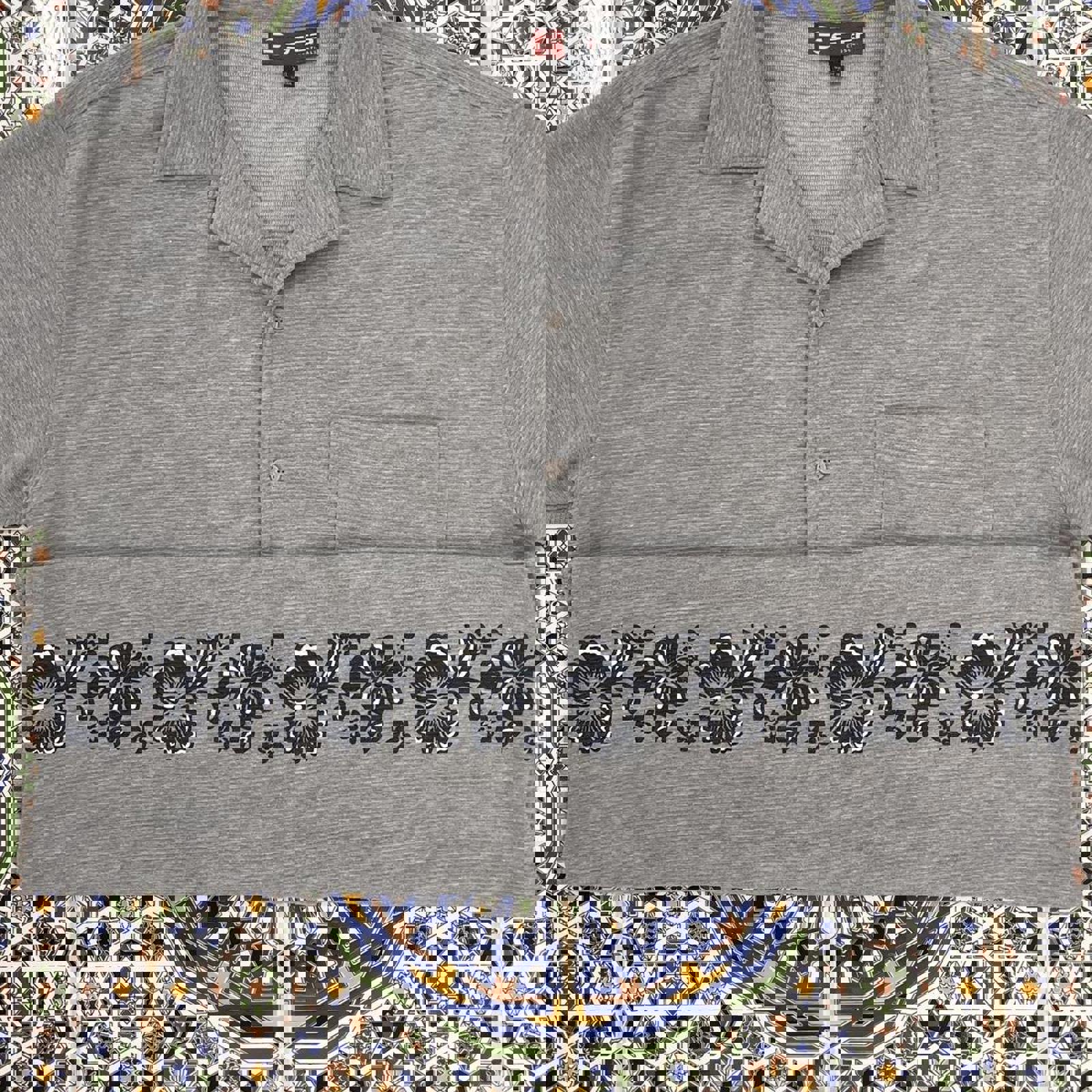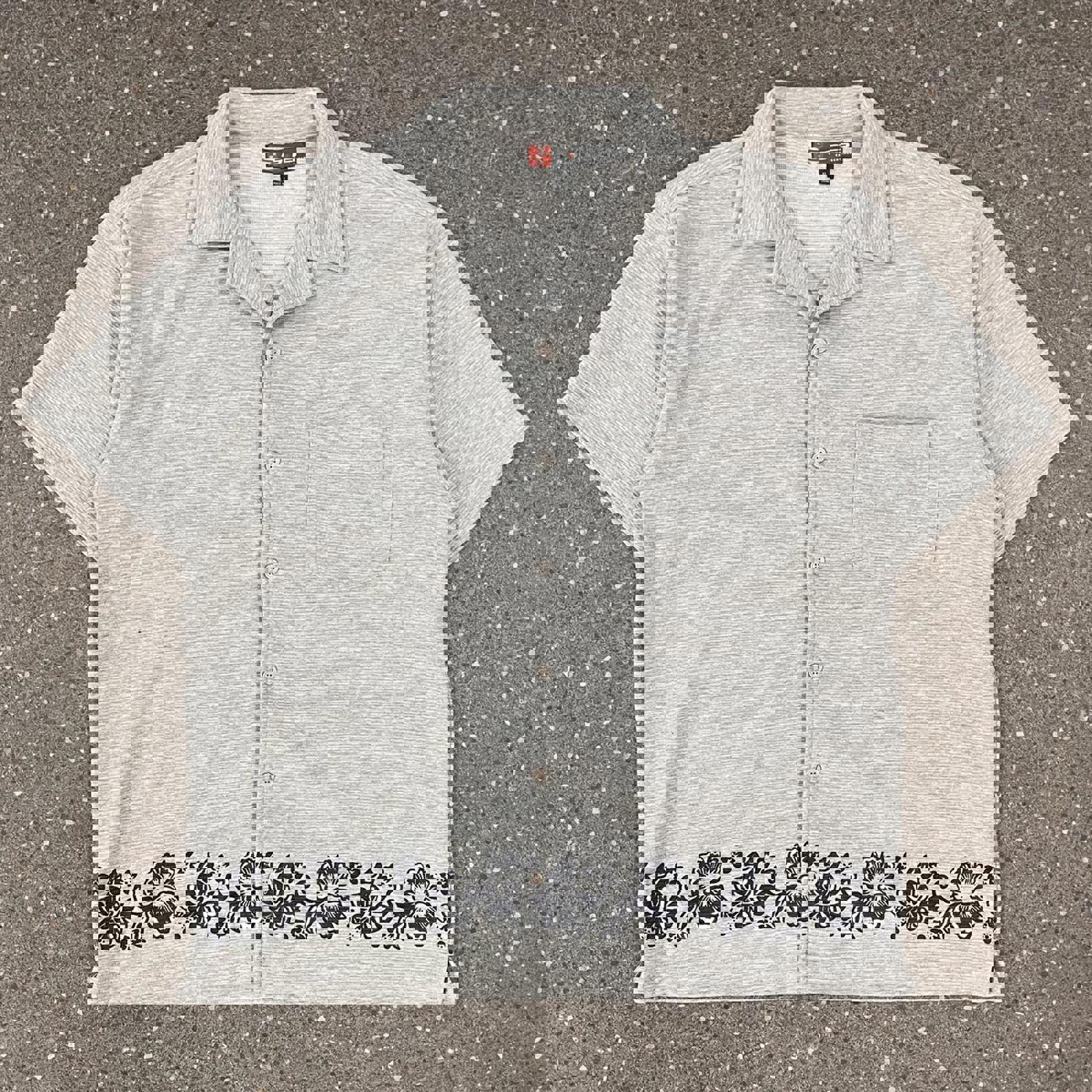 grey step short sleeved button up shirt with flowers wrapping around the waist