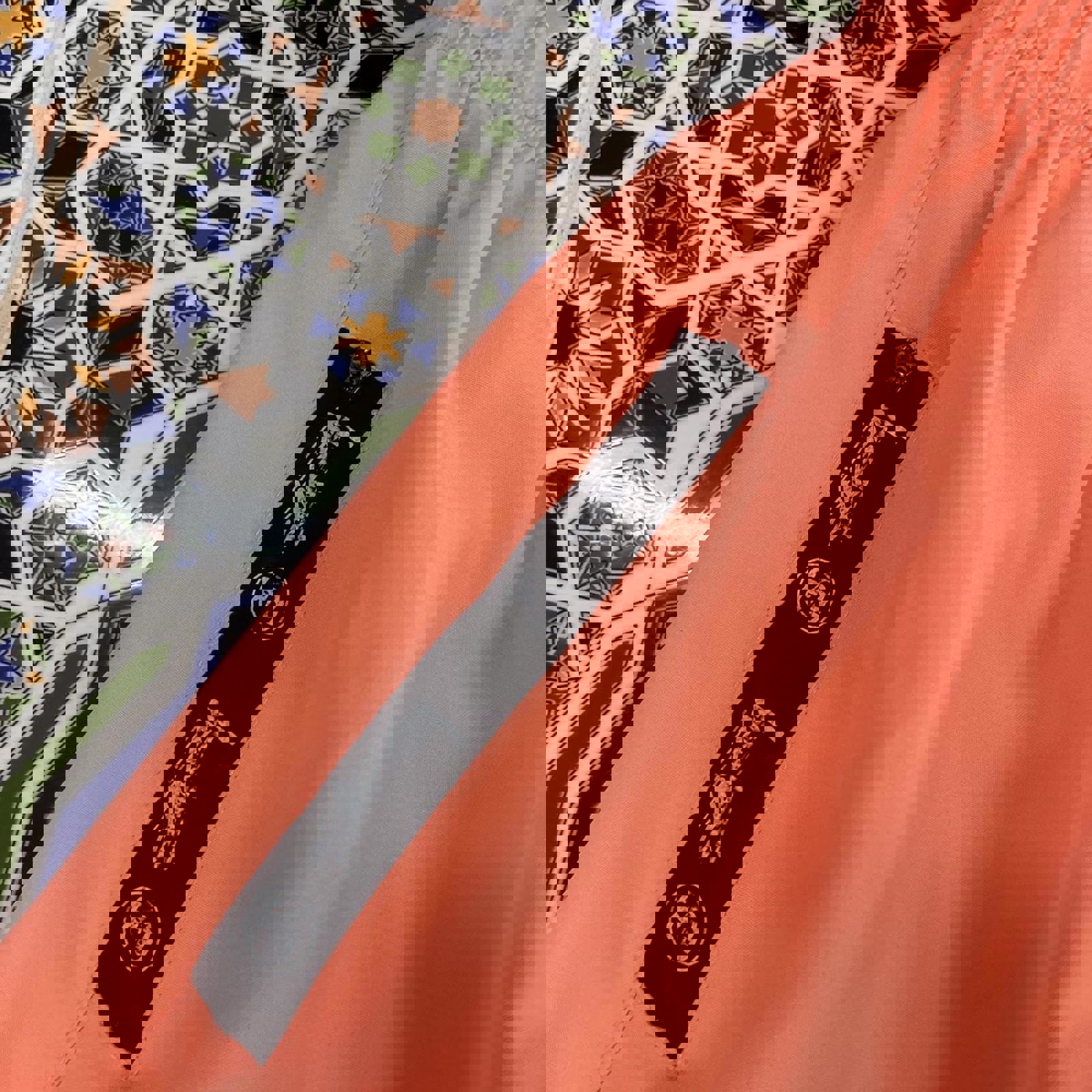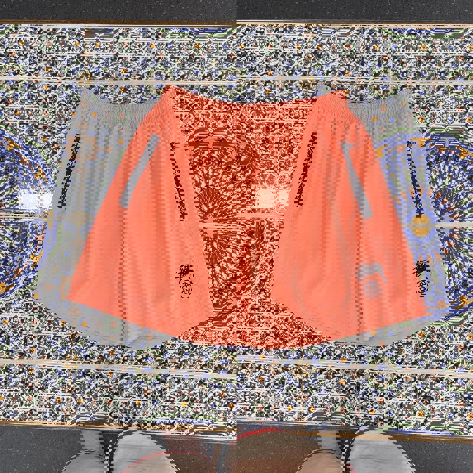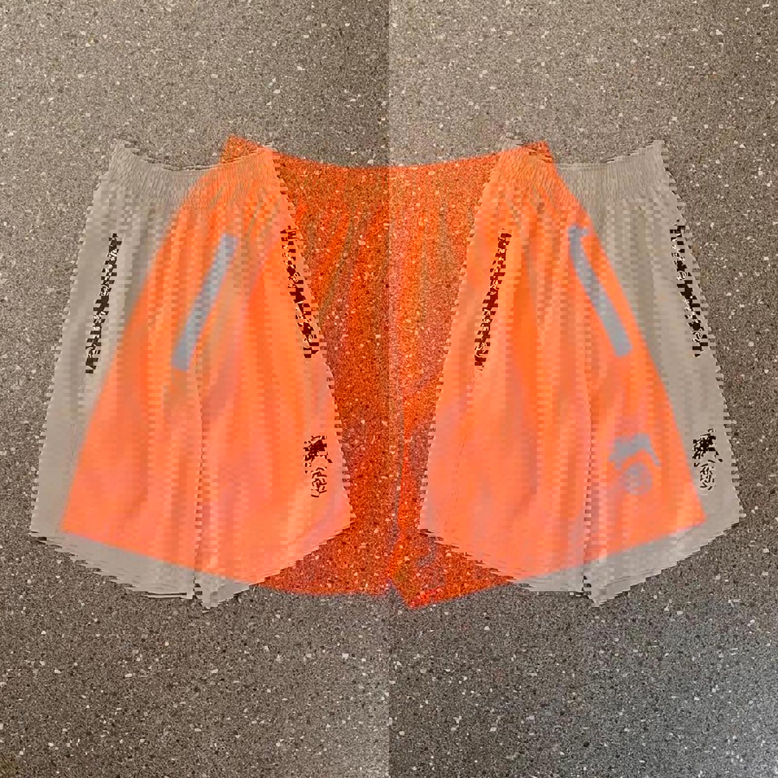Salmon pink stussy sports shorts with an embroidered logo on the leg and logos on the pockets