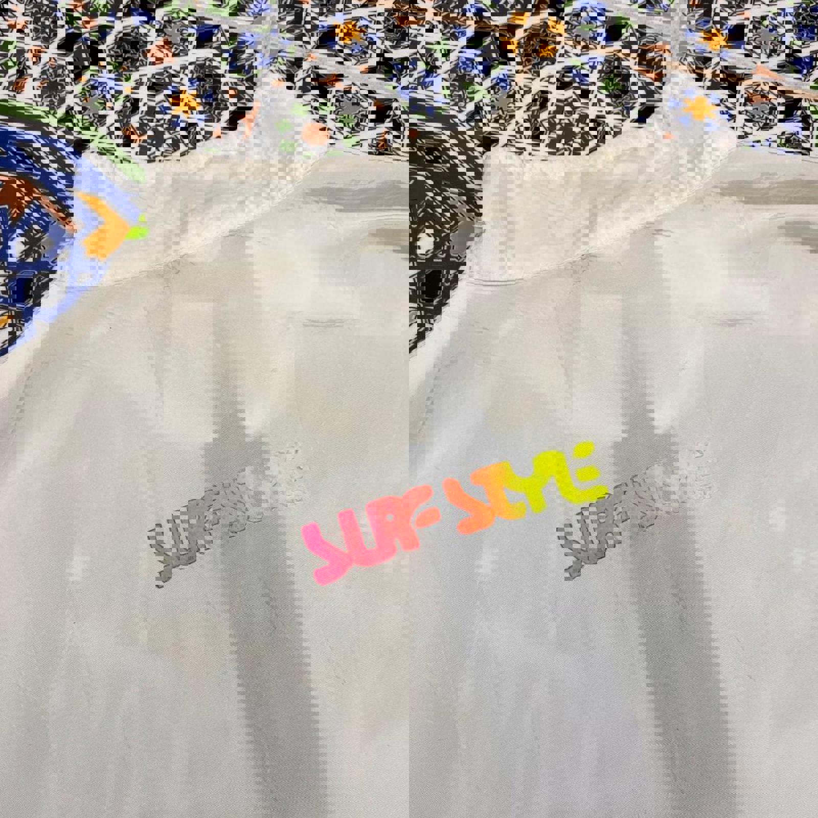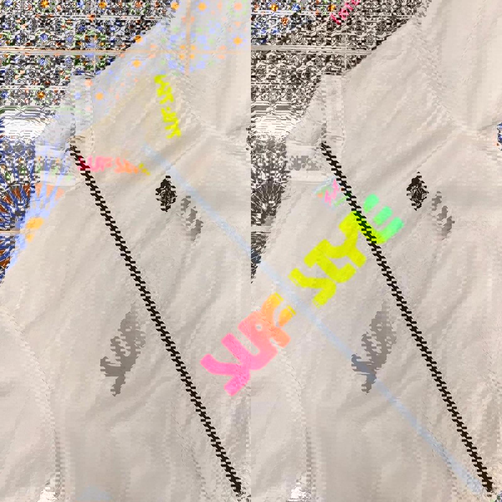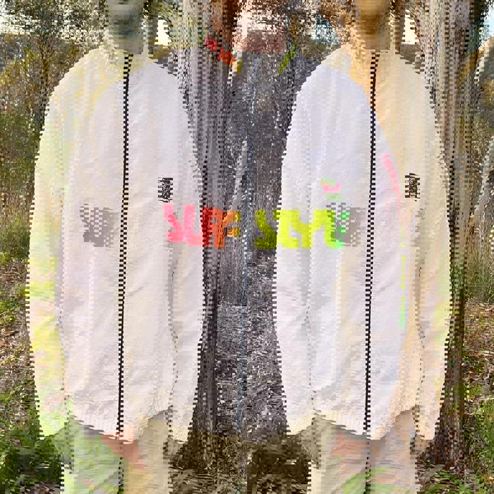 Vintage white surf style windbreaker 1/4 zip with a patch on the chest and large fluro rainbow logos printed on the belly and sleeve