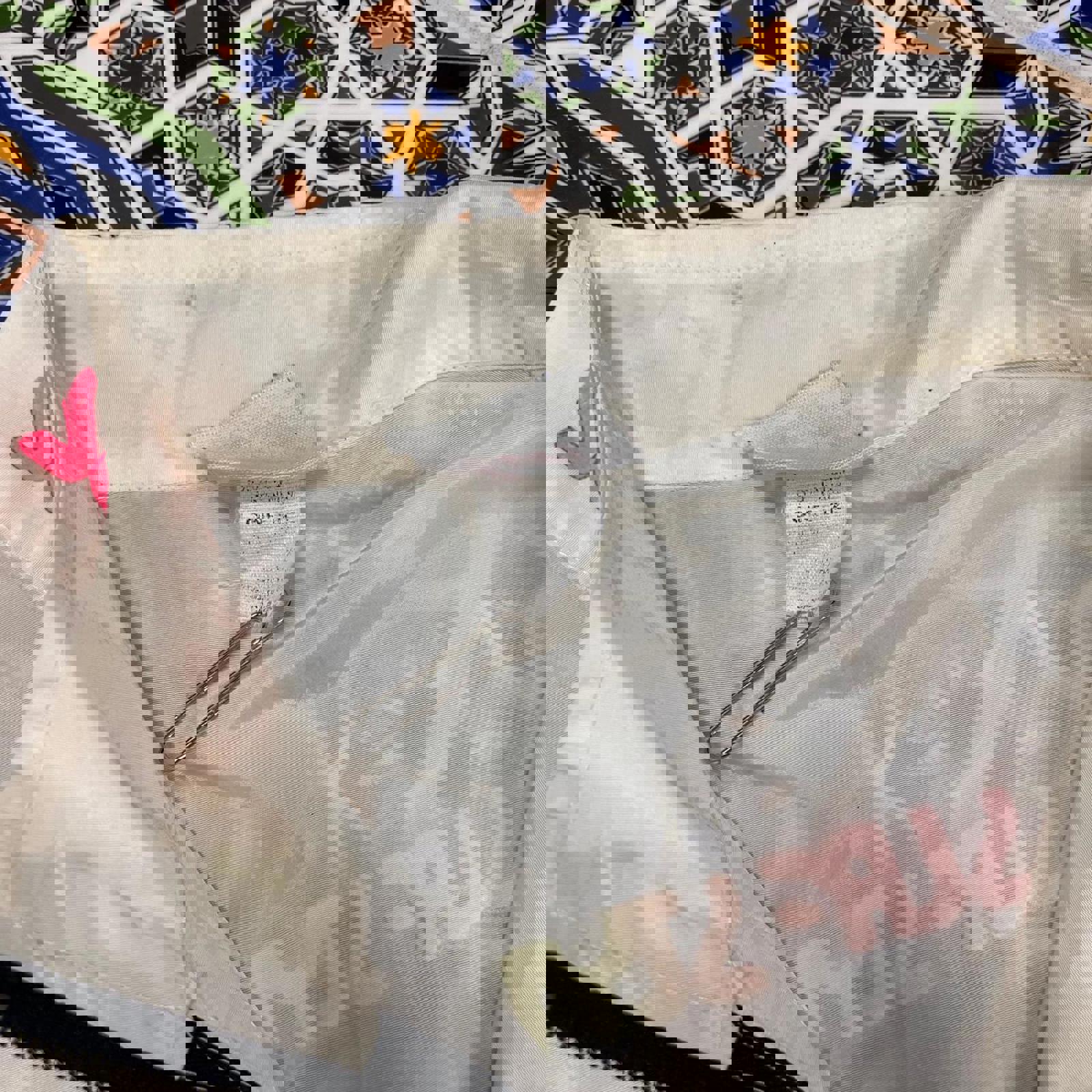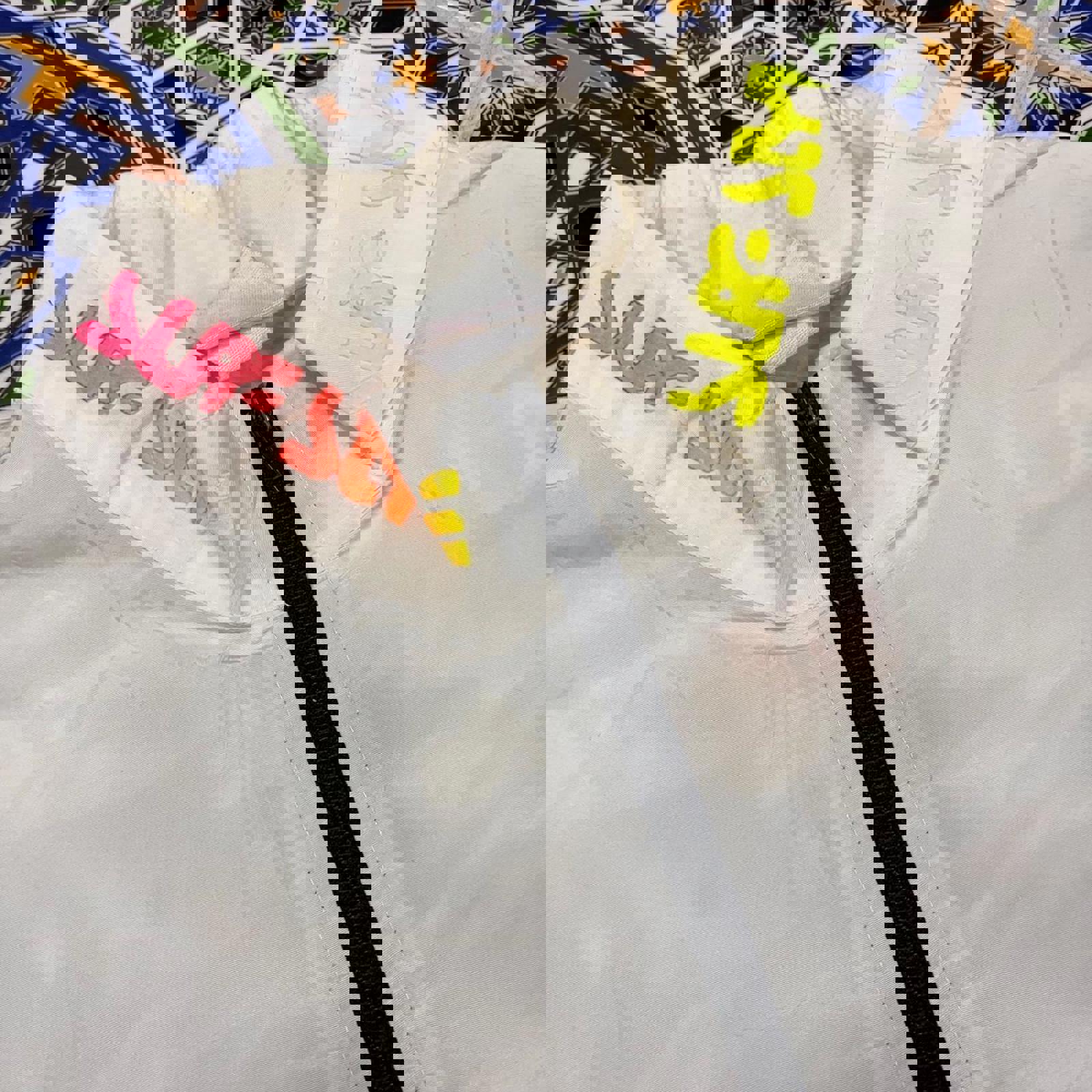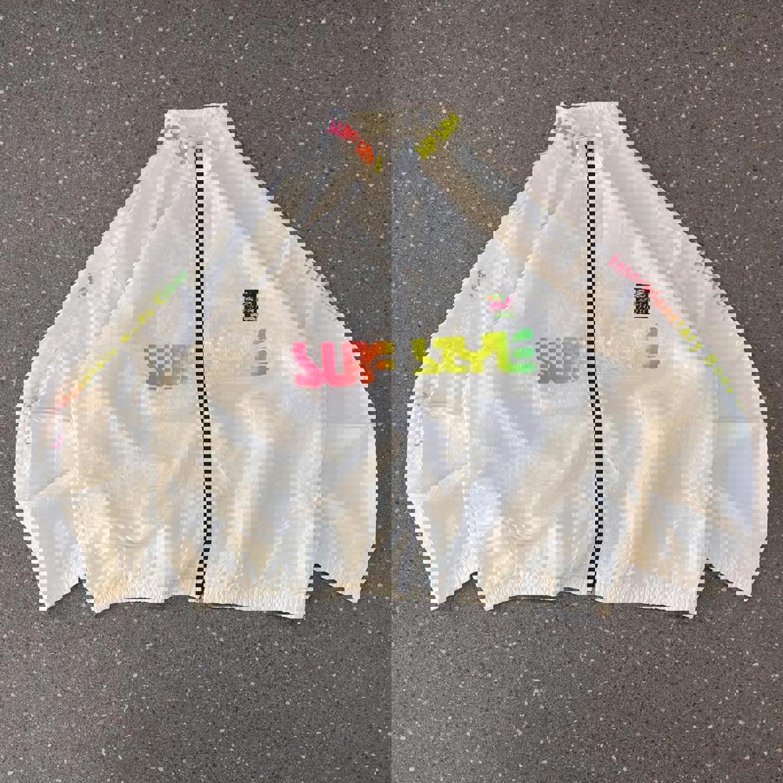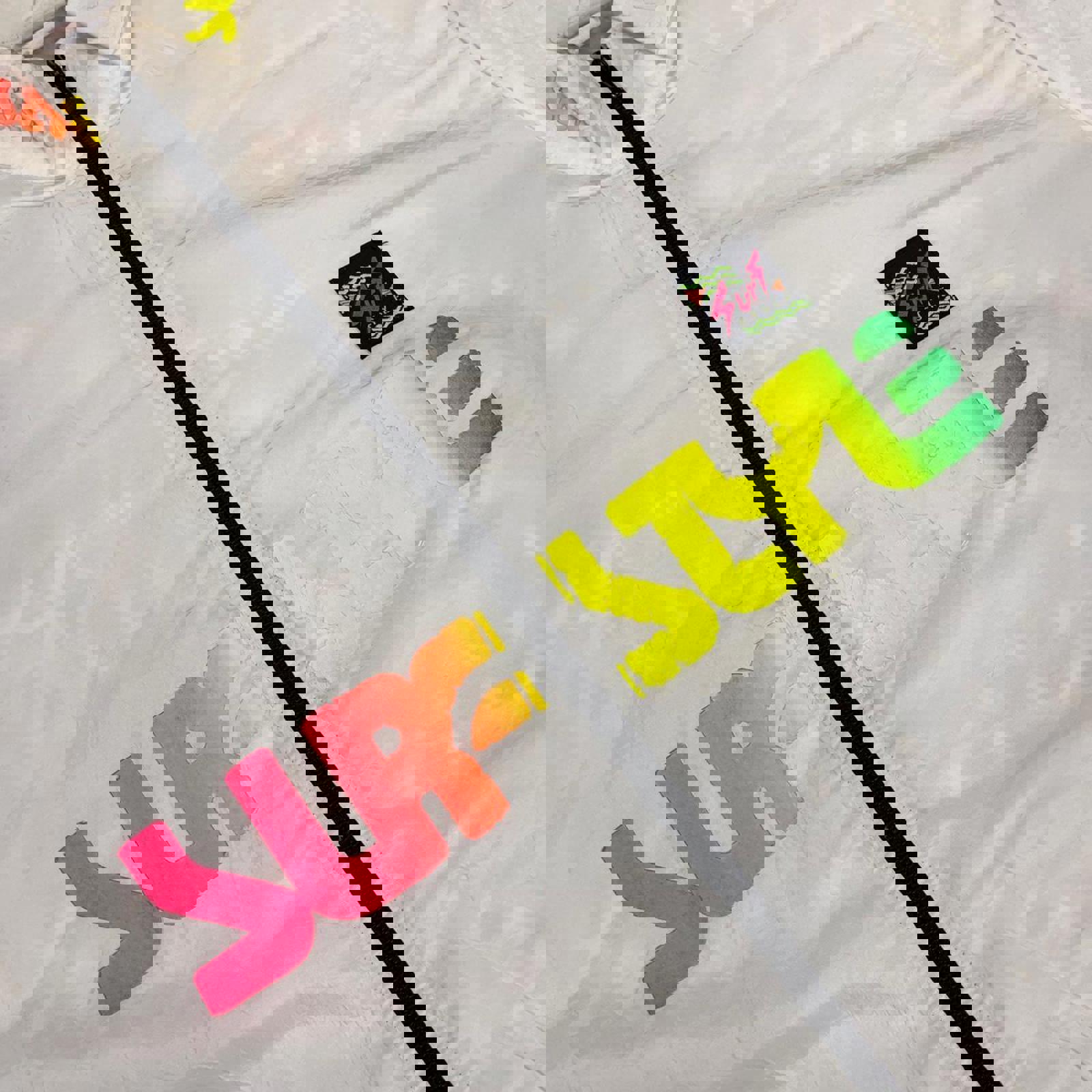 Vintage white surf style windbreaker 1/4 zip with a patch on the chest and large fluro rainbow logos printed on the belly and sleeve