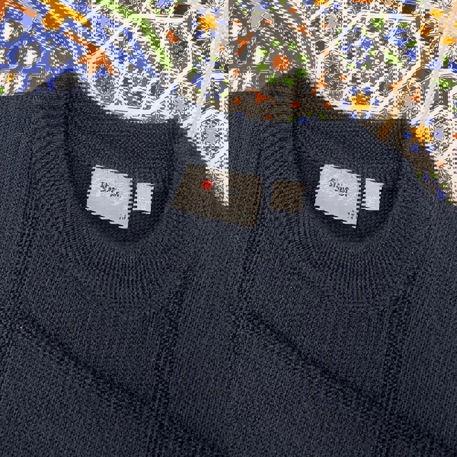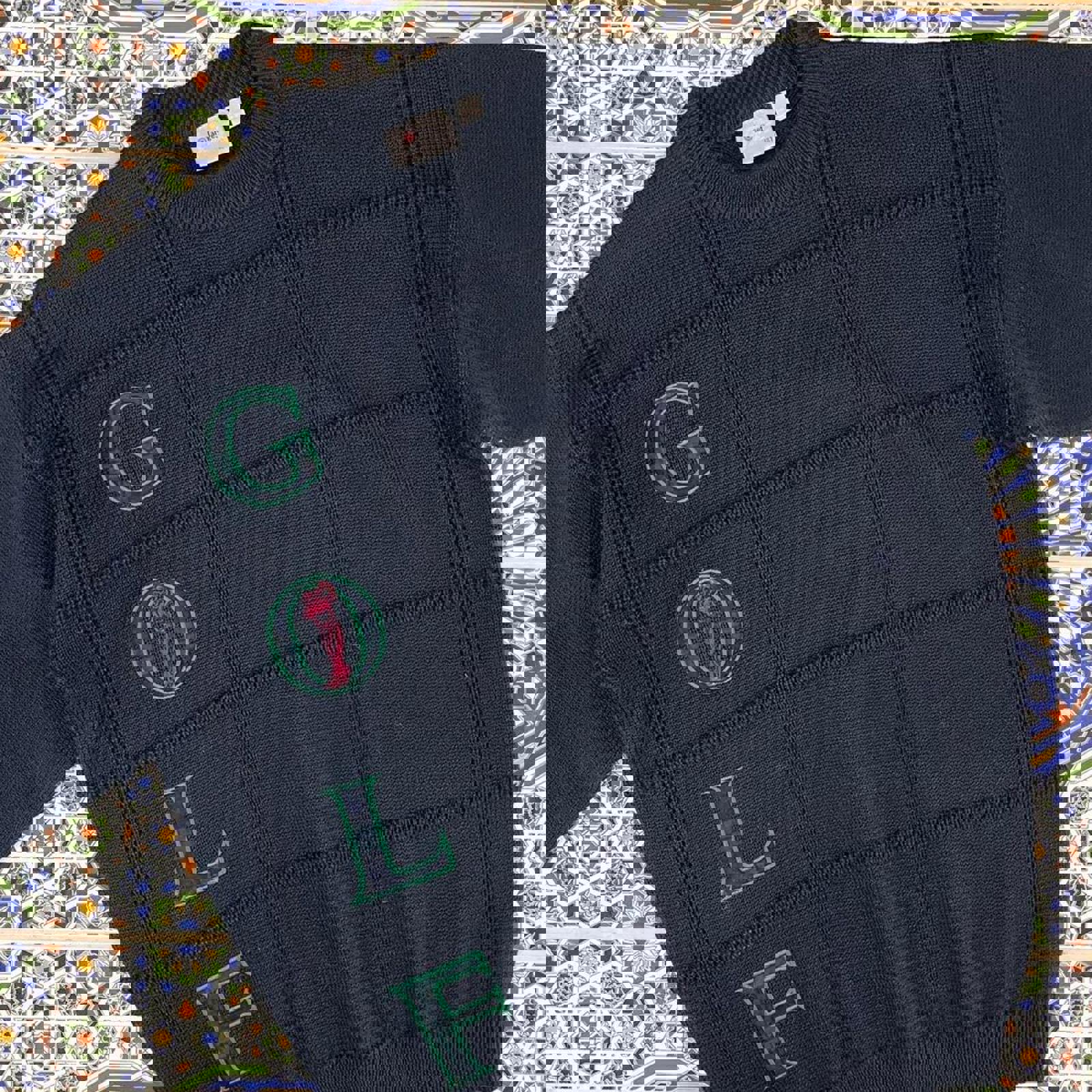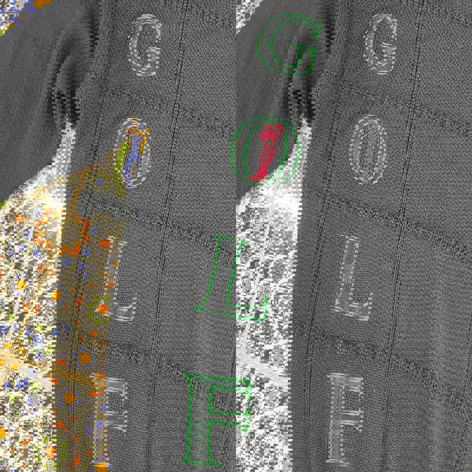 Vintage navy target cardigan sweatshirt with a green and red embroidered gold spell out and graphic on the front