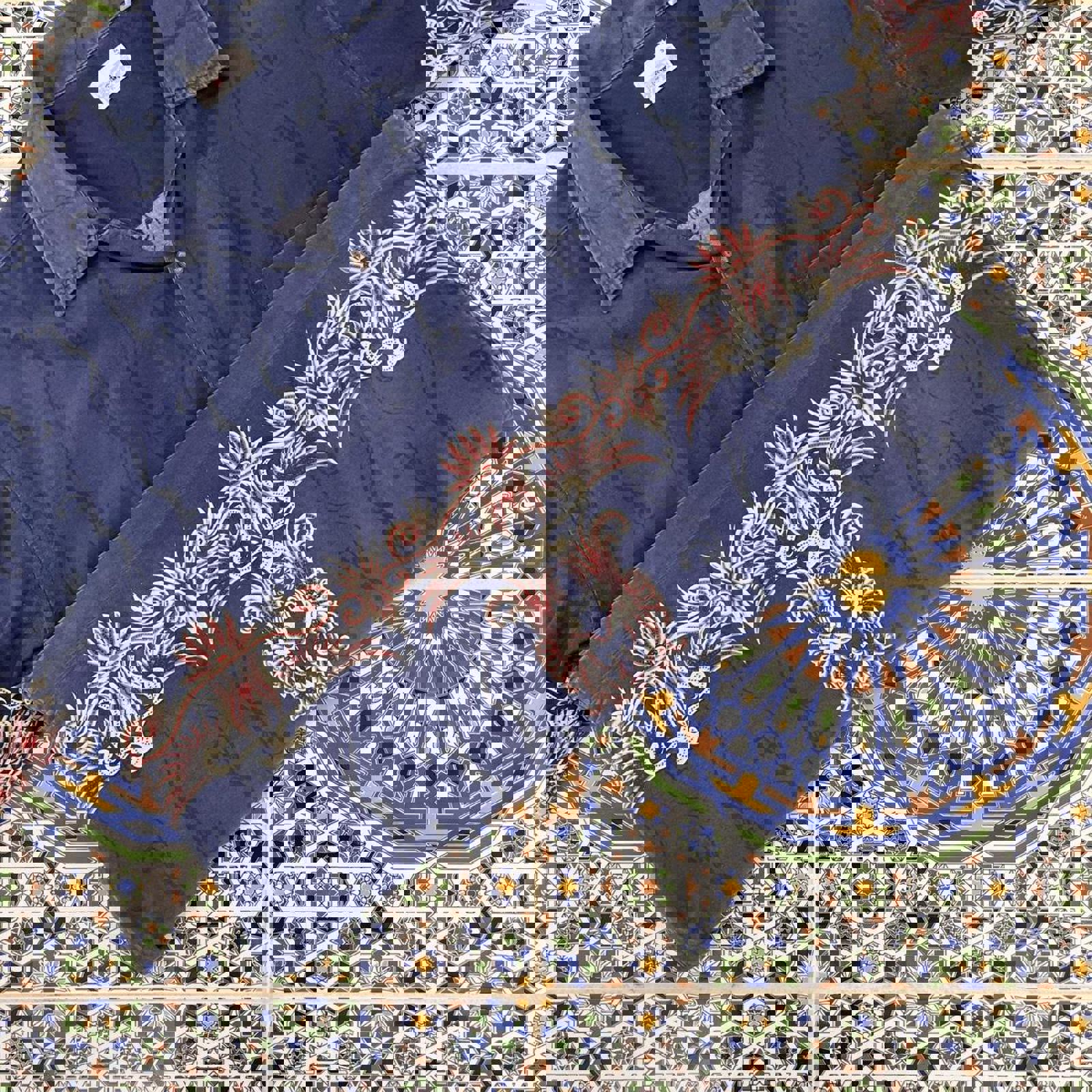 black, navy, red and white target short sleeve button up shirt with patterns all over