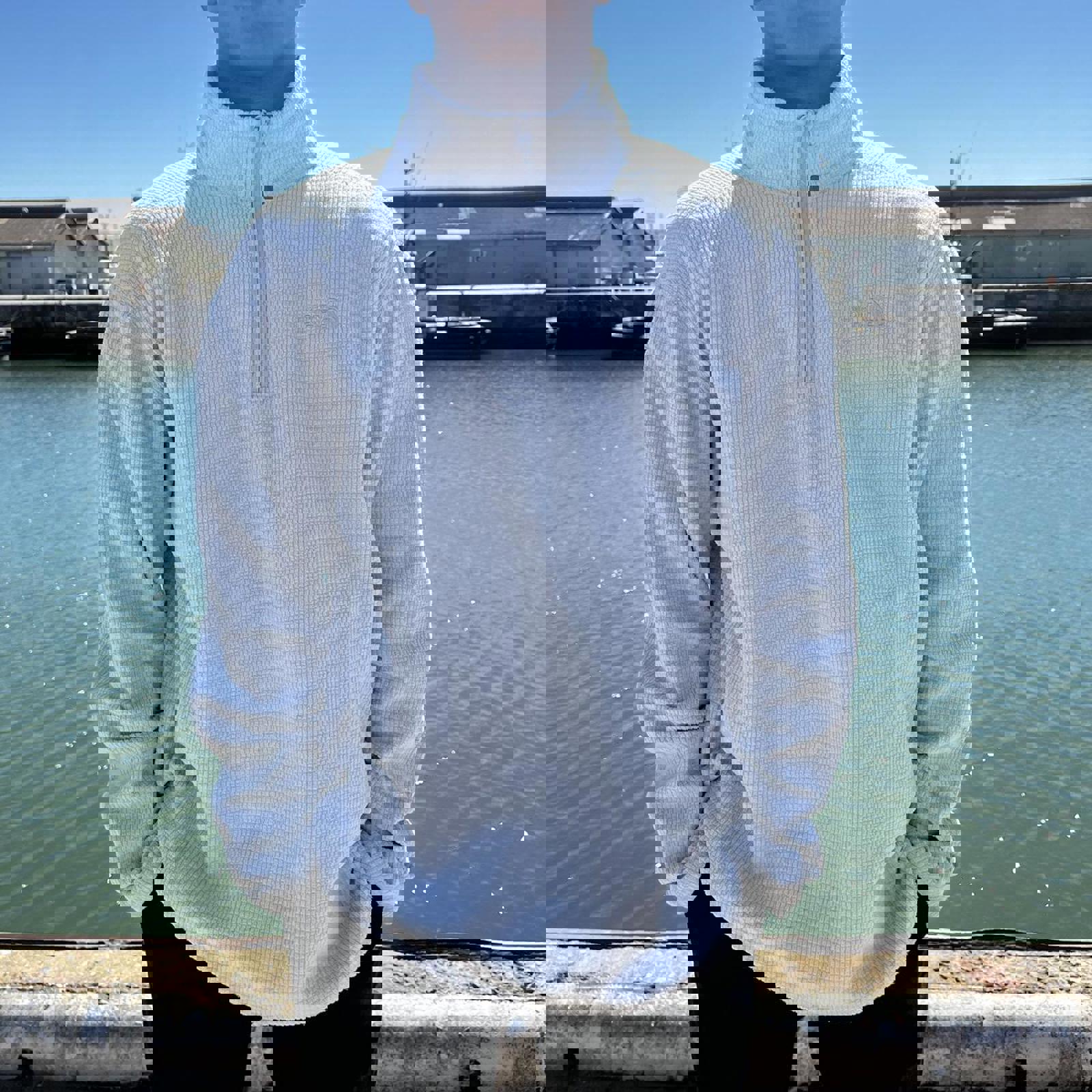 baby blue north face 1/4 zip jumper with rectangle checkered fleece pattern all over and a subtle embroidered north face logo on the chest