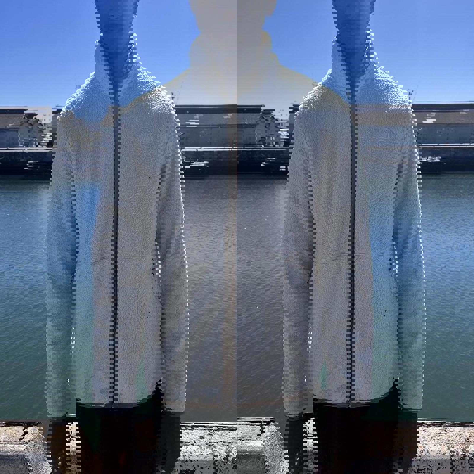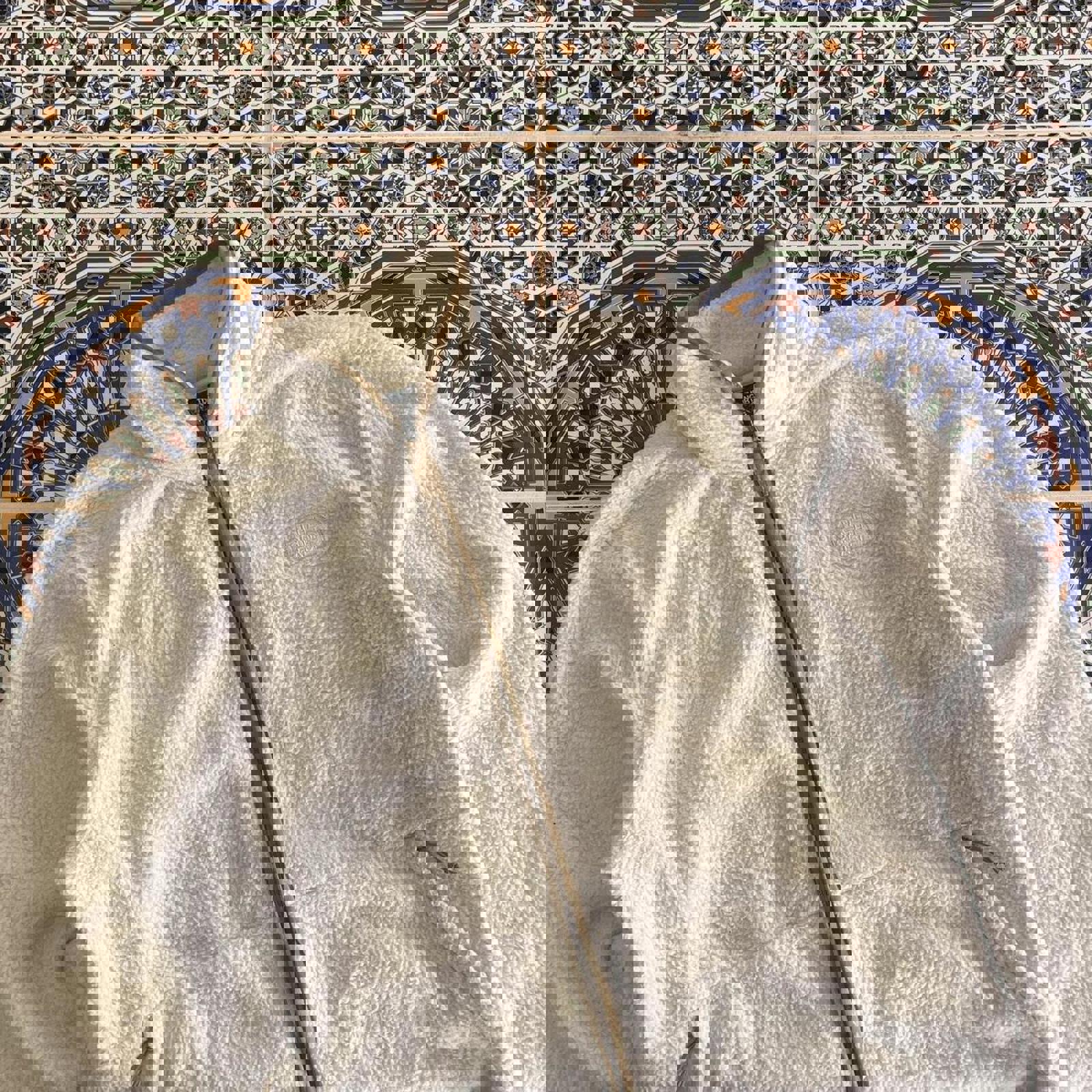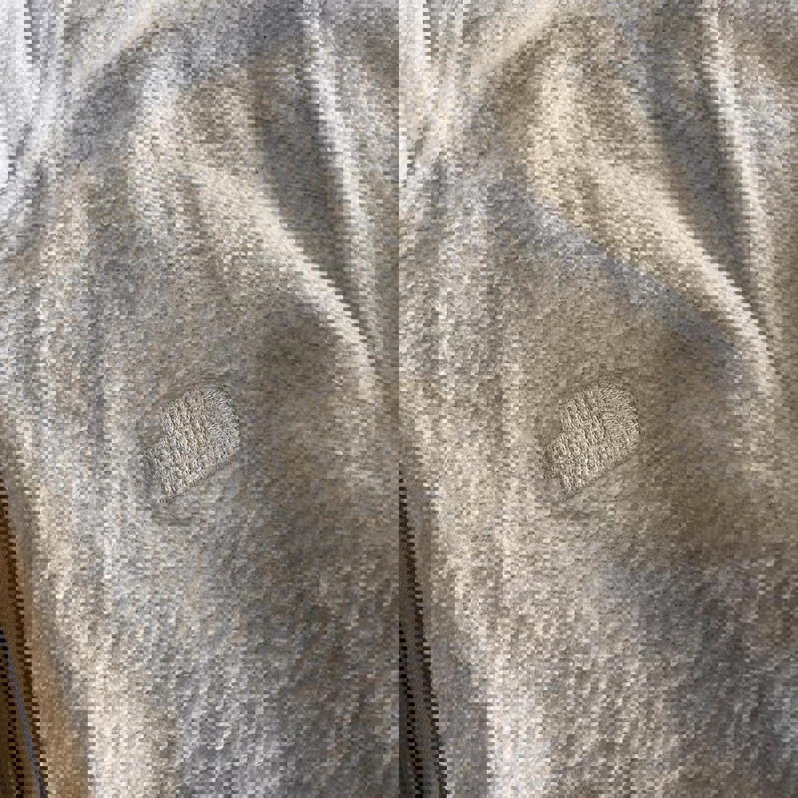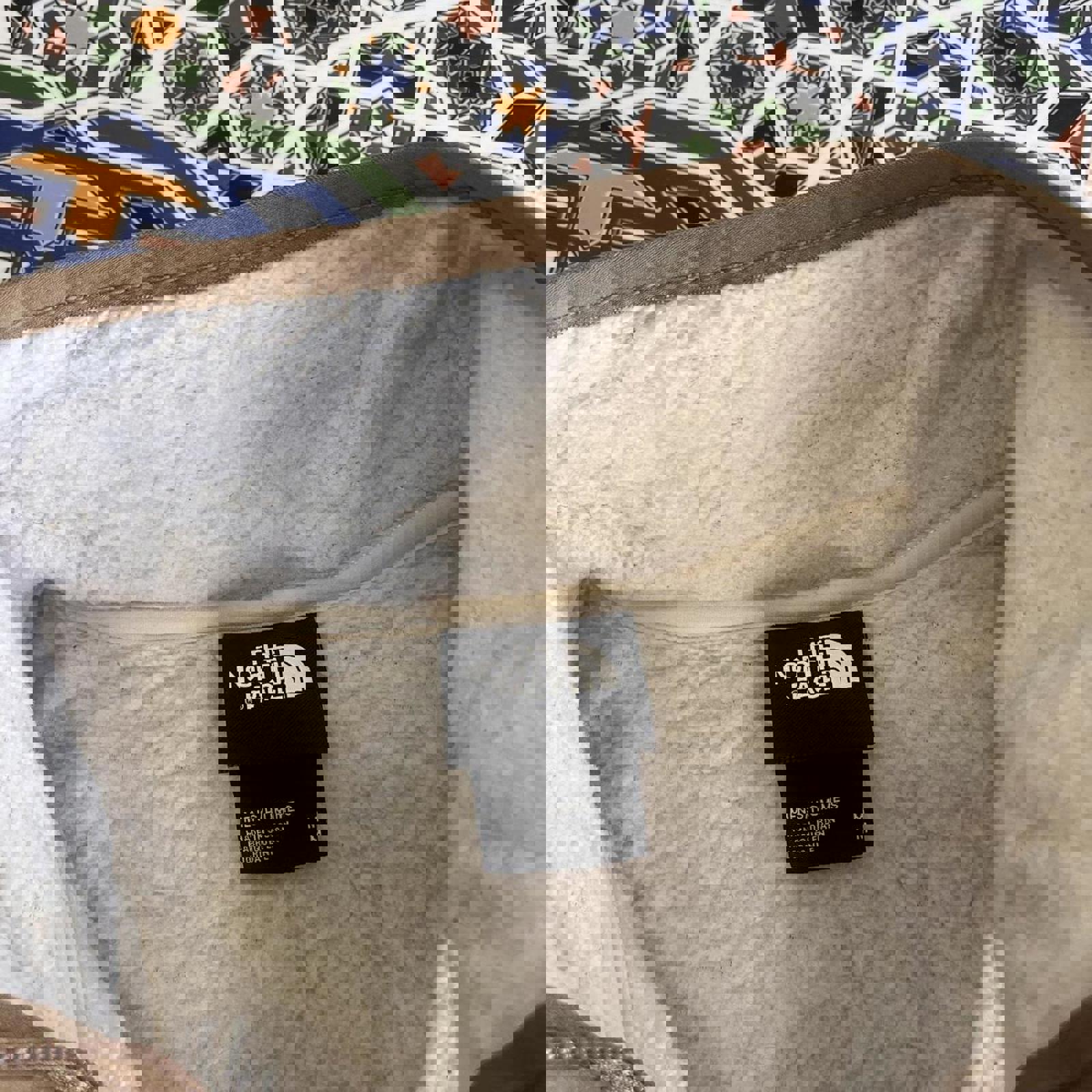 White with tan the north face fluffy fleece sweater jacket with front pockets and a white embroidered north face logo on the chest