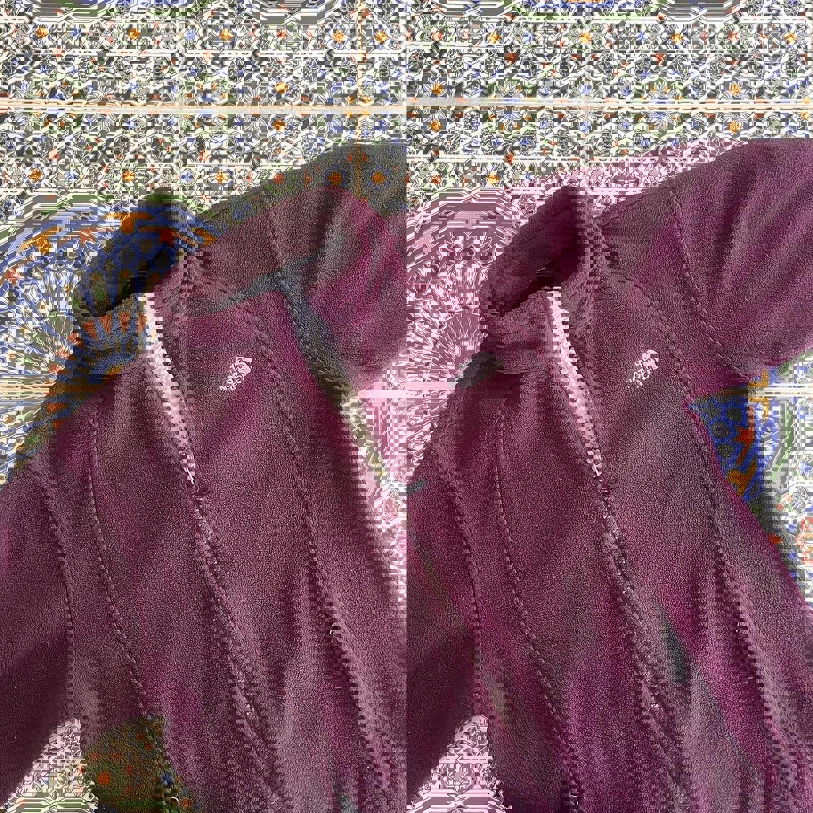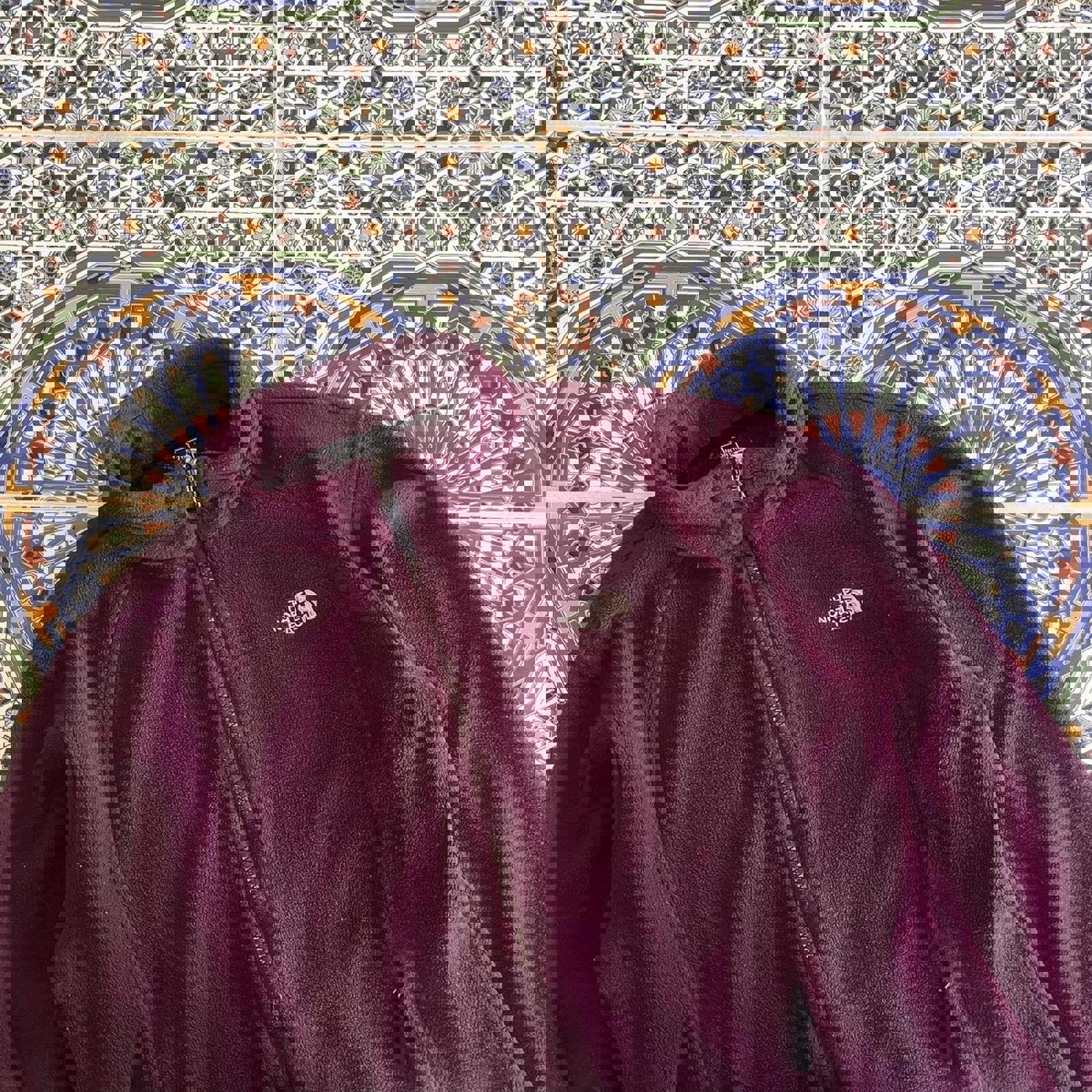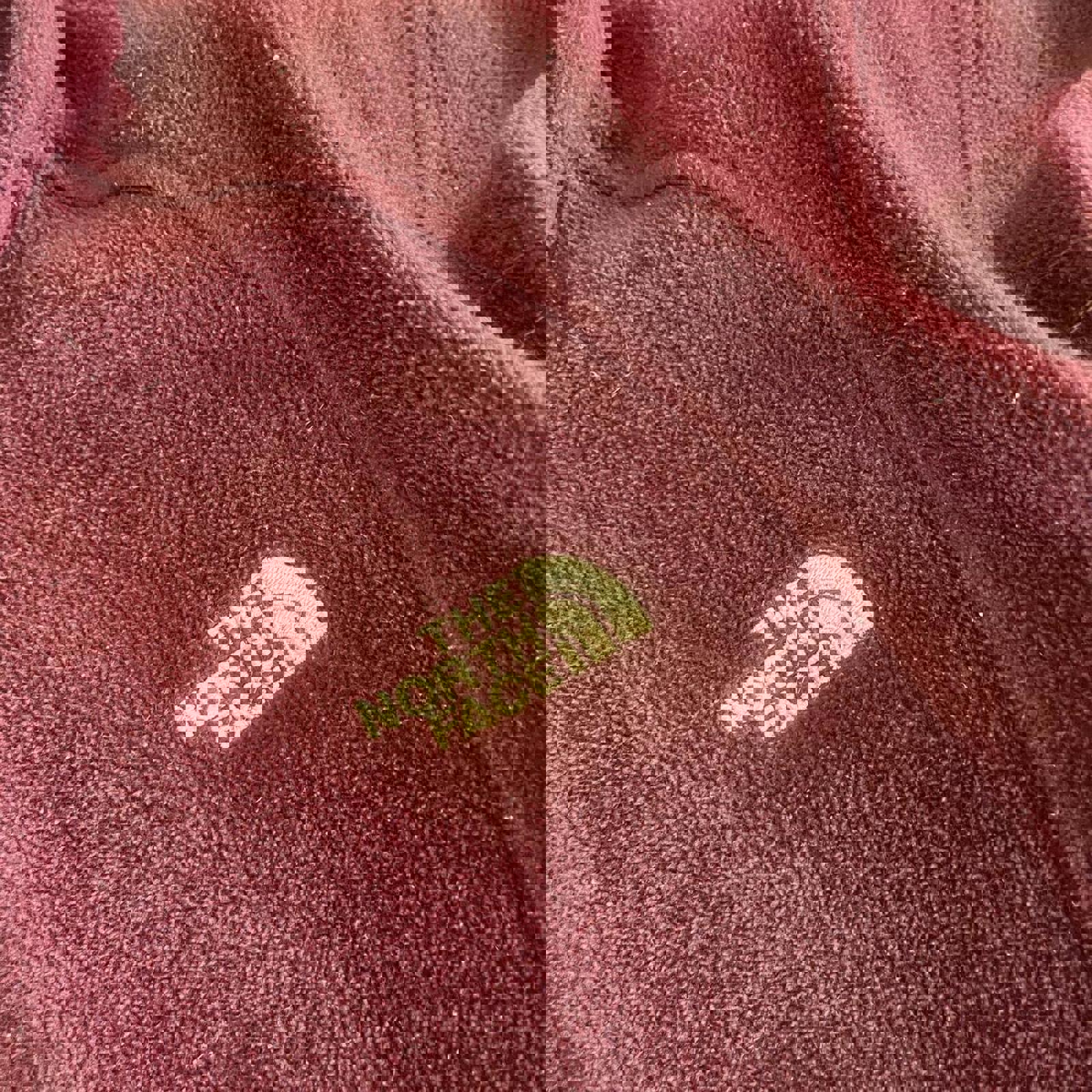 maroon north face sweater jacket with grey accent on collar, zipable pockets on the side and white embroidered north face logos on the chest and back
