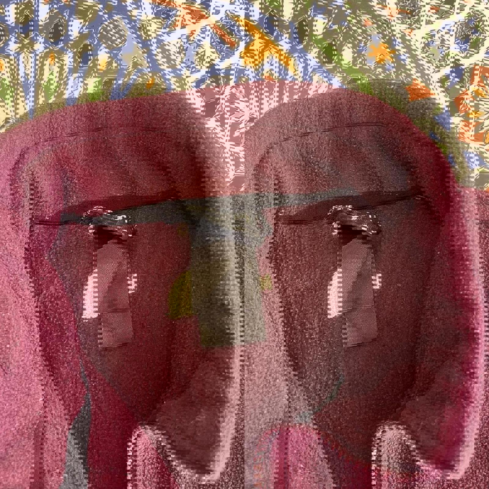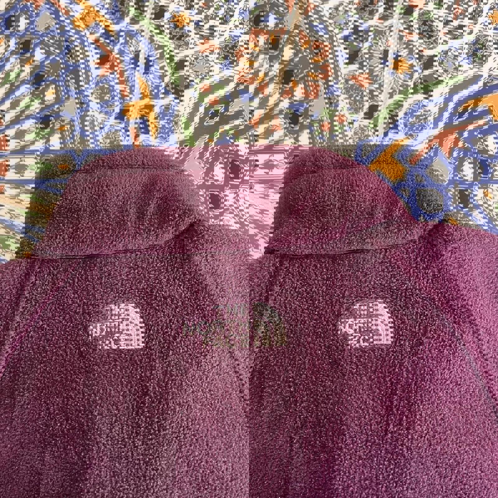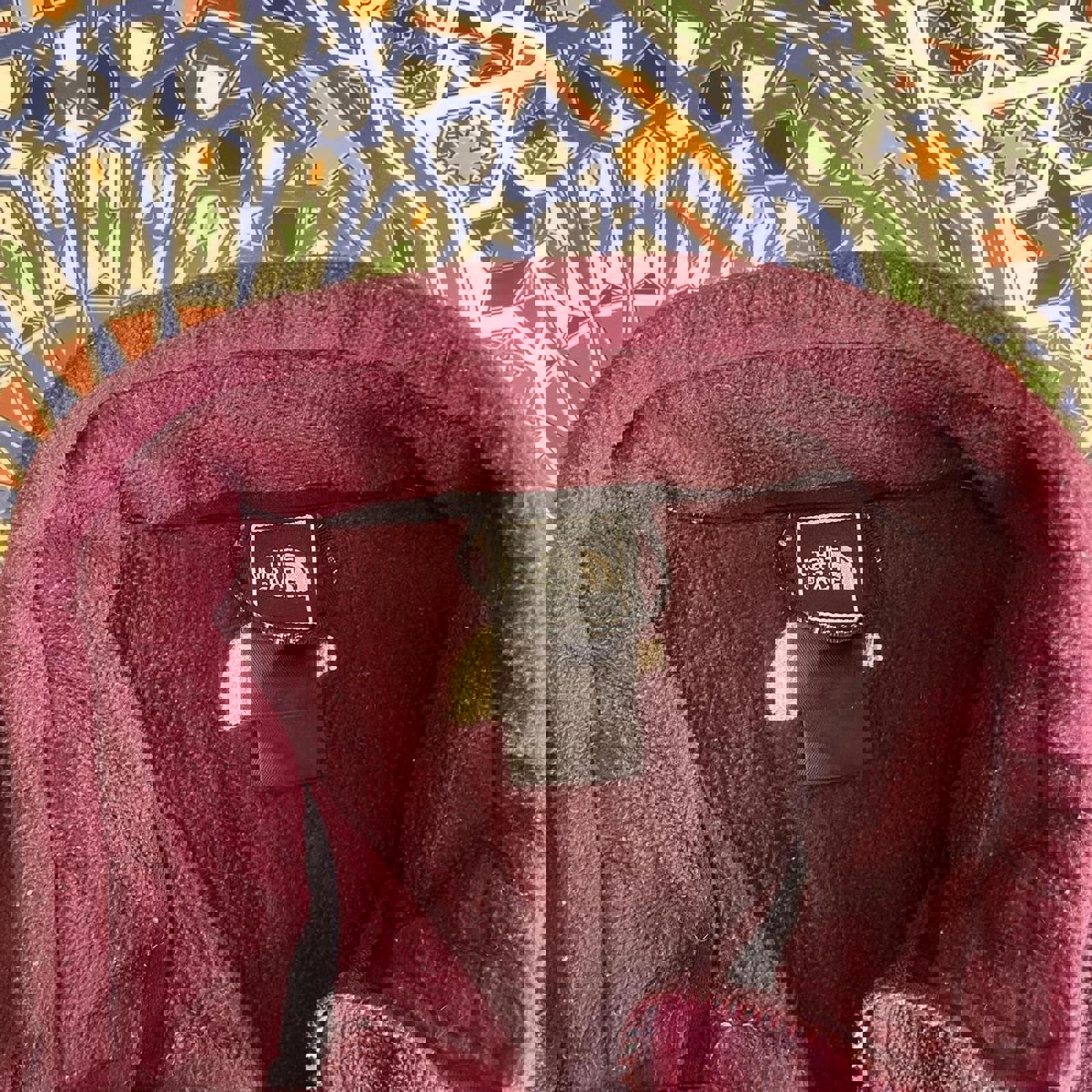 maroon north face sweater jacket with grey accent on collar, zipable pockets on the side and white embroidered north face logos on the chest and back