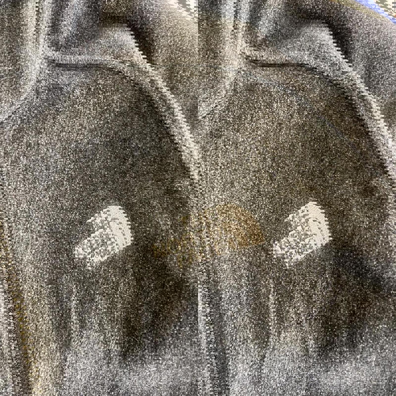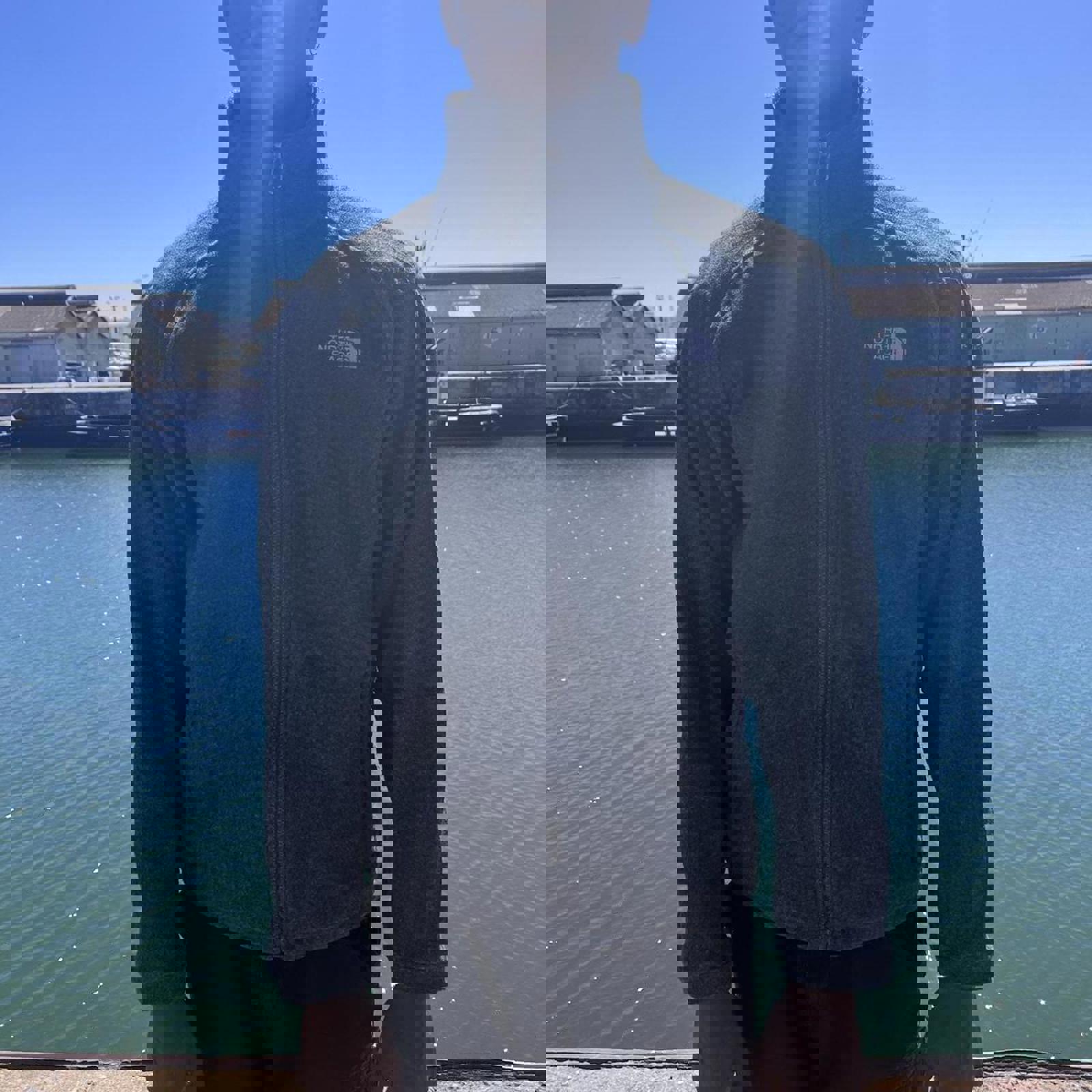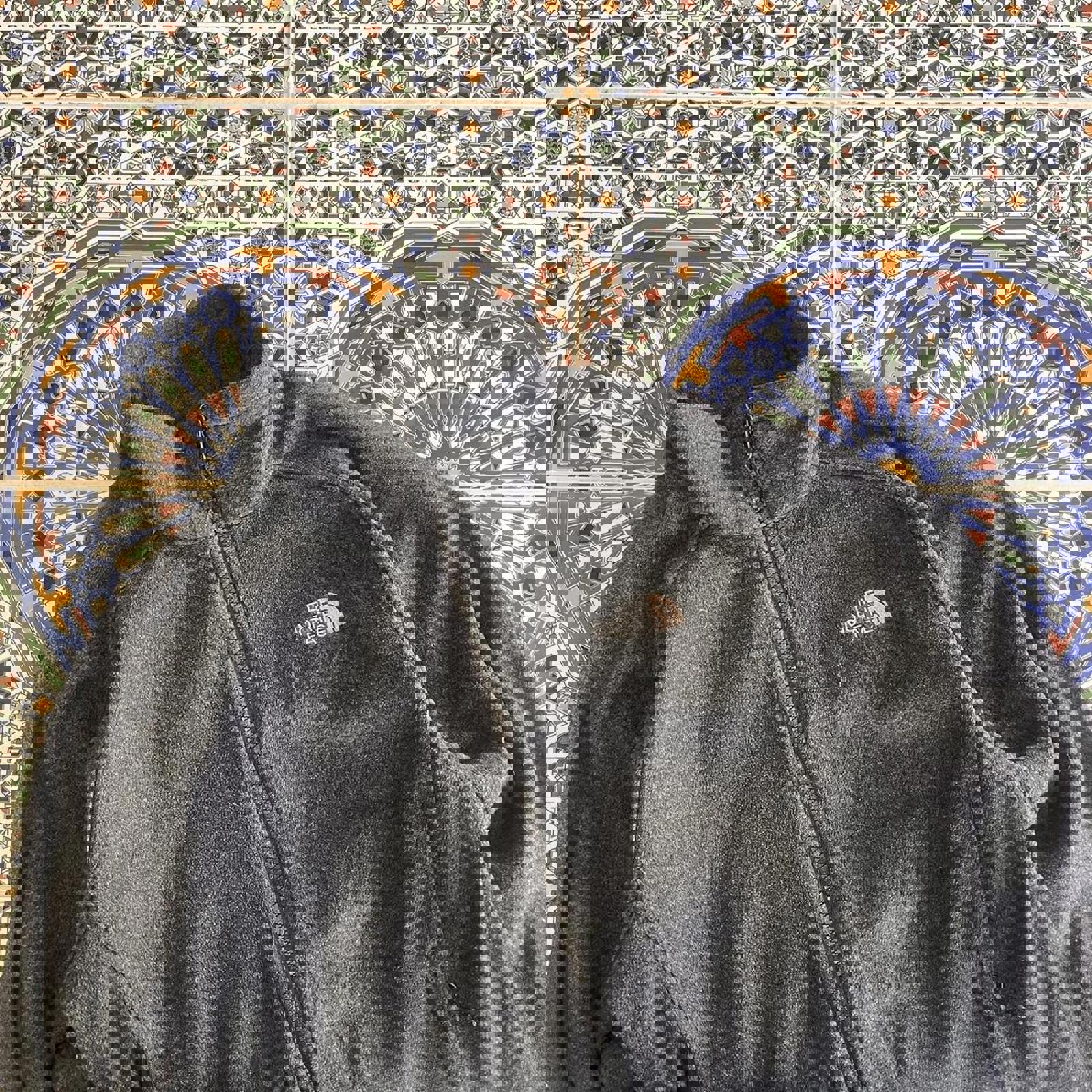 grey north face sweater jacket with a white embroidered north face logo on the chest and pockets on the side