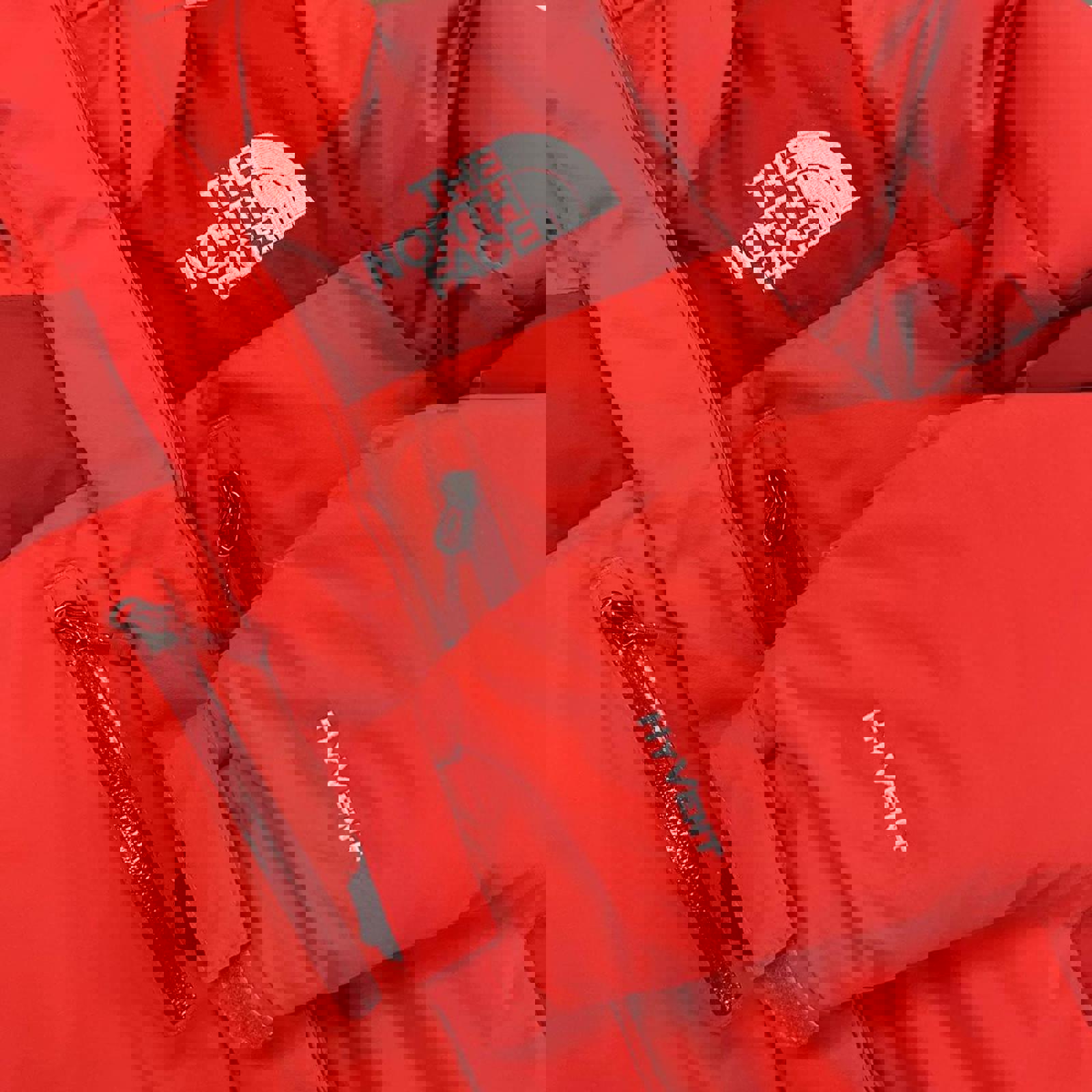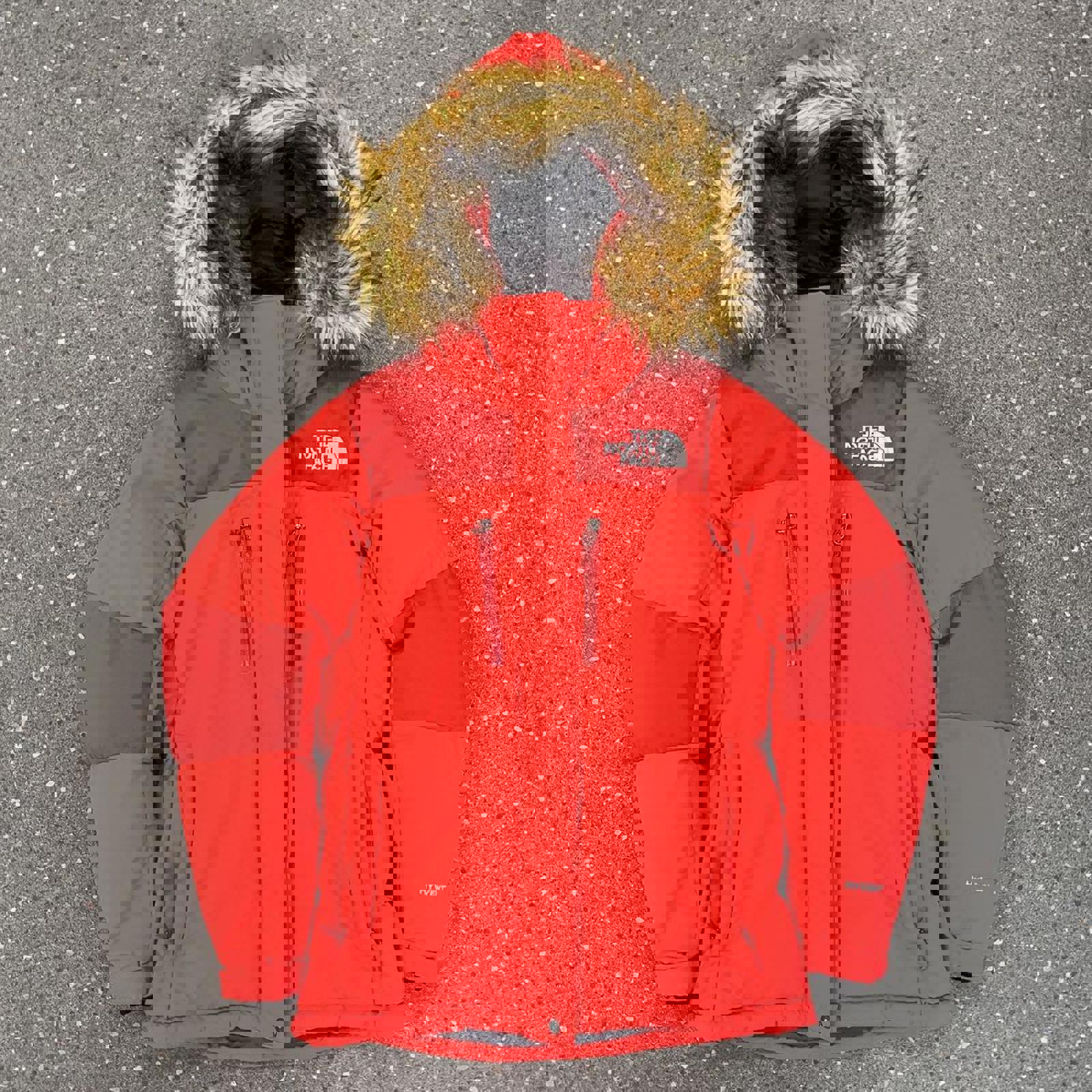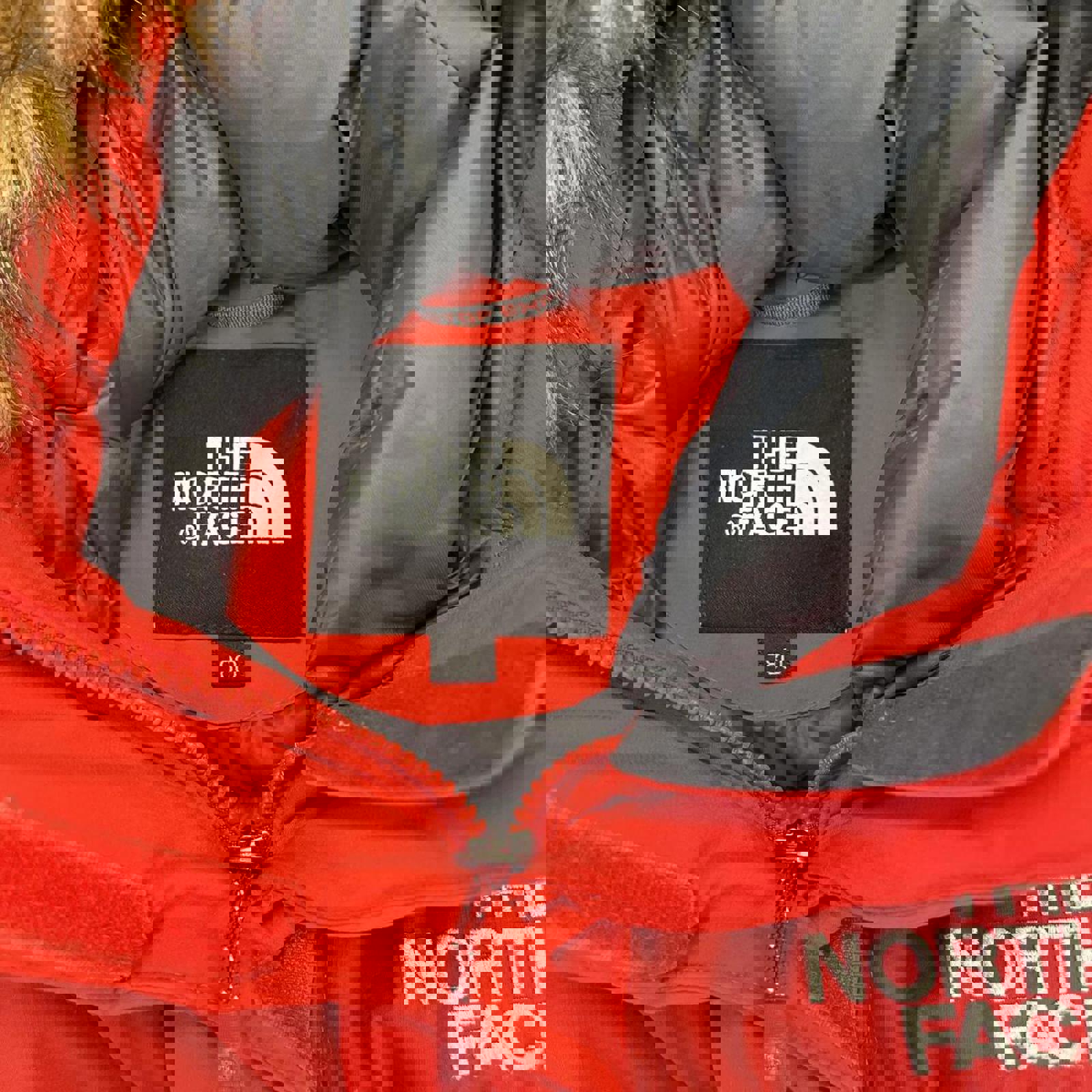 two tone red north face hyvent puffer jacket with white embroidered north face logos on the chest and back, an embroidered grey hyvent spellout, grey interior and a detachable fur attachment for the hood