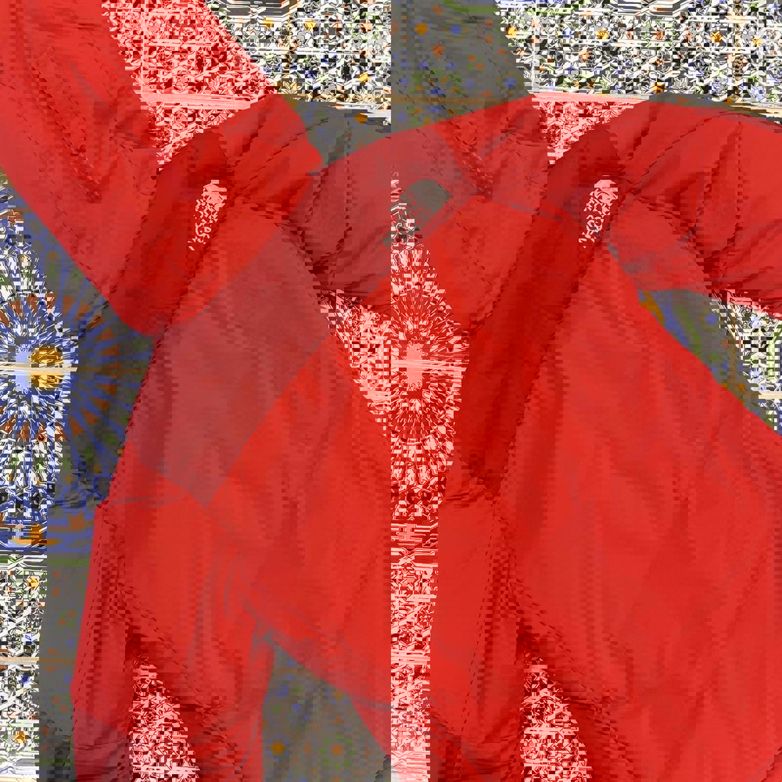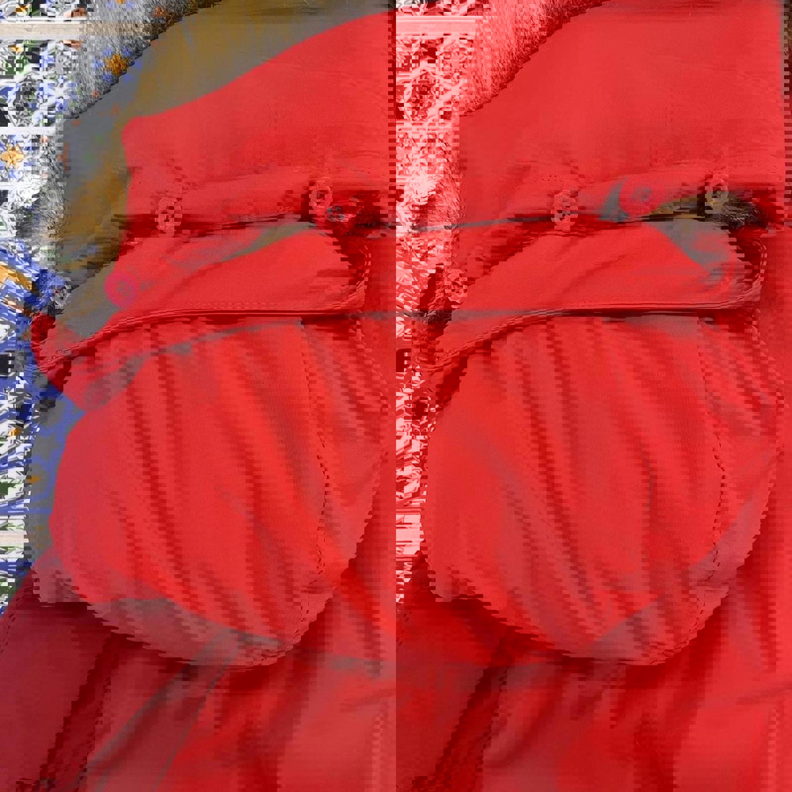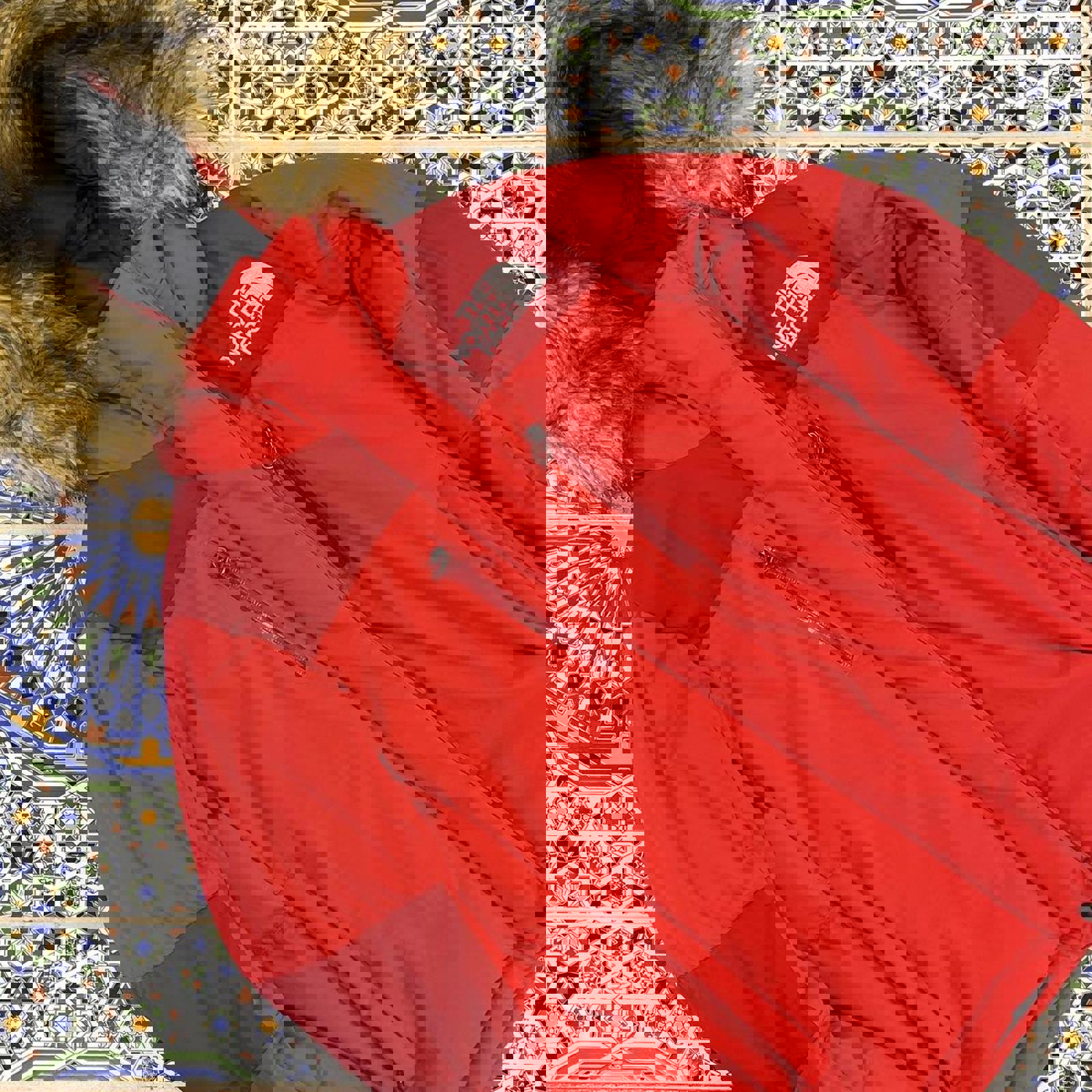 two tone red north face hyvent puffer jacket with white embroidered north face logos on the chest and back, an embroidered grey hyvent spellout, grey interior and a detachable fur attachment for the hood