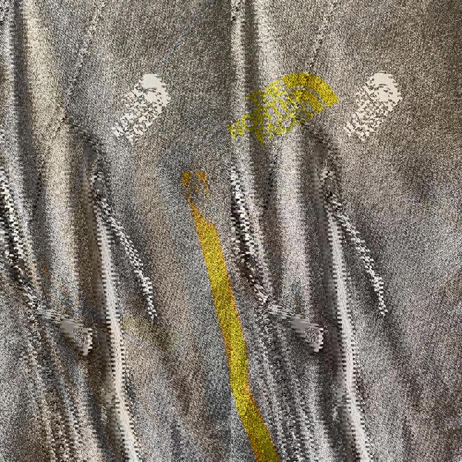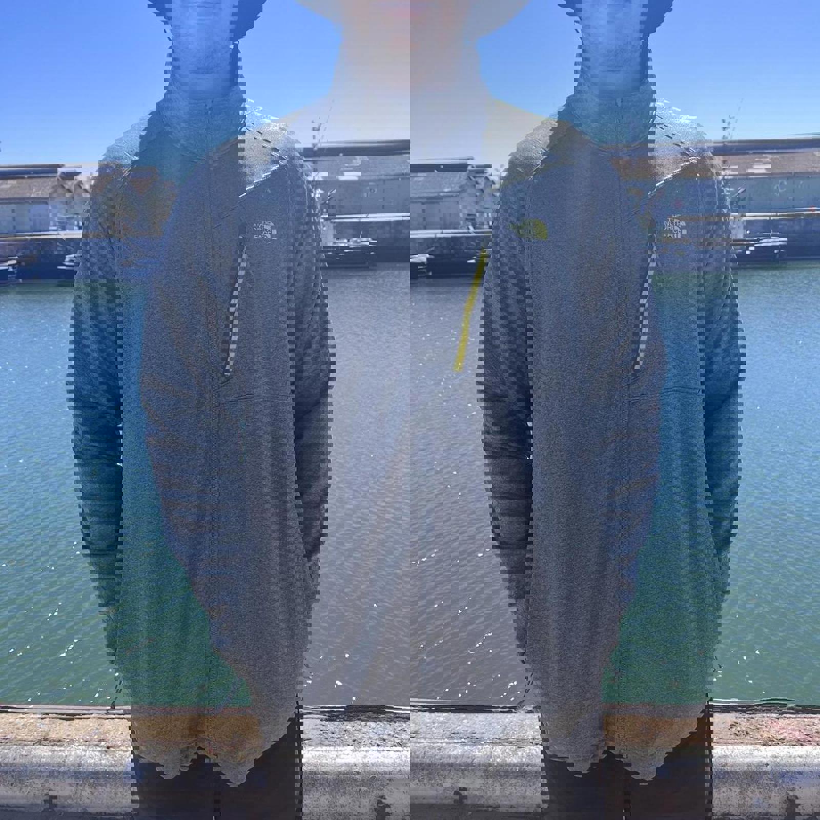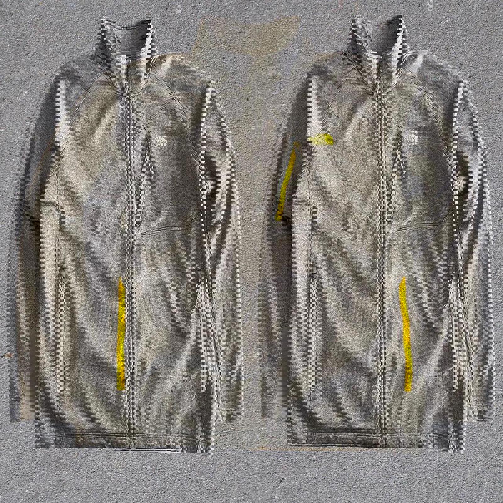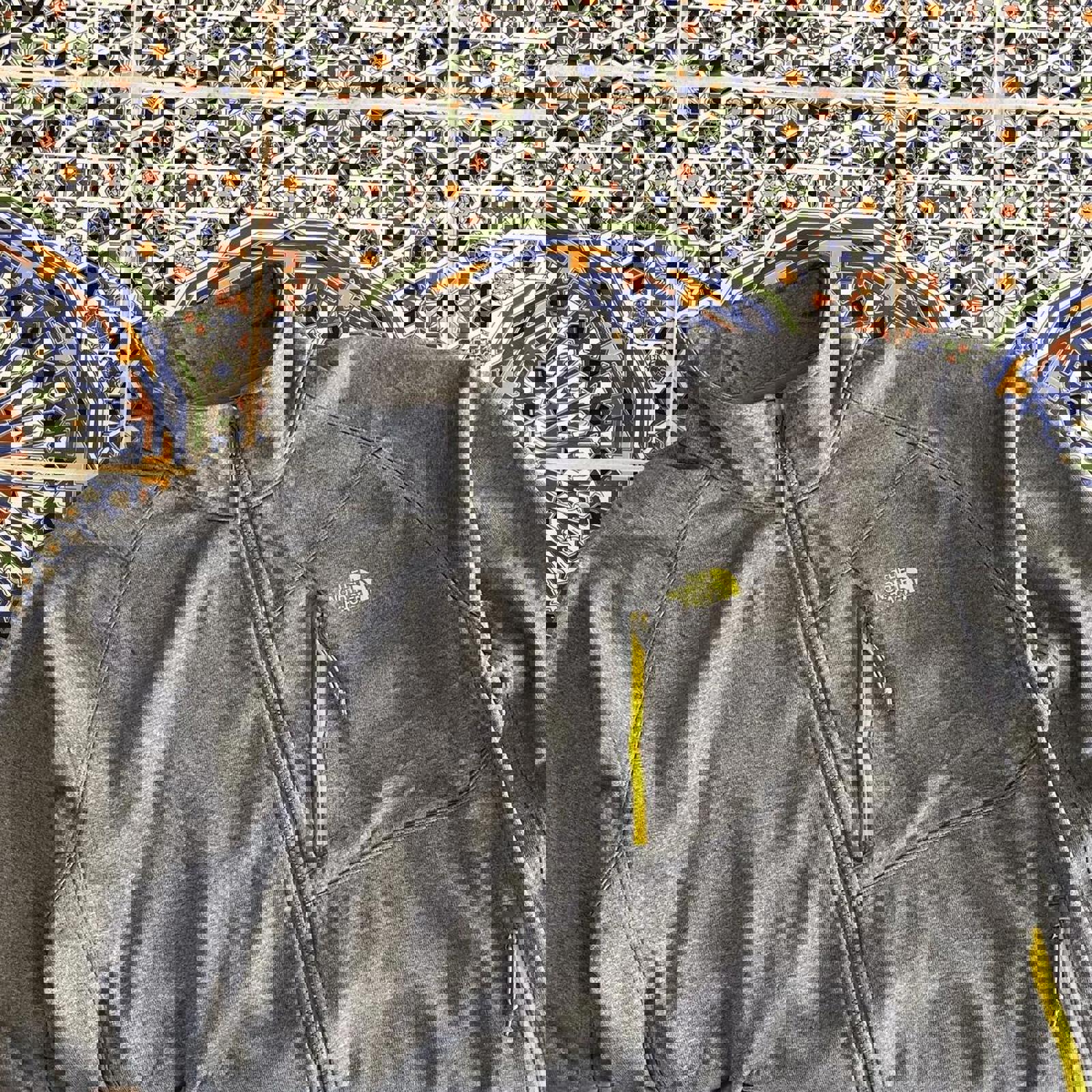 grey north face jacket with detailed zipper, zip-able pockets on the chest and sides with yellow accents accompanying a yellow screen printed north face logo on the chest