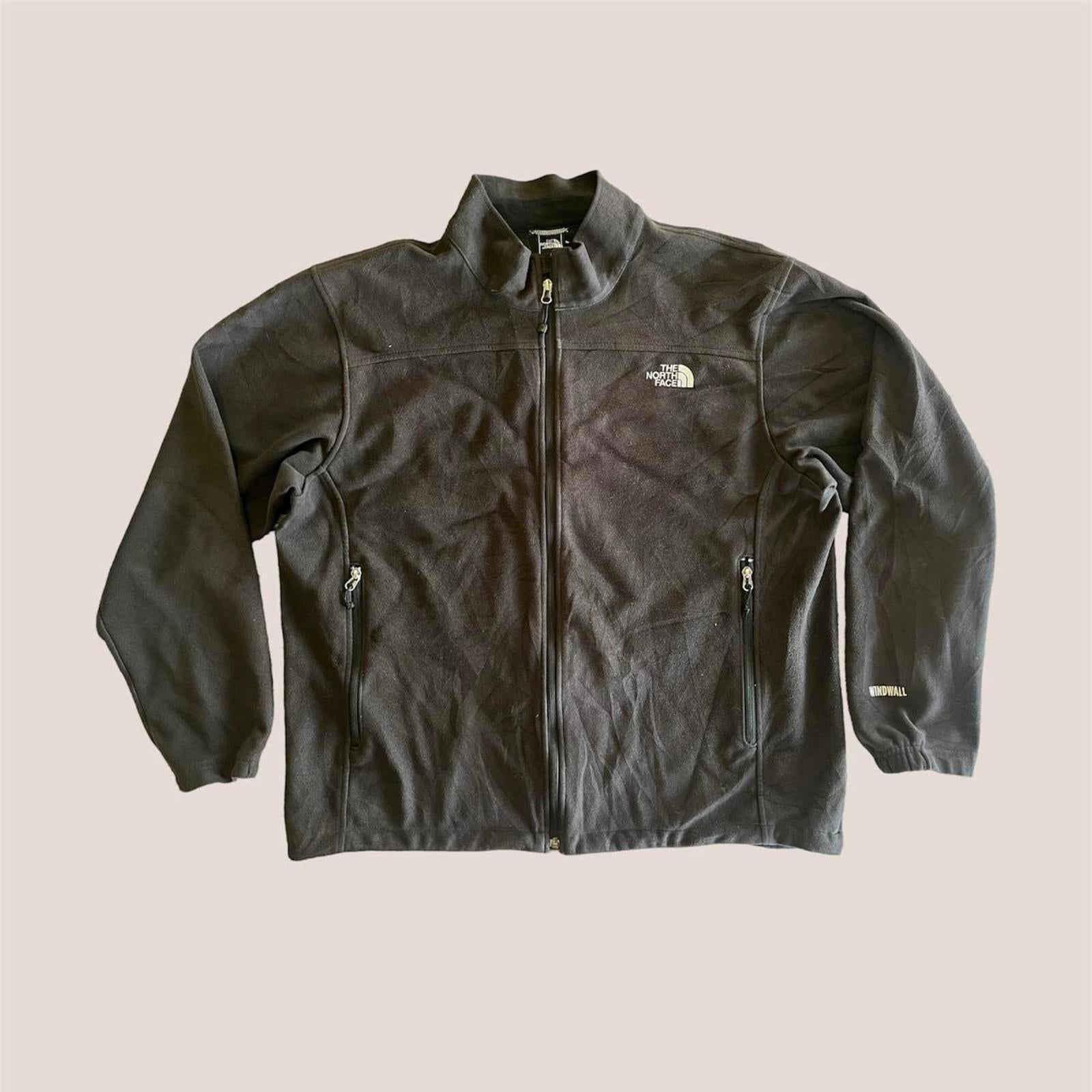 black zip up fleece with zip up side pockets, embroidered north face logo on front and back as well as windfall on the sleeve