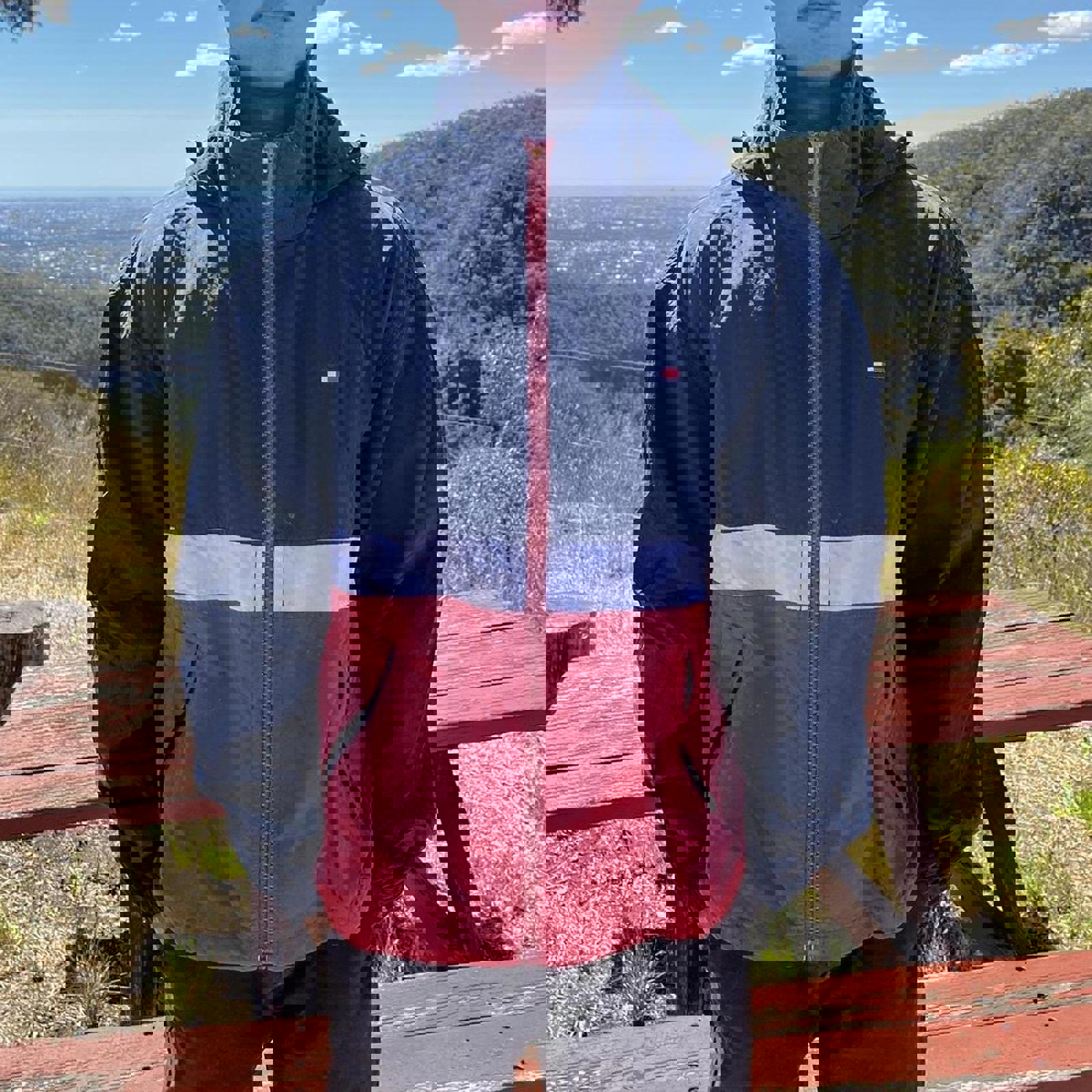 navy, white and red tommy hilfiger yacht jacket with built in hide-able hood