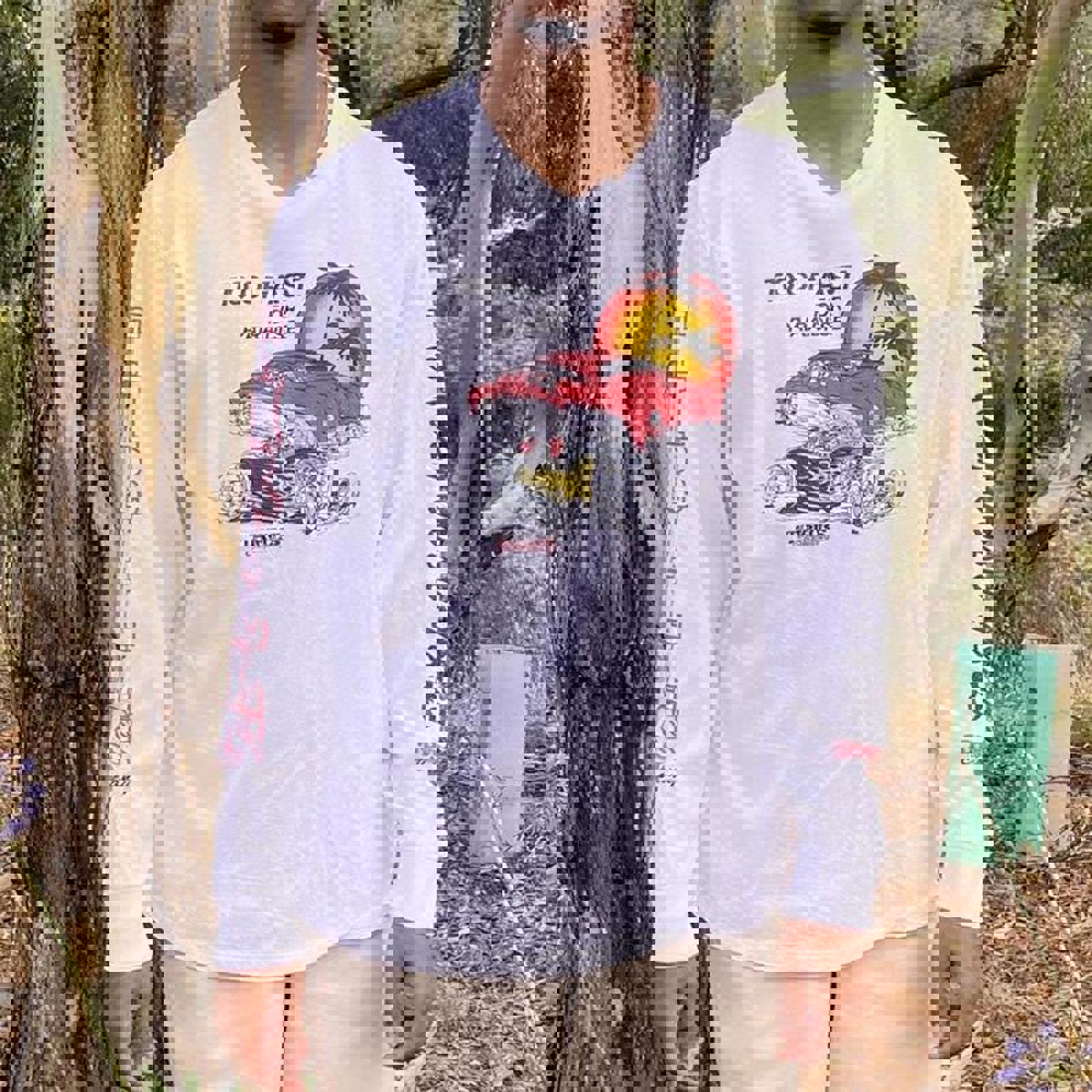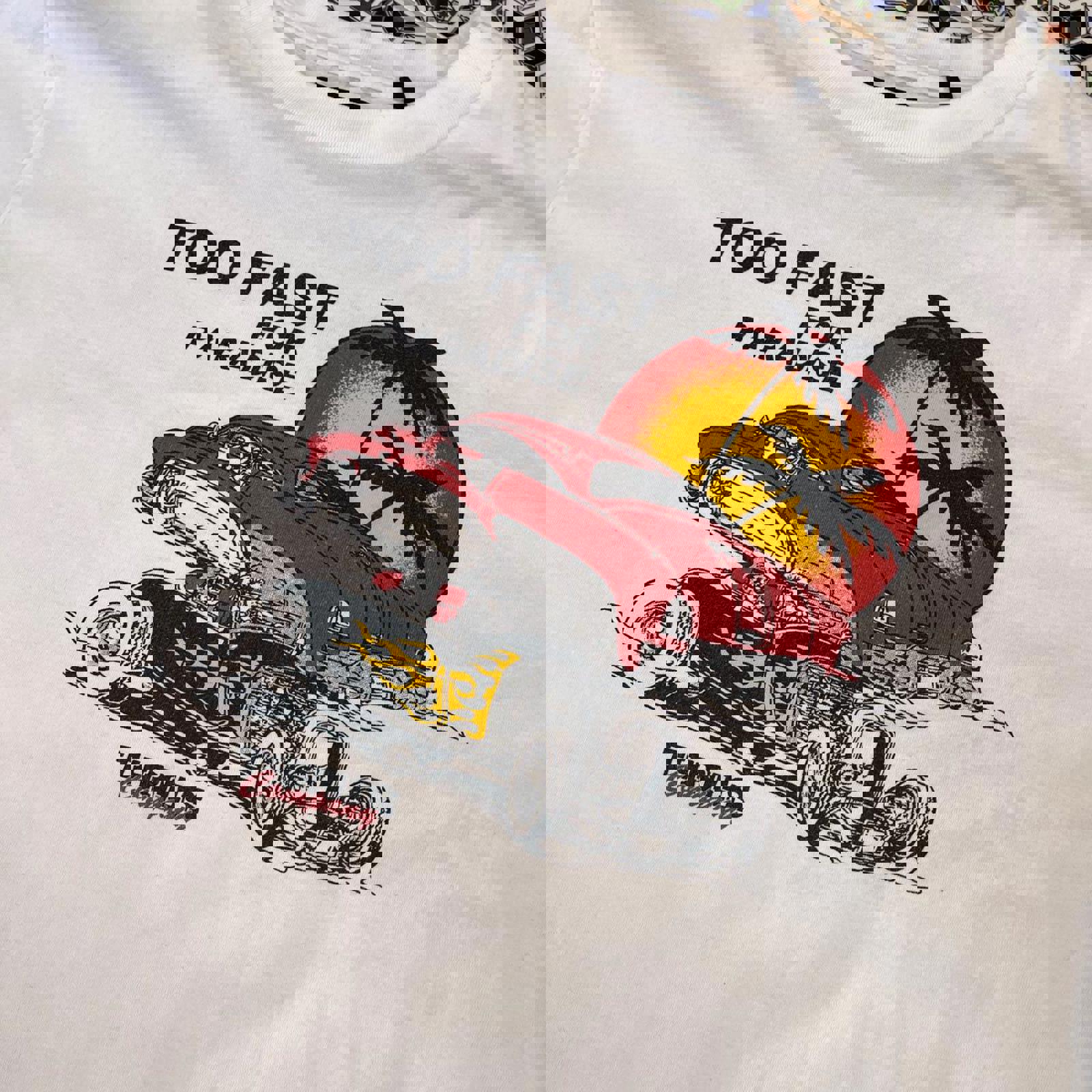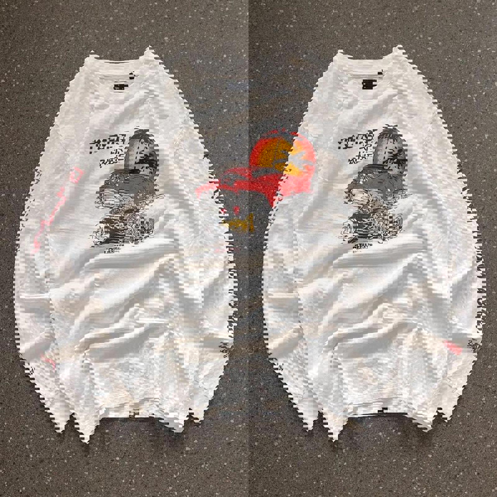 White thrills surf long sleeve tshirt with a red yellow and black hot rod graphic on the front and other black graphics on the sleeves