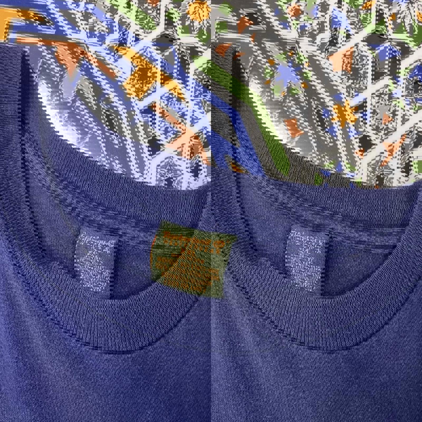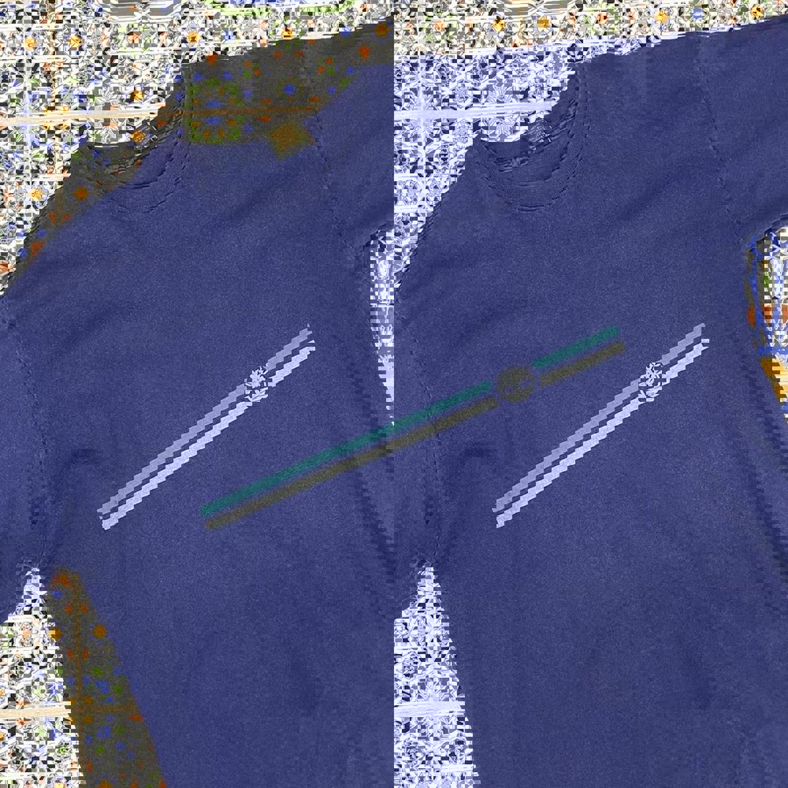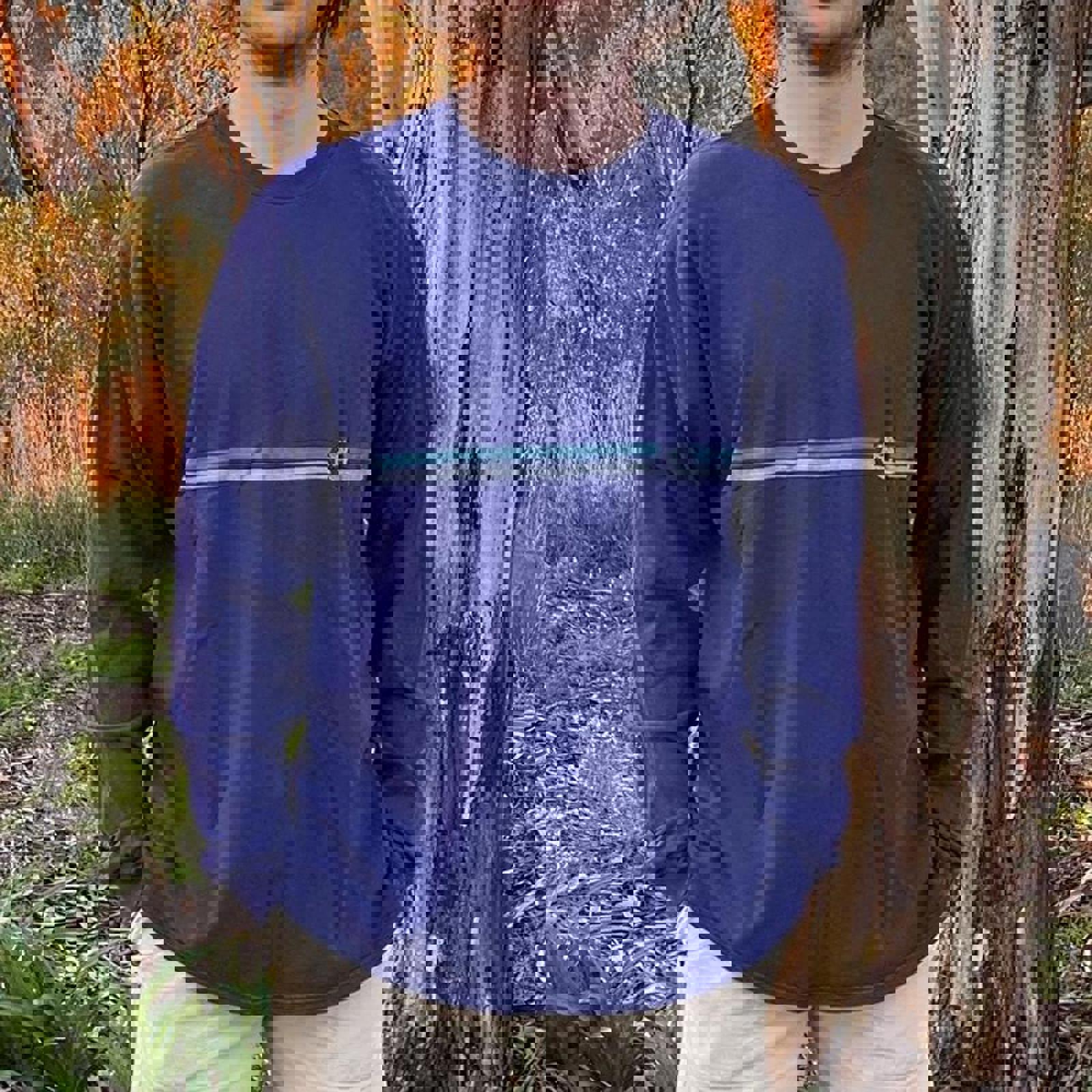 Vintage Navy timberland long sleeve tee with a turquoise and grey graphic on the front