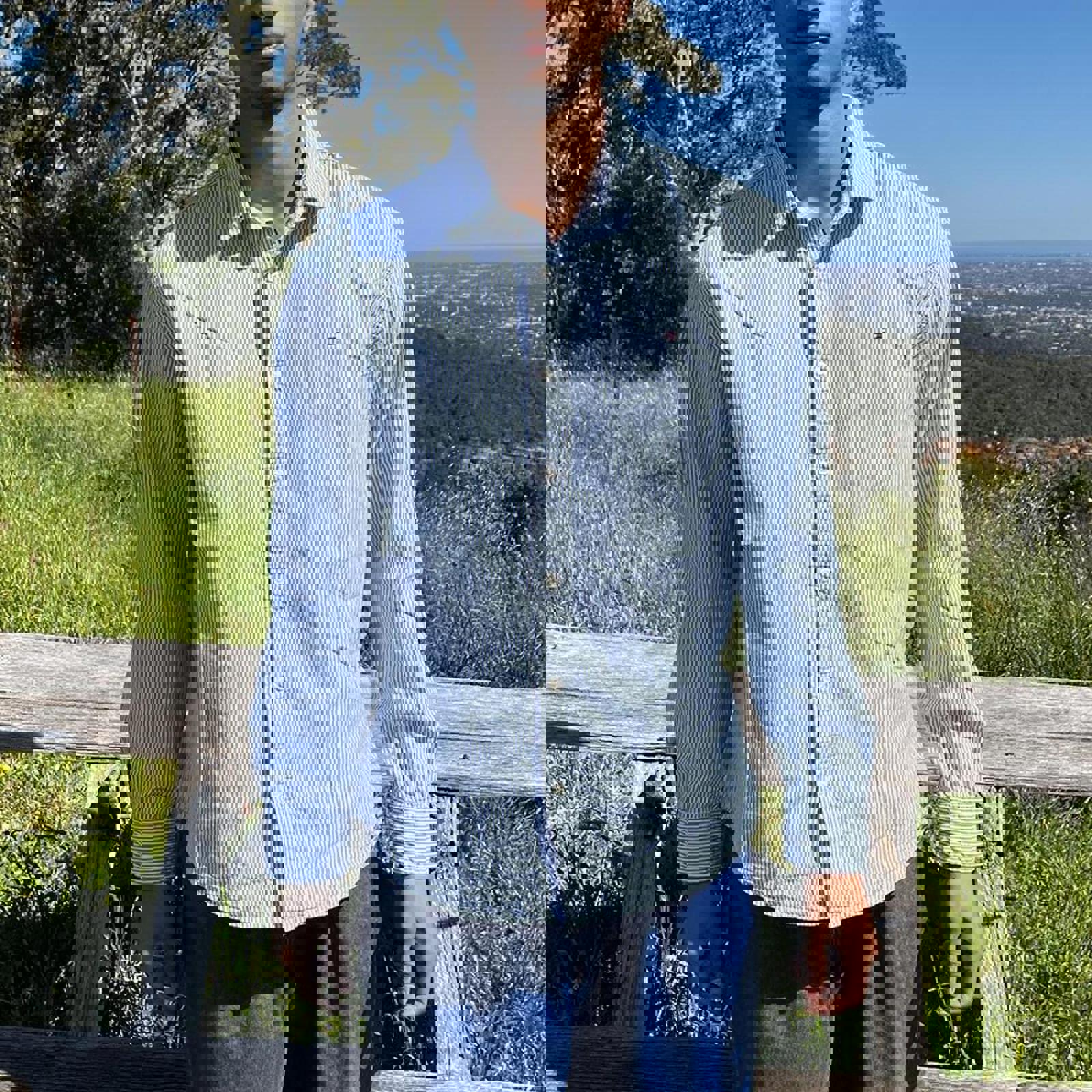 blue and white pinned stripped tommy Hilfiger shirt with embroidered tommy flag logo