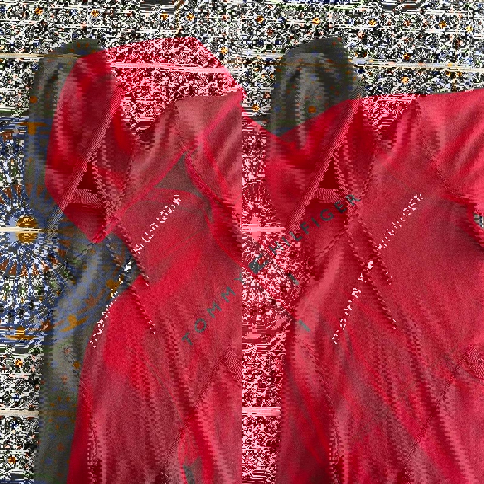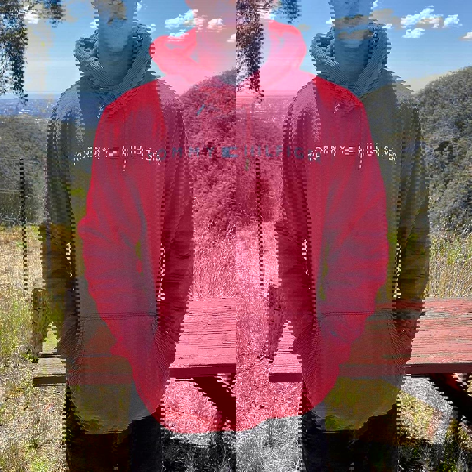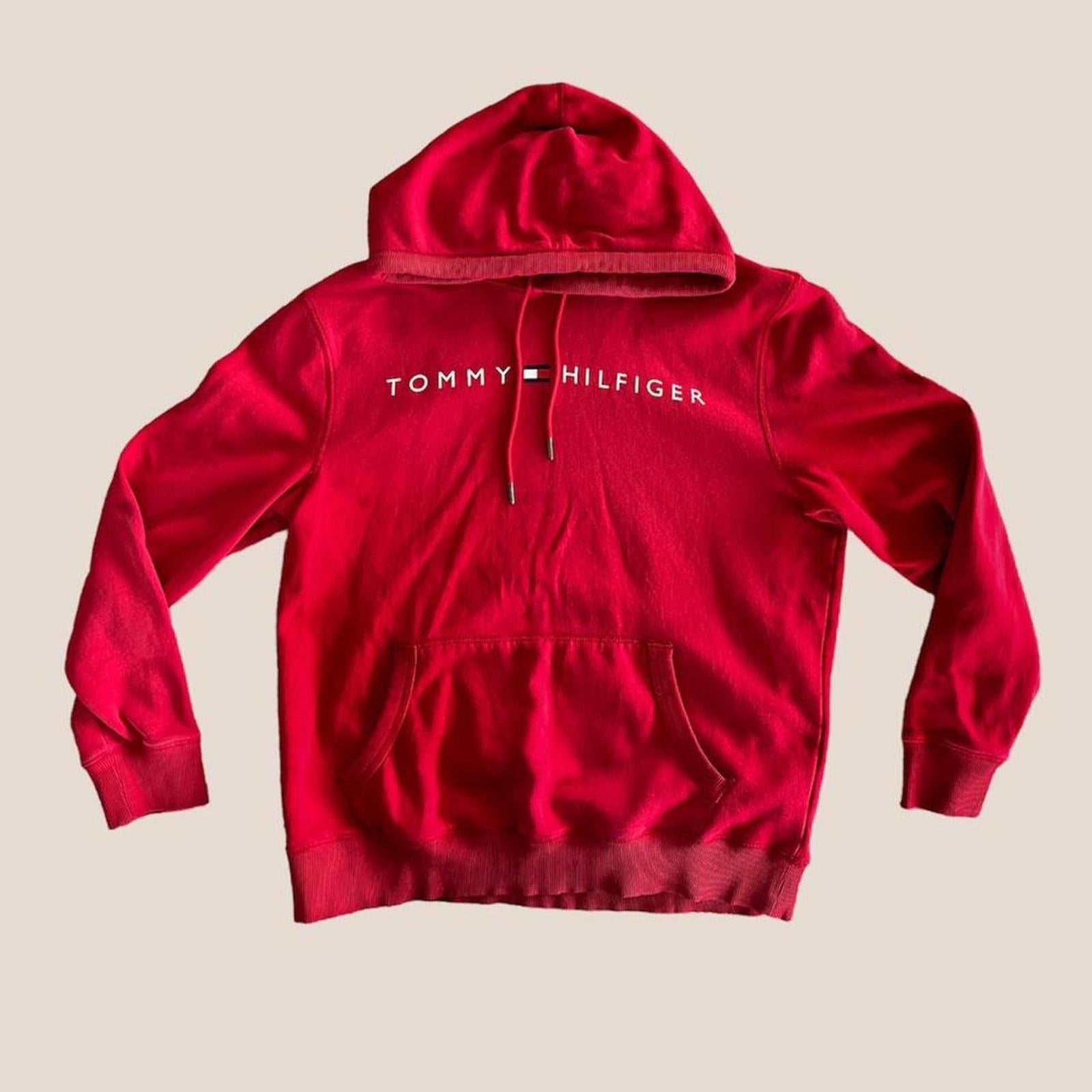 heavy cotton red tommy hoodie with screen printed spell out and flag on the chest