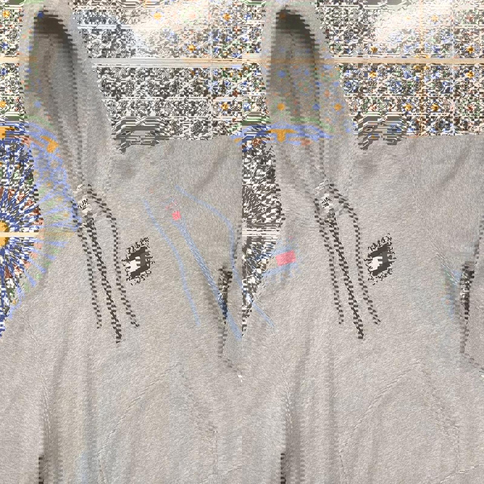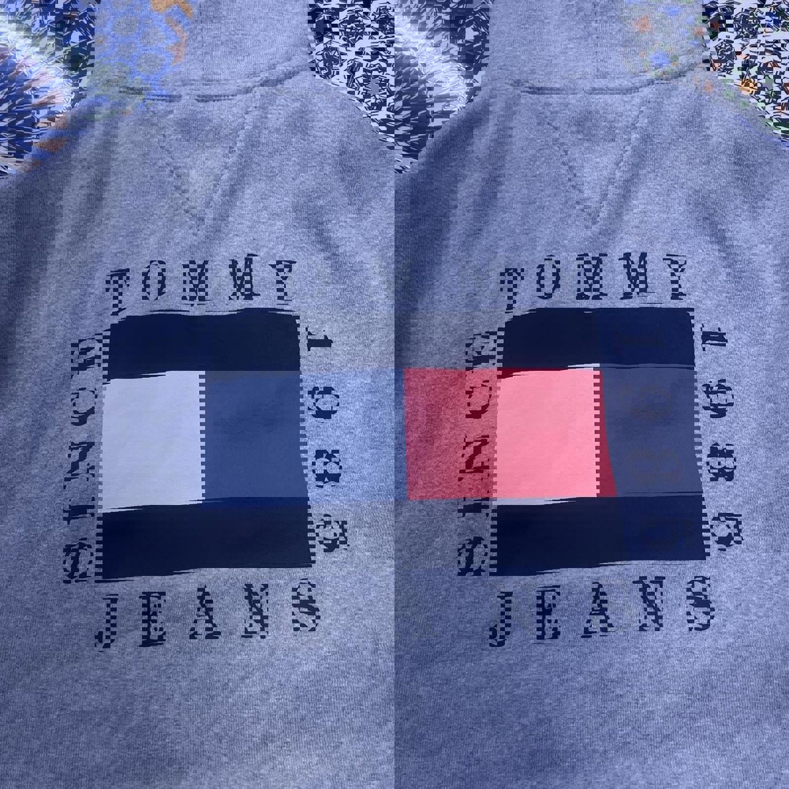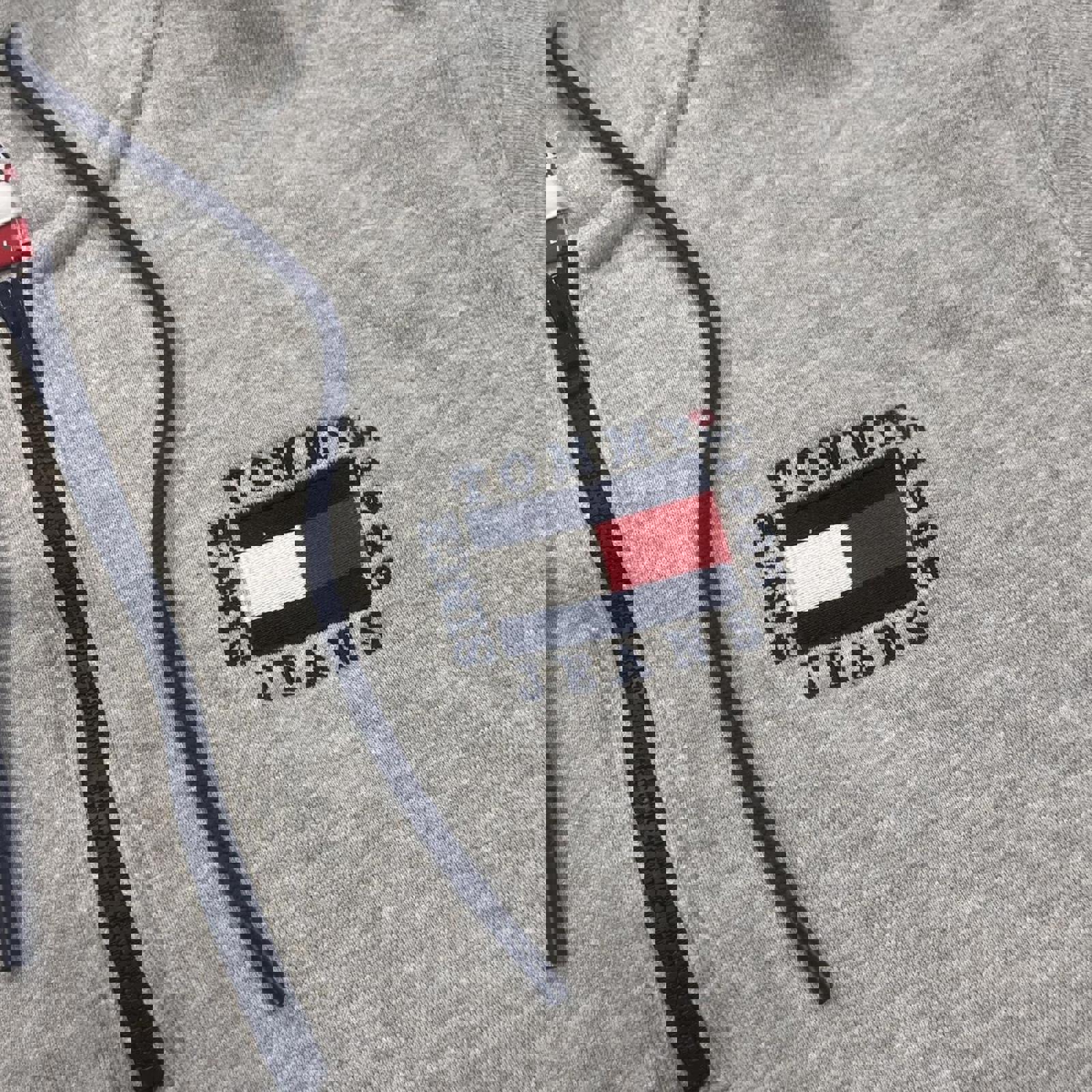 Grey Tommy Hilfiger 1/4 zip hoodie with an embroidered graphic on the chest and the same graphic but printed and larger on the back