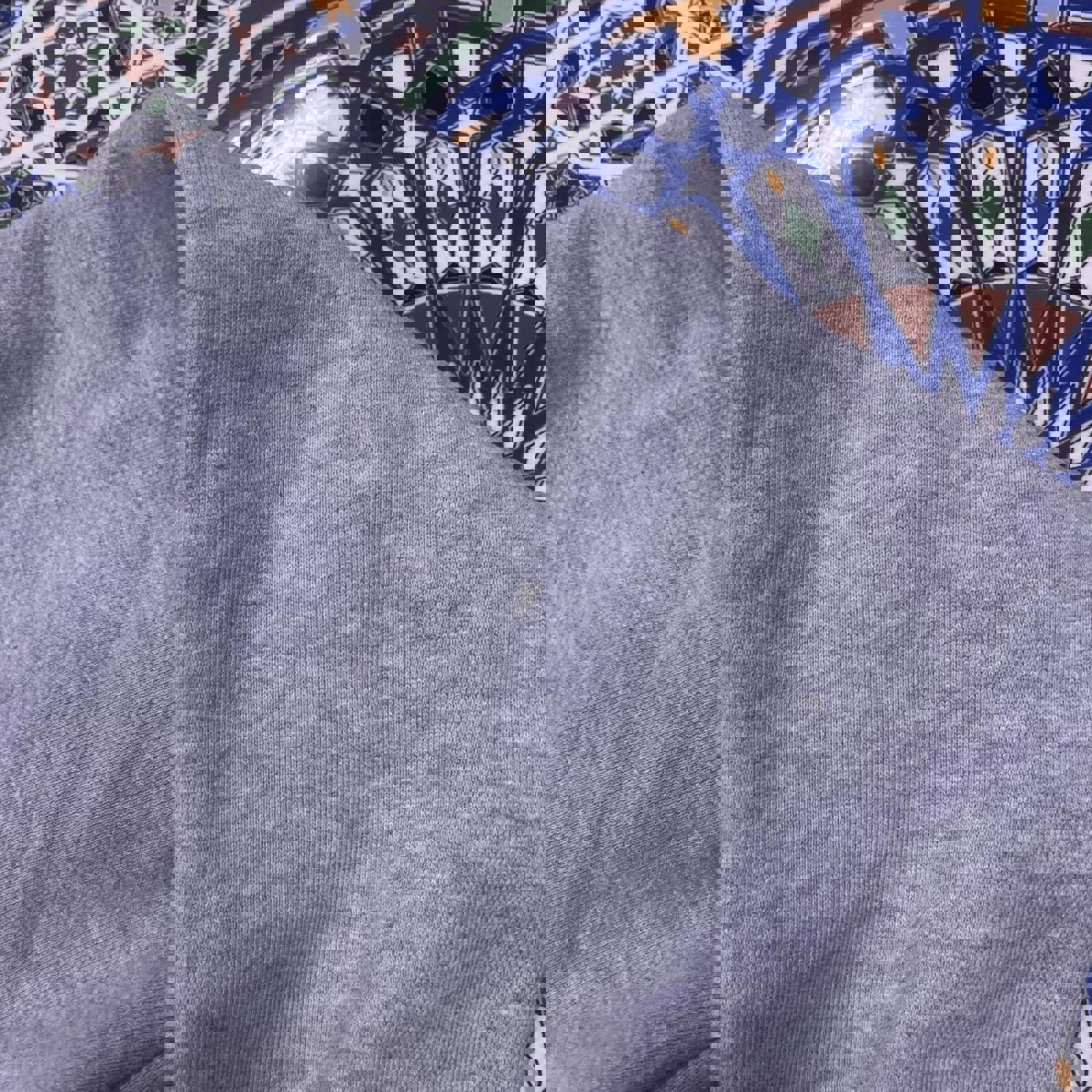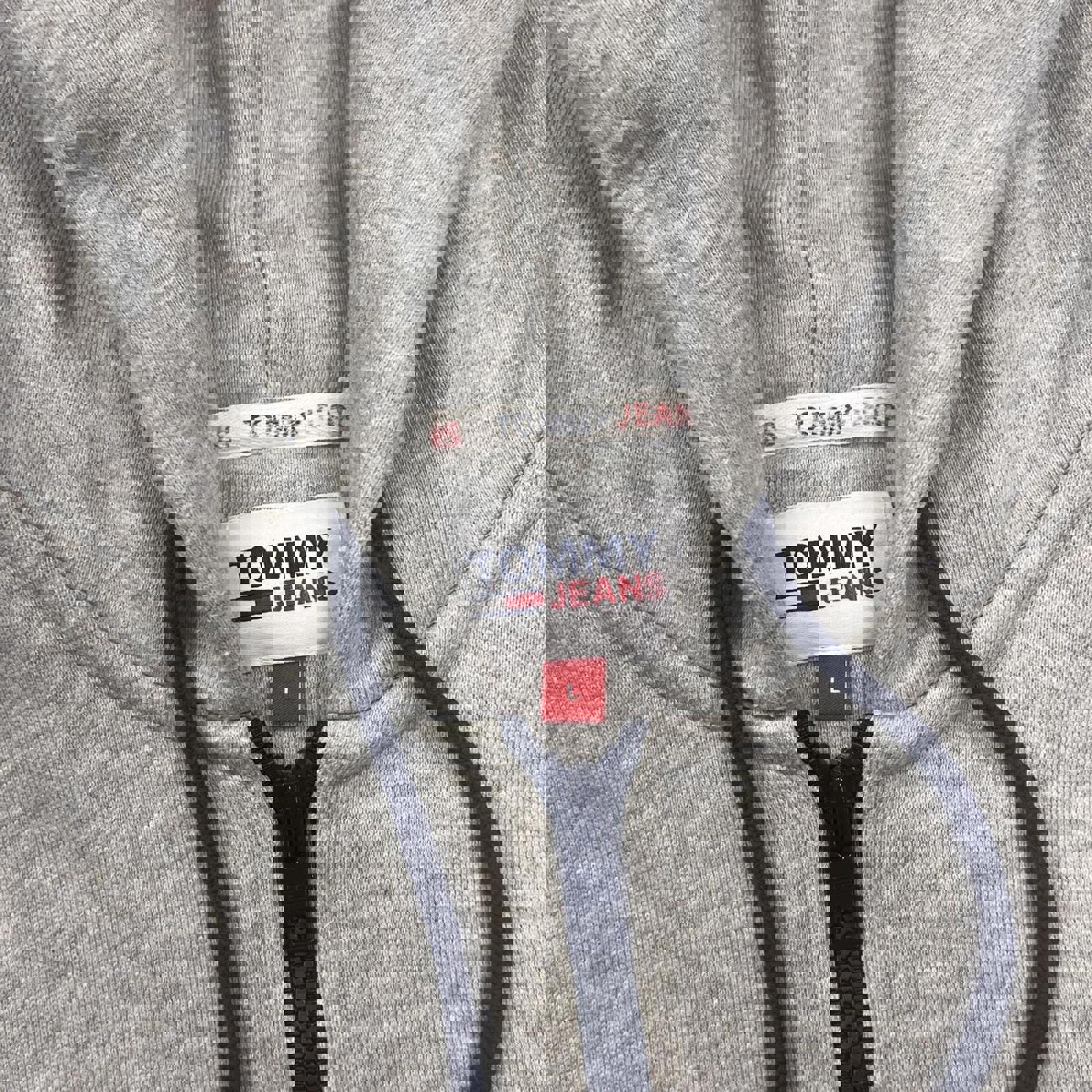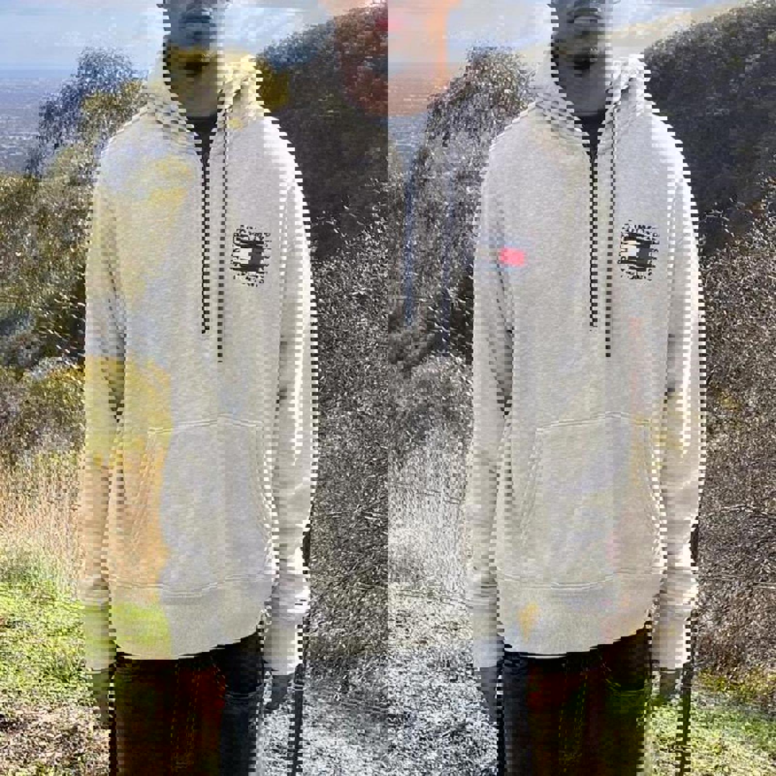 Grey Tommy Hilfiger 1/4 zip hoodie with an embroidered graphic on the chest and the same graphic but printed and larger on the back