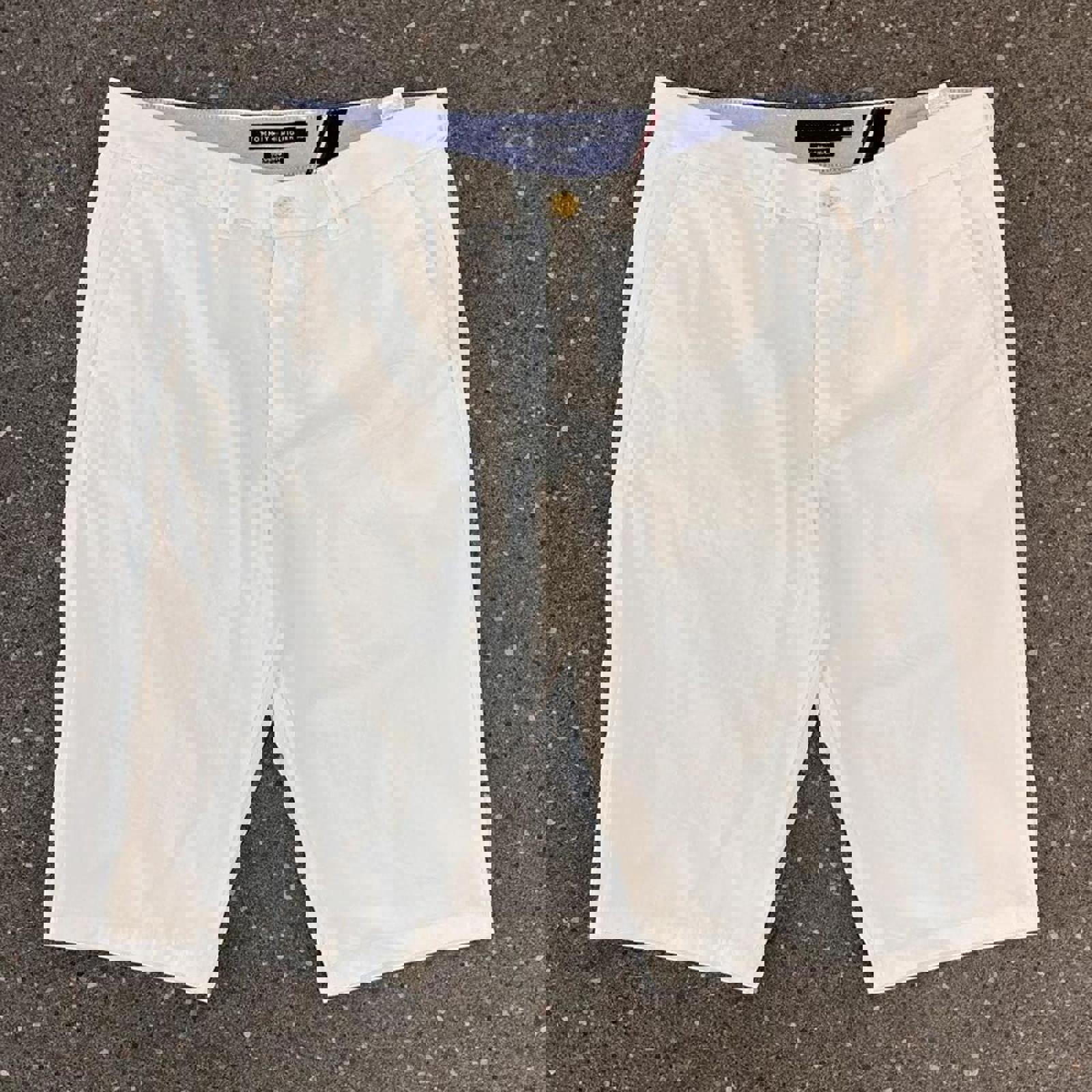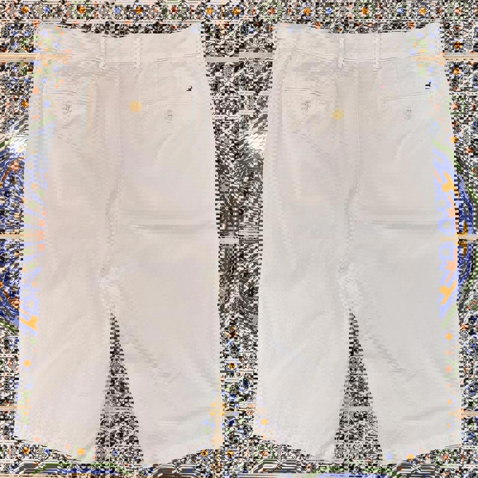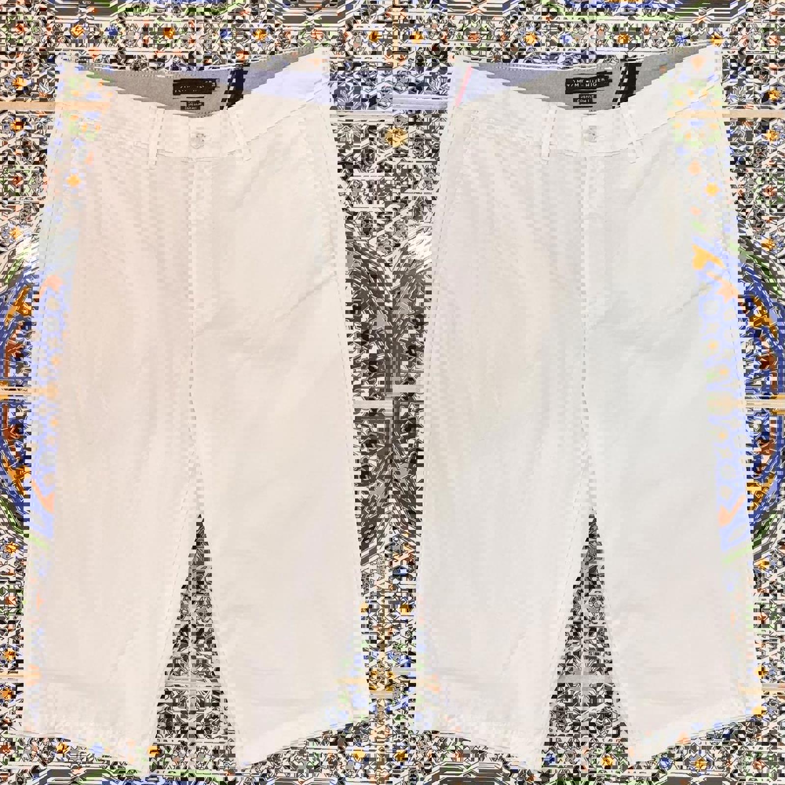 white tommy shorts with an embroidered tommy flag on the back hip