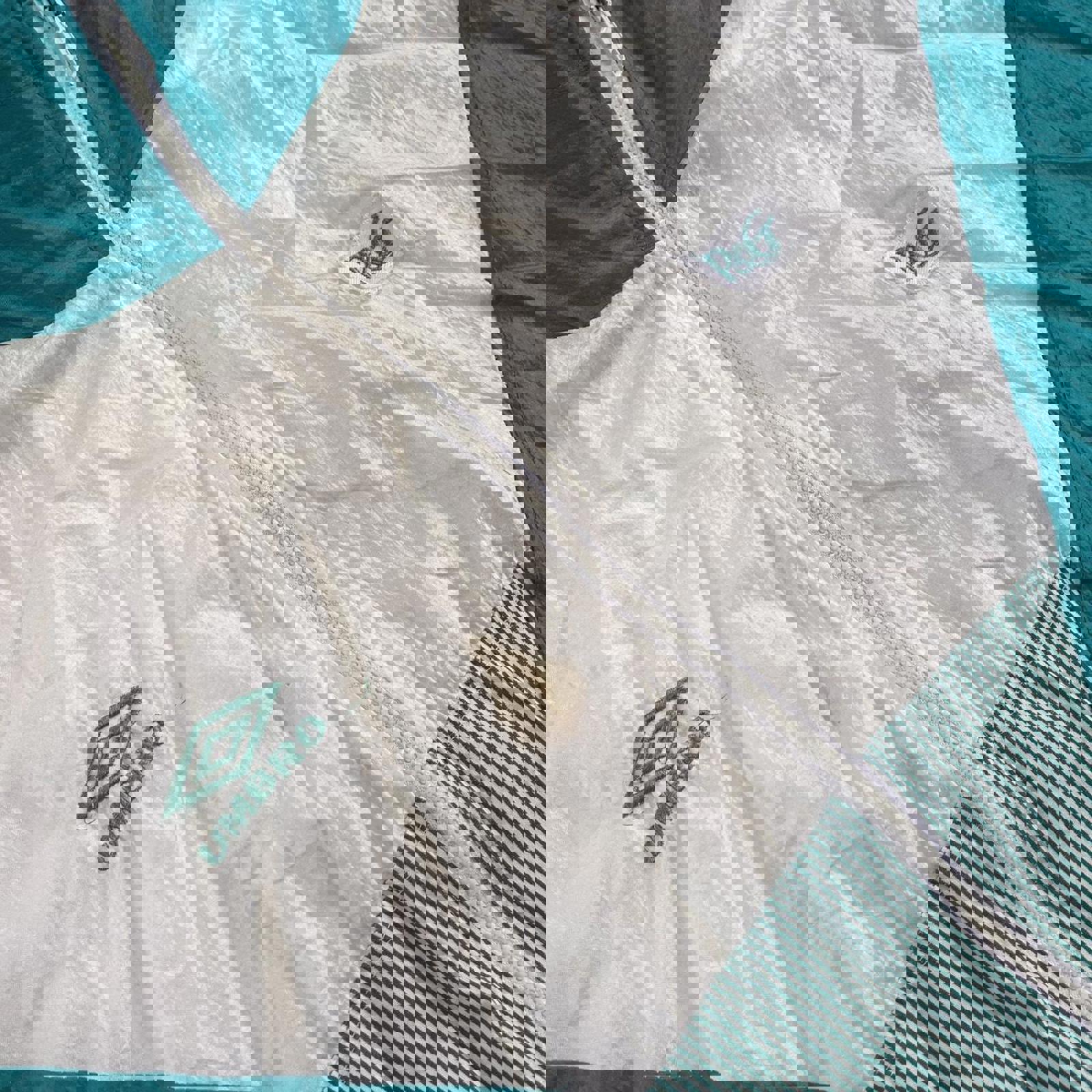 White and green umbro windbreaker jacket with a p&g patch and embroidered umbro on the front and the umbro patterned logo down the sleeves