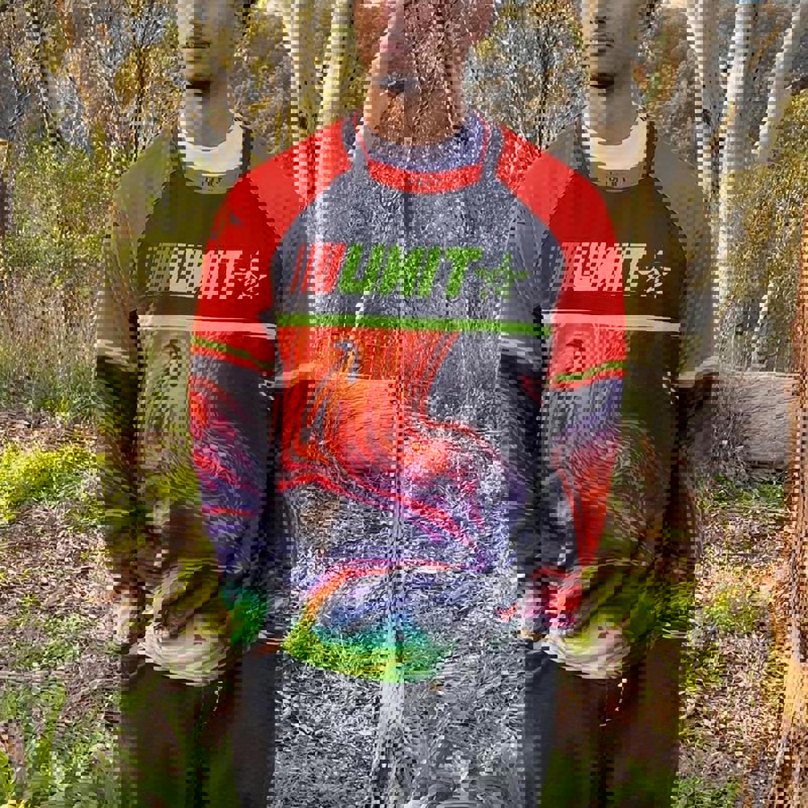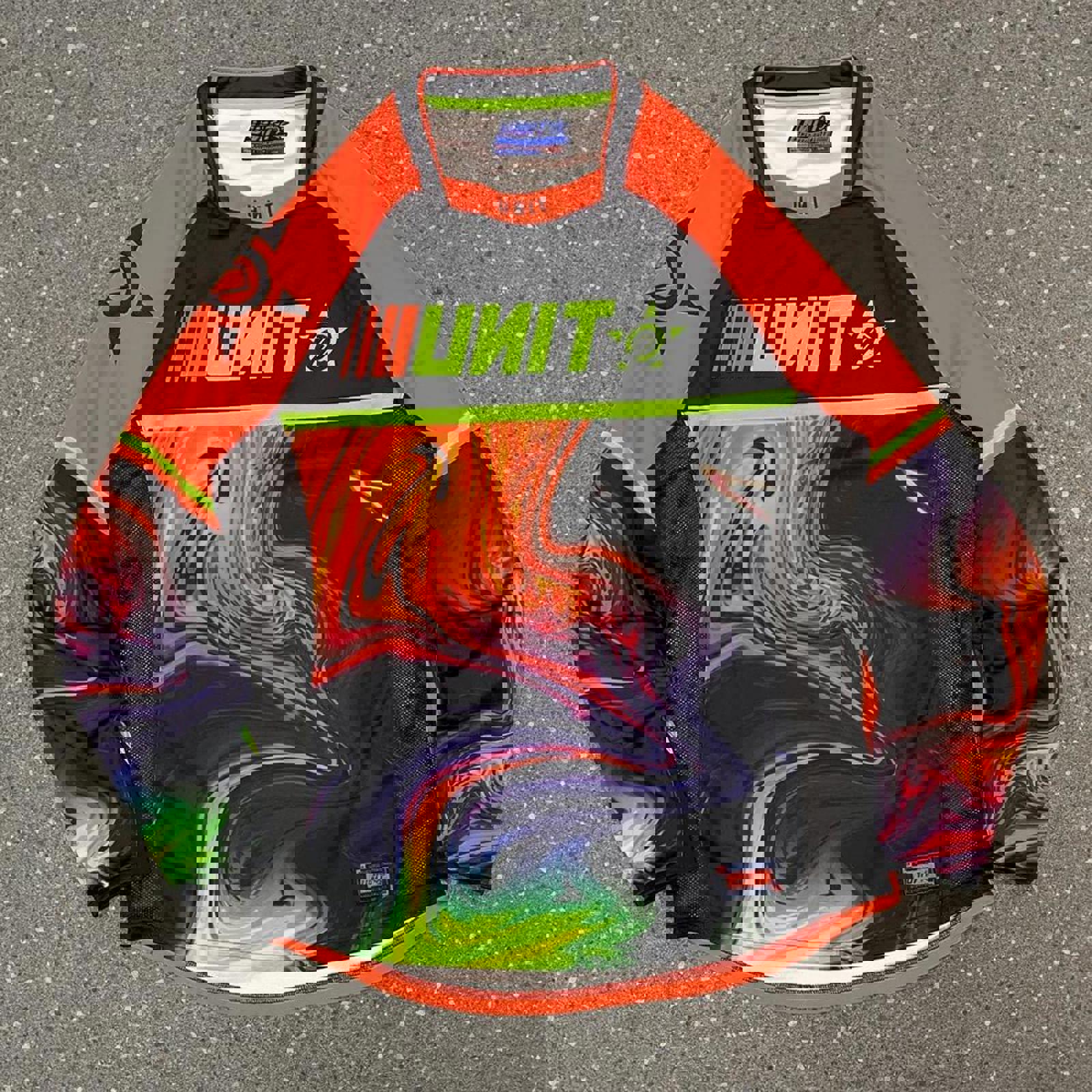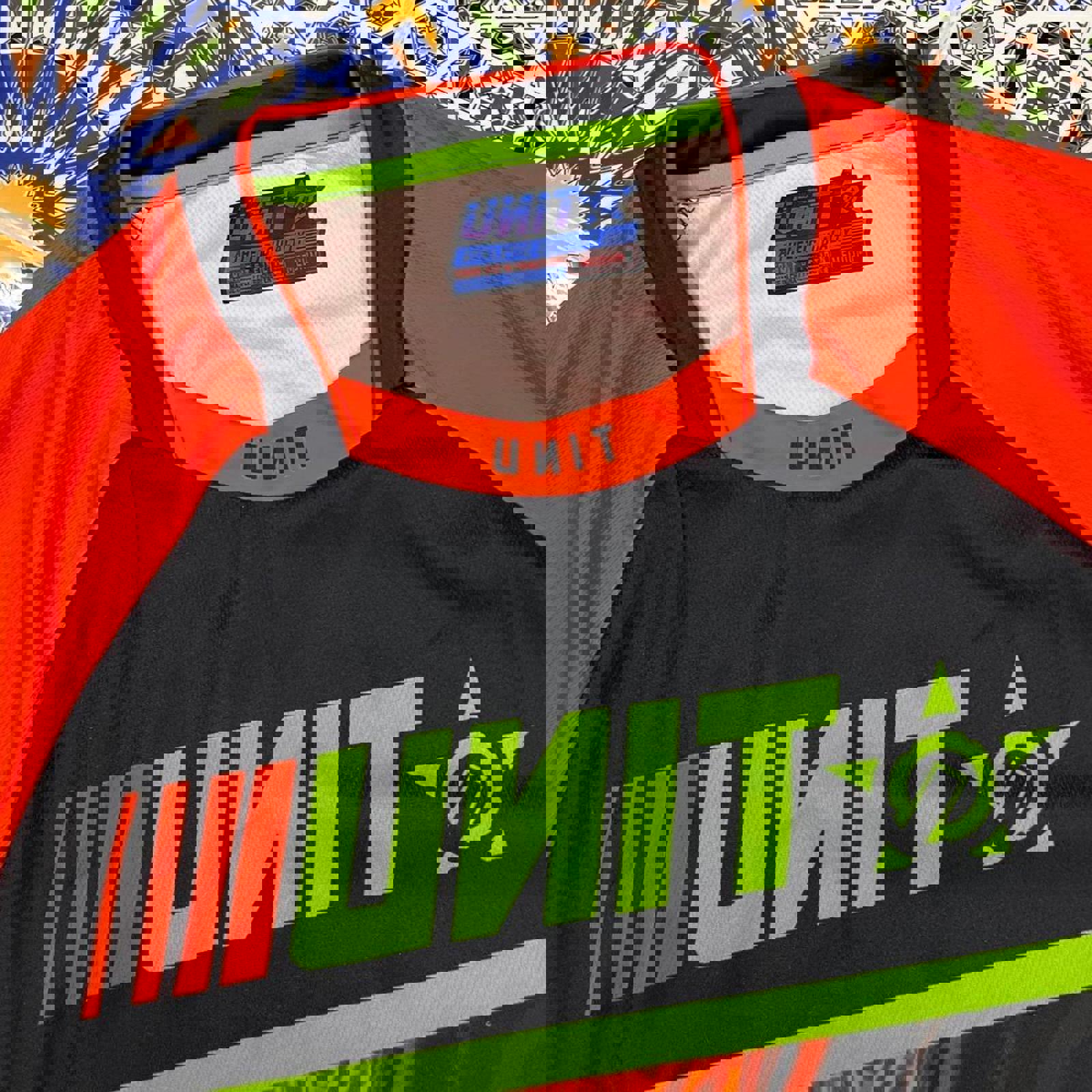 Orange, blue, green, purple and black all over print unit bike jersey with a patch on the hip
