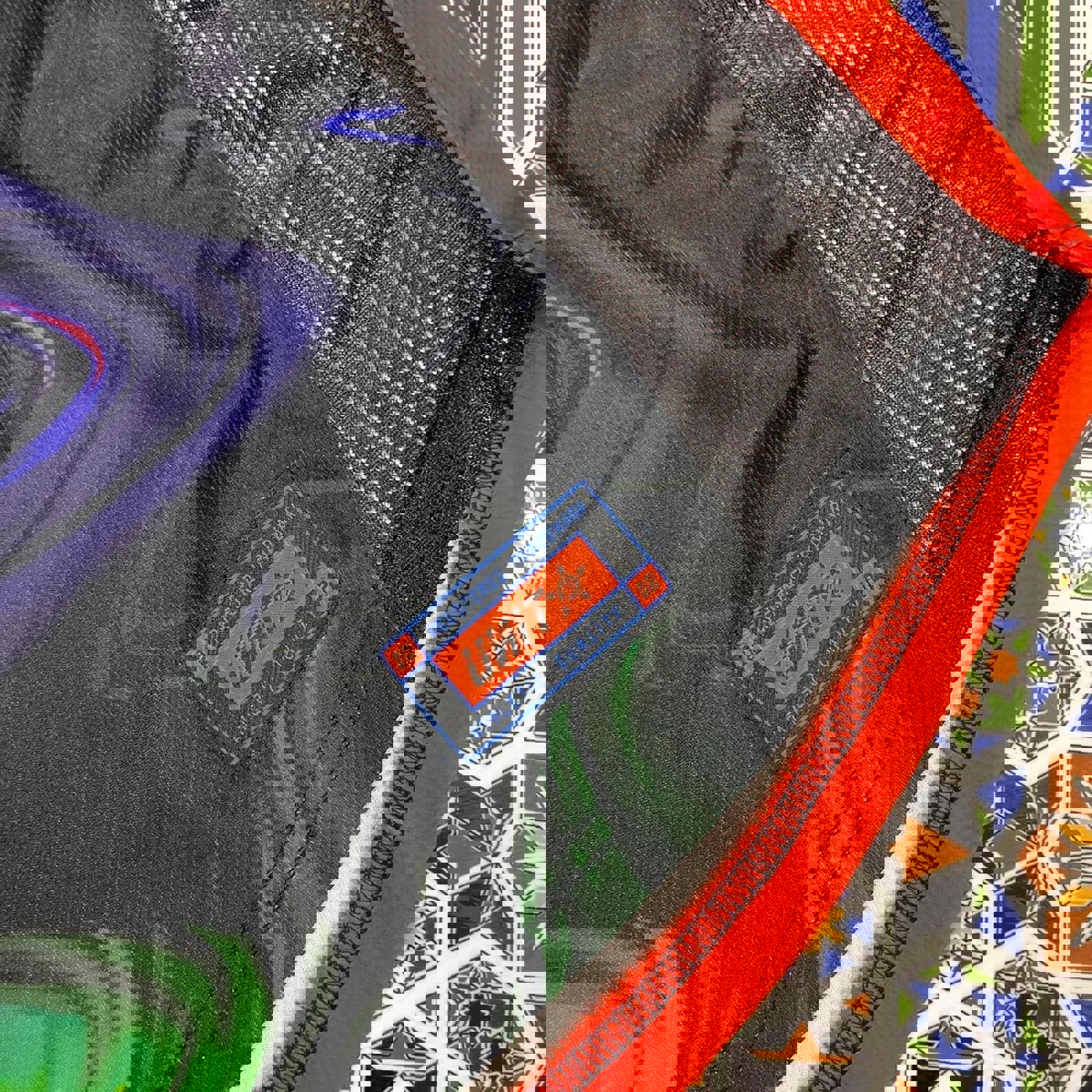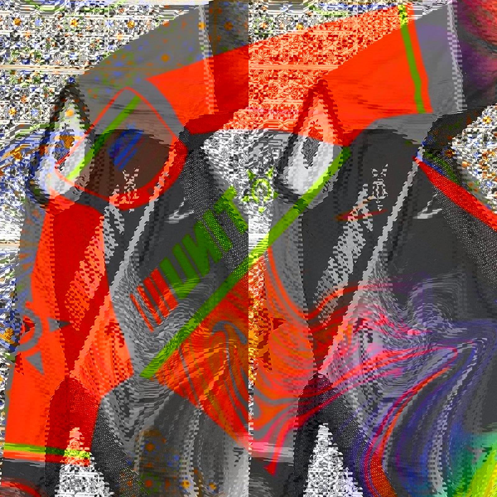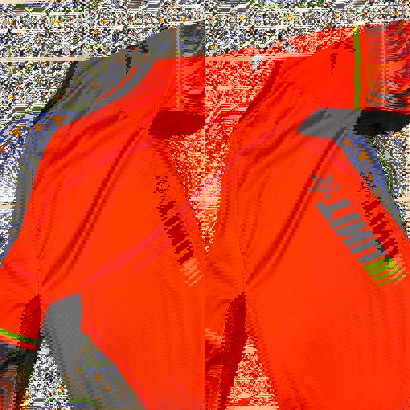 Orange, blue, green, purple and black all over print unit bike jersey with a patch on the hip