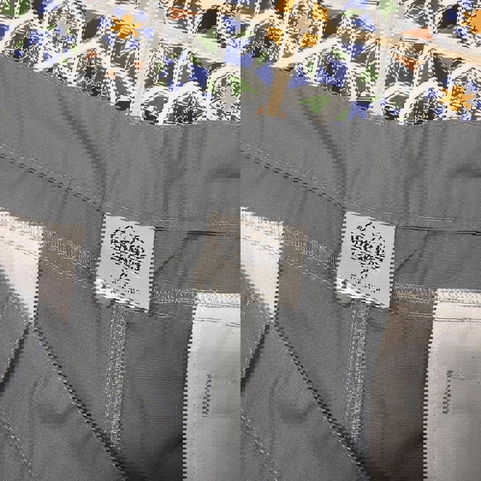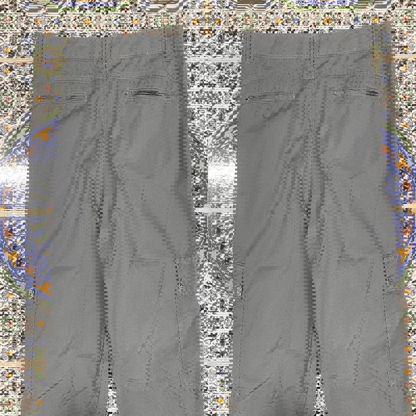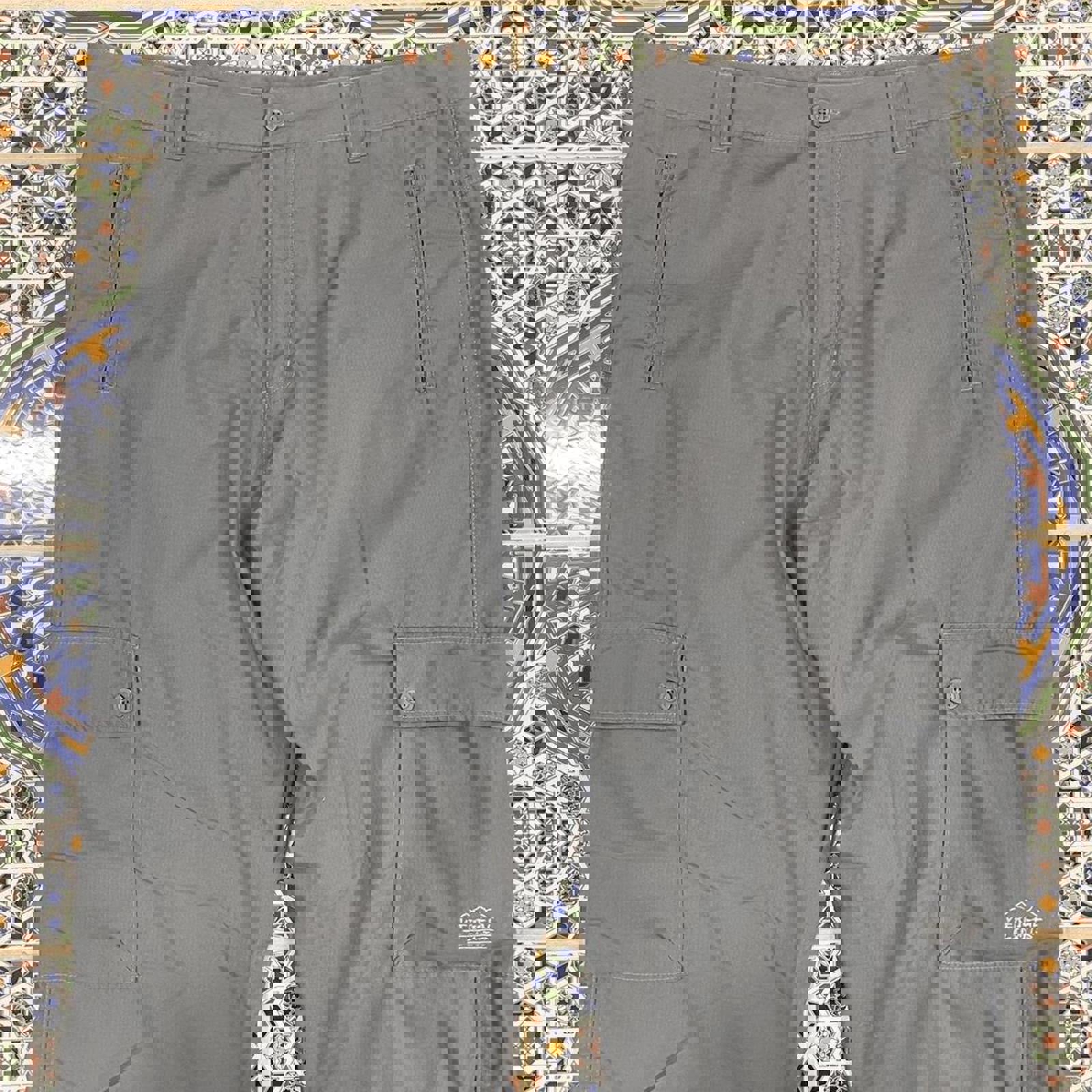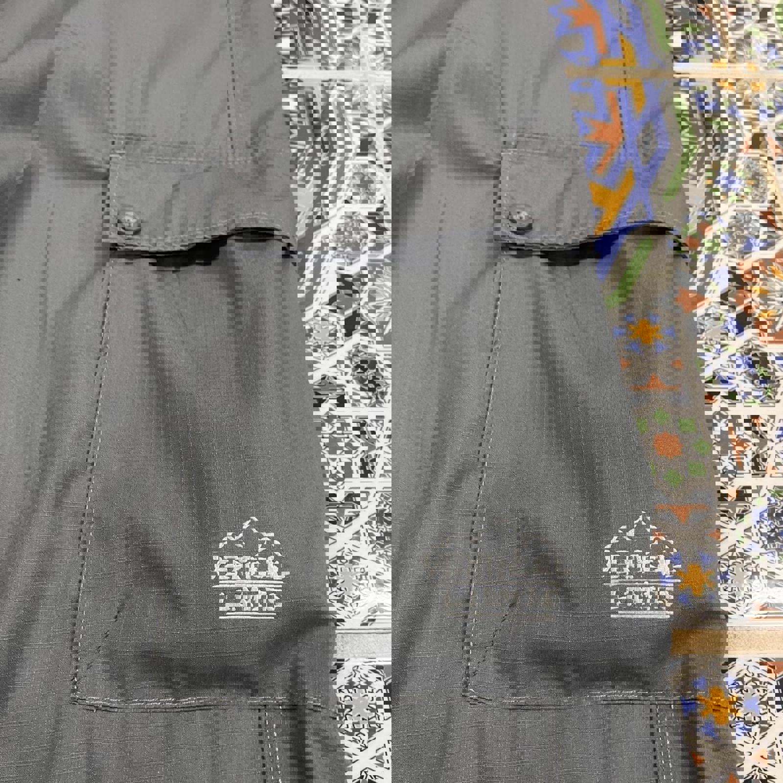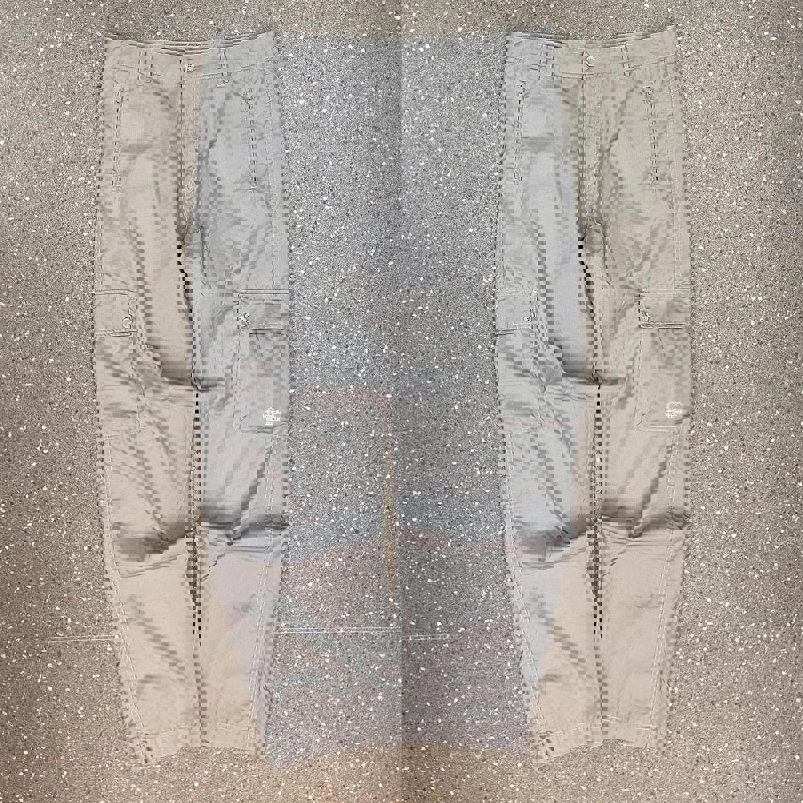Grey vertical limits cargo adventure pants with a graphic on the cargo pocket