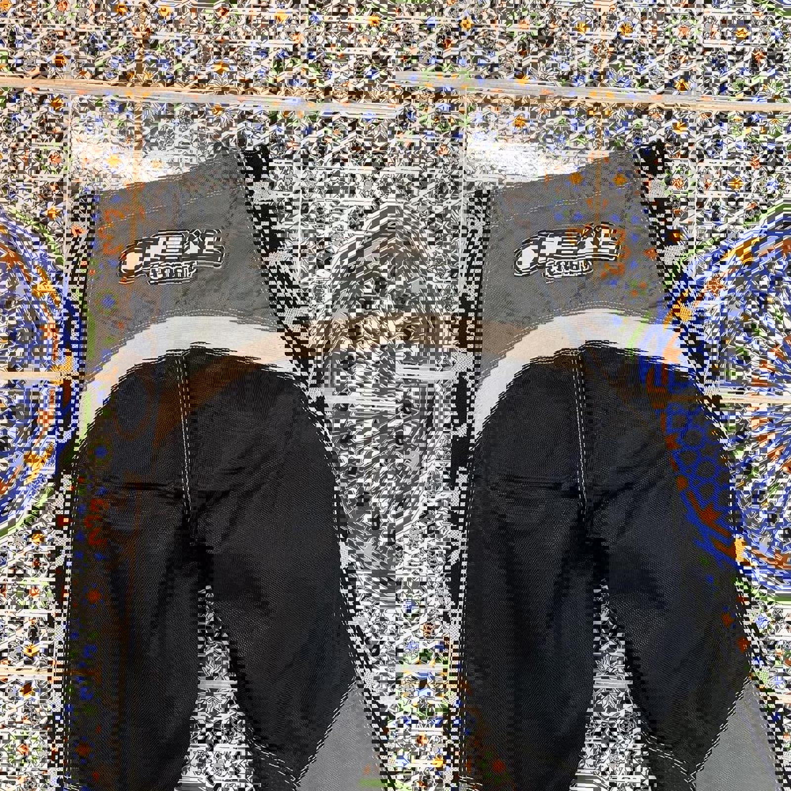 green, black and white o'neal pants with protection included, spell outs running down the legs and one on the bum