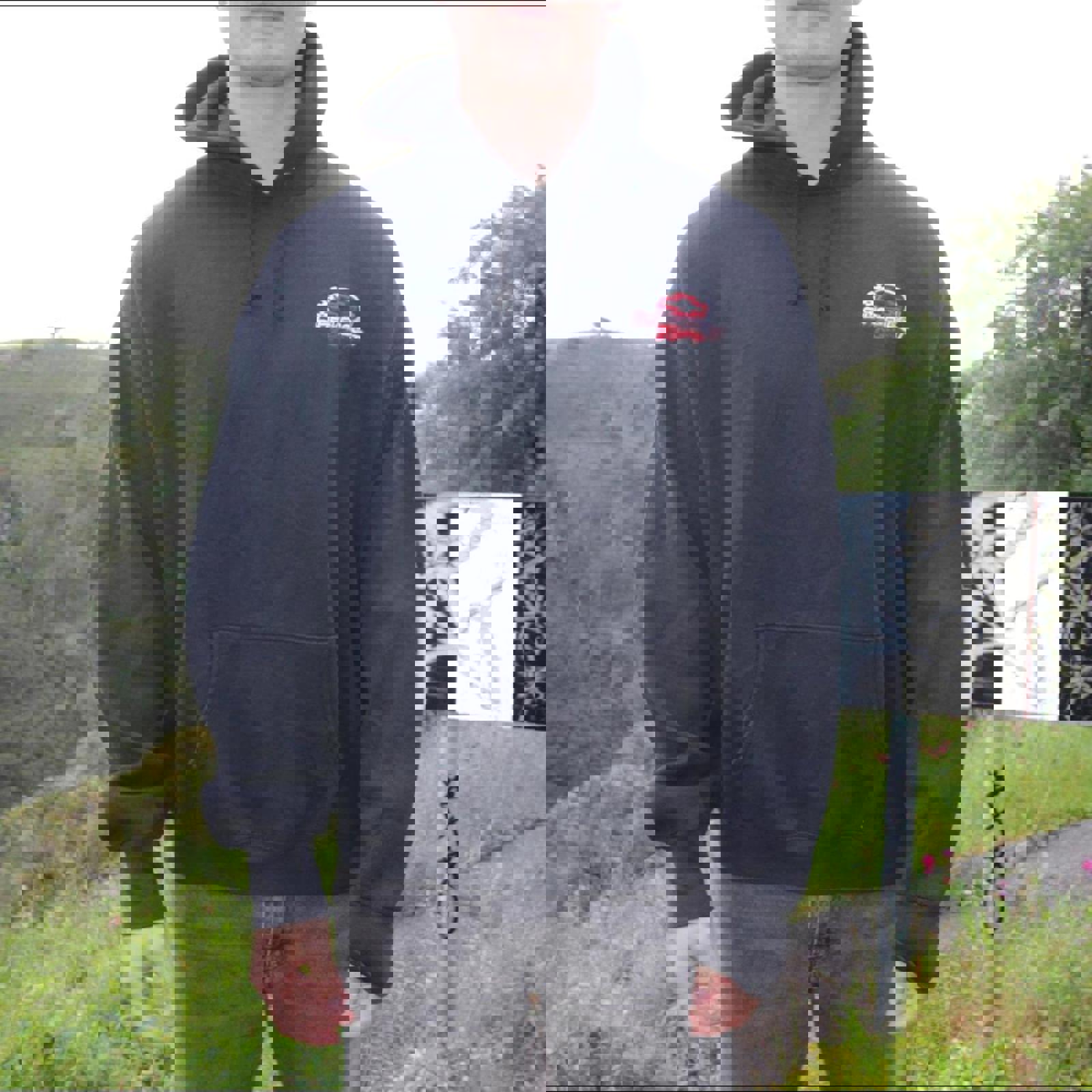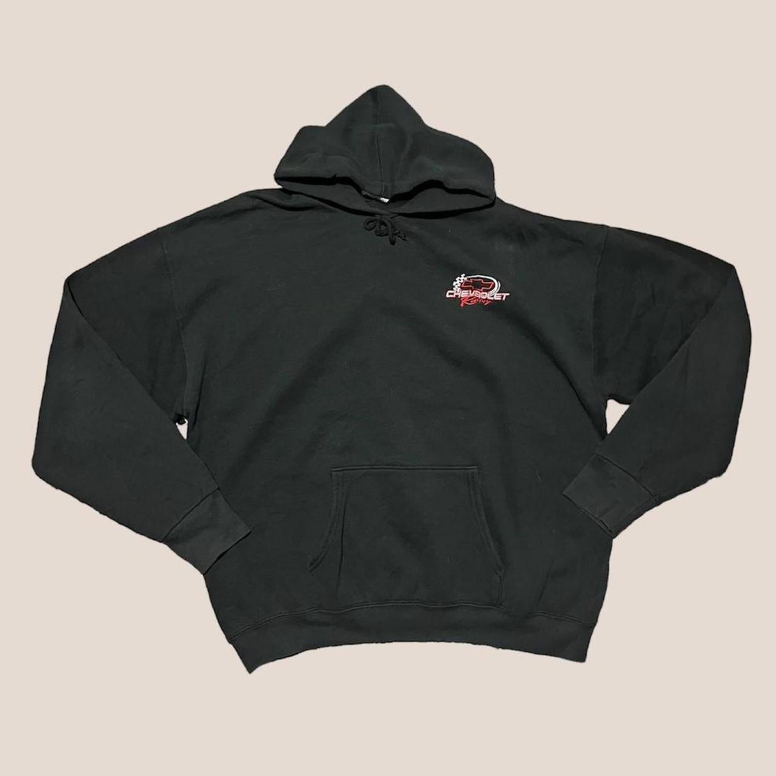 boxy fit black hoodie on fruit of the loom tag with clean embroidered Chevrolet racing graphic on chest