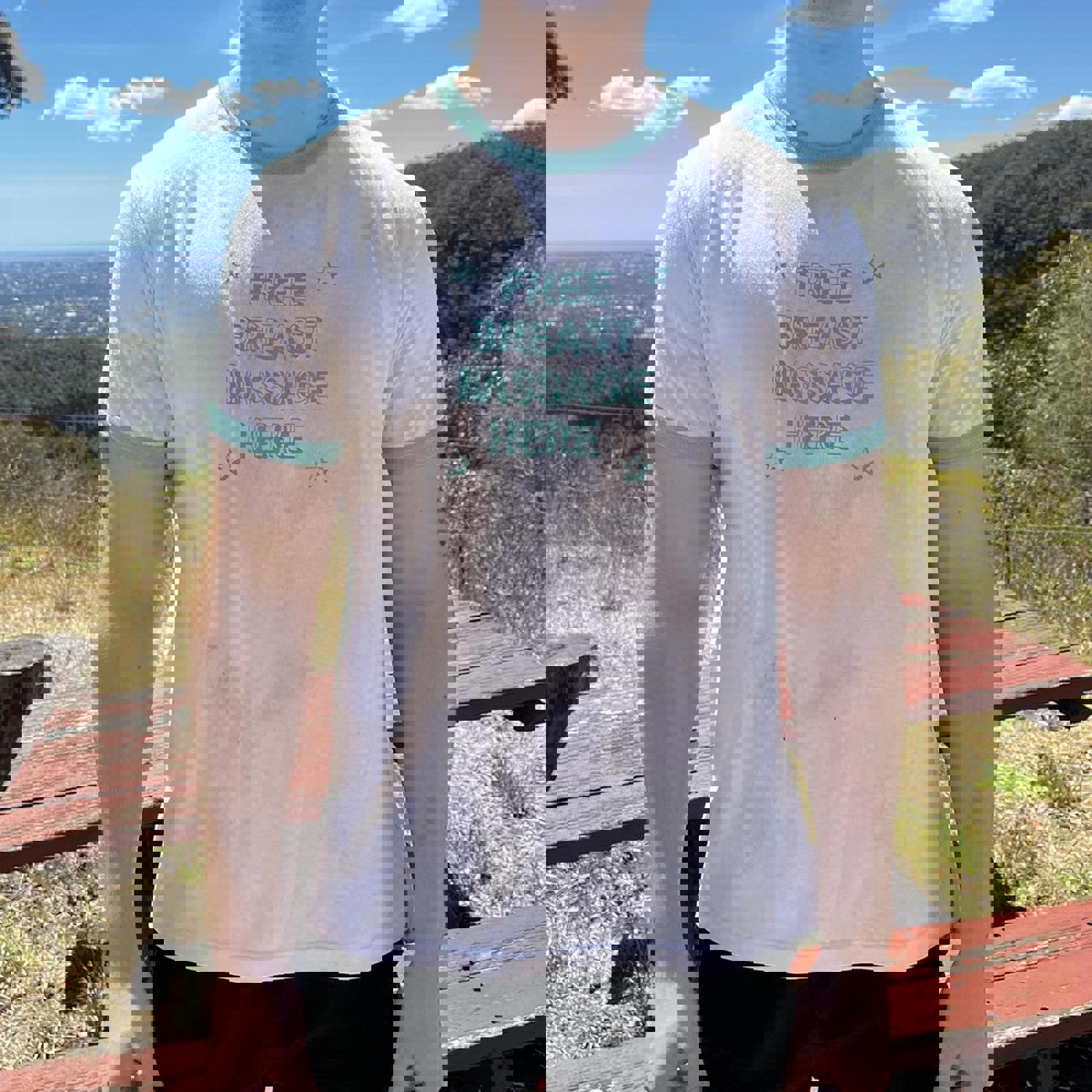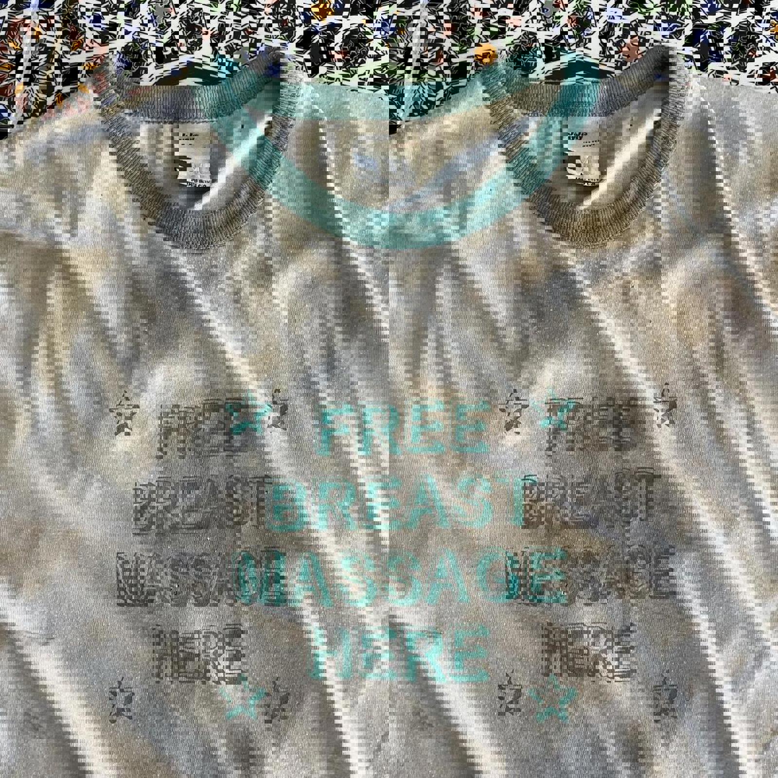 white tee with green cuffs and green "free breast massage here" graphic on the front