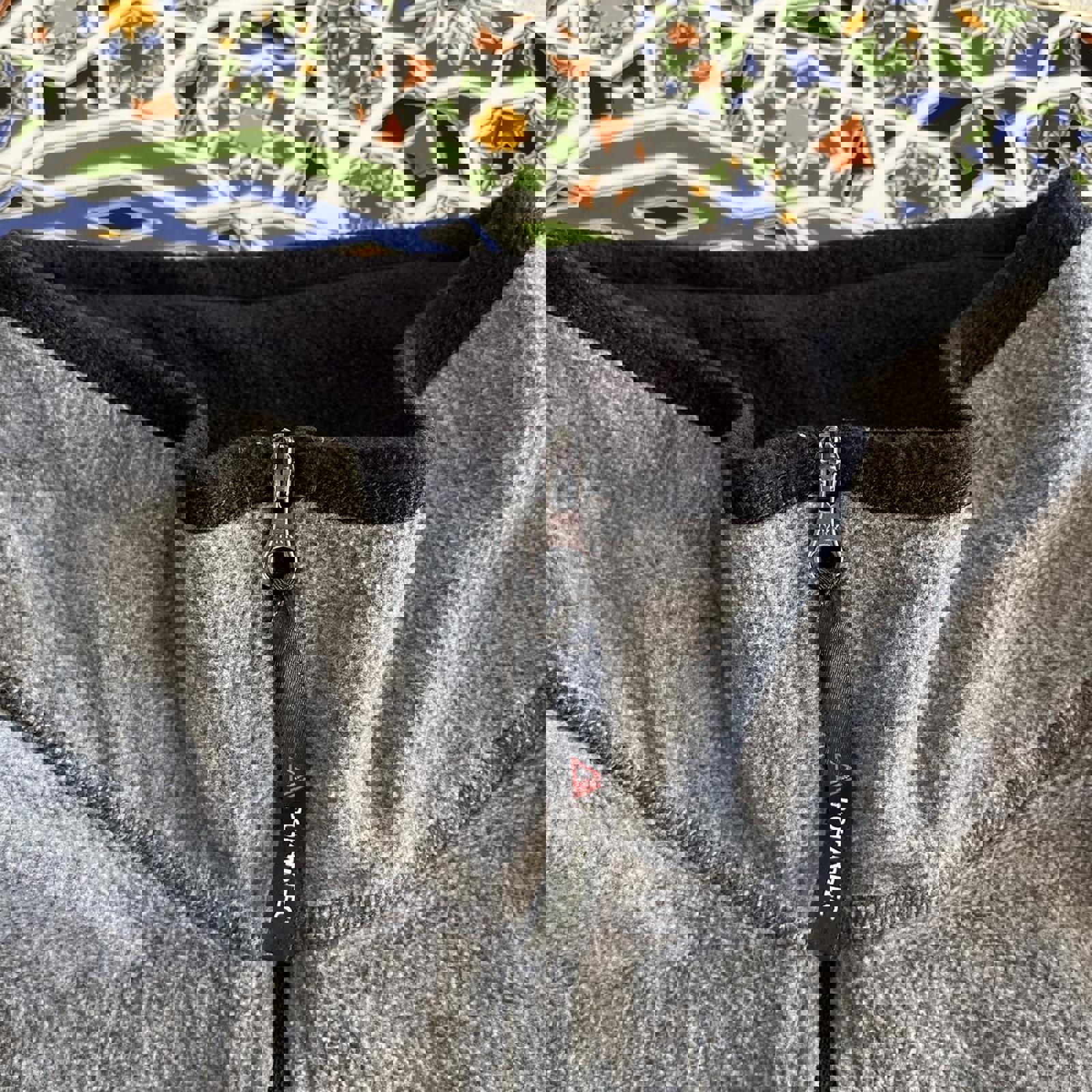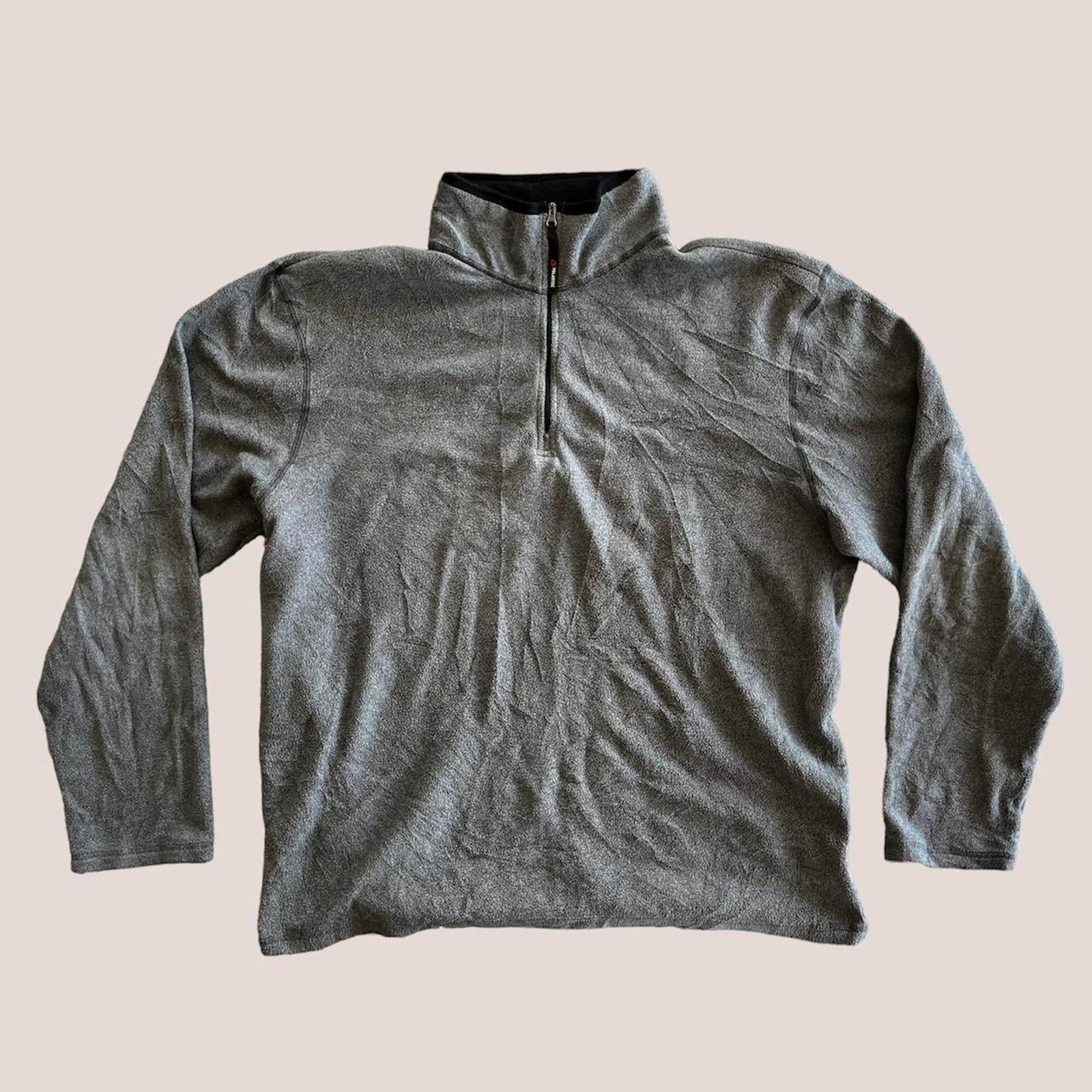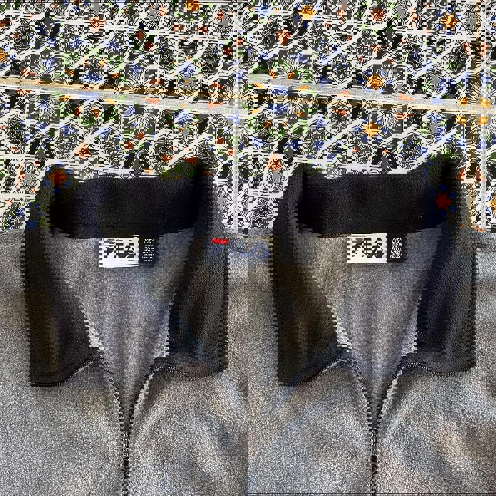 grey fila fleece 1/4 zip up sweatshirt with black fleece collar and embroidered grey fila logo on the hip