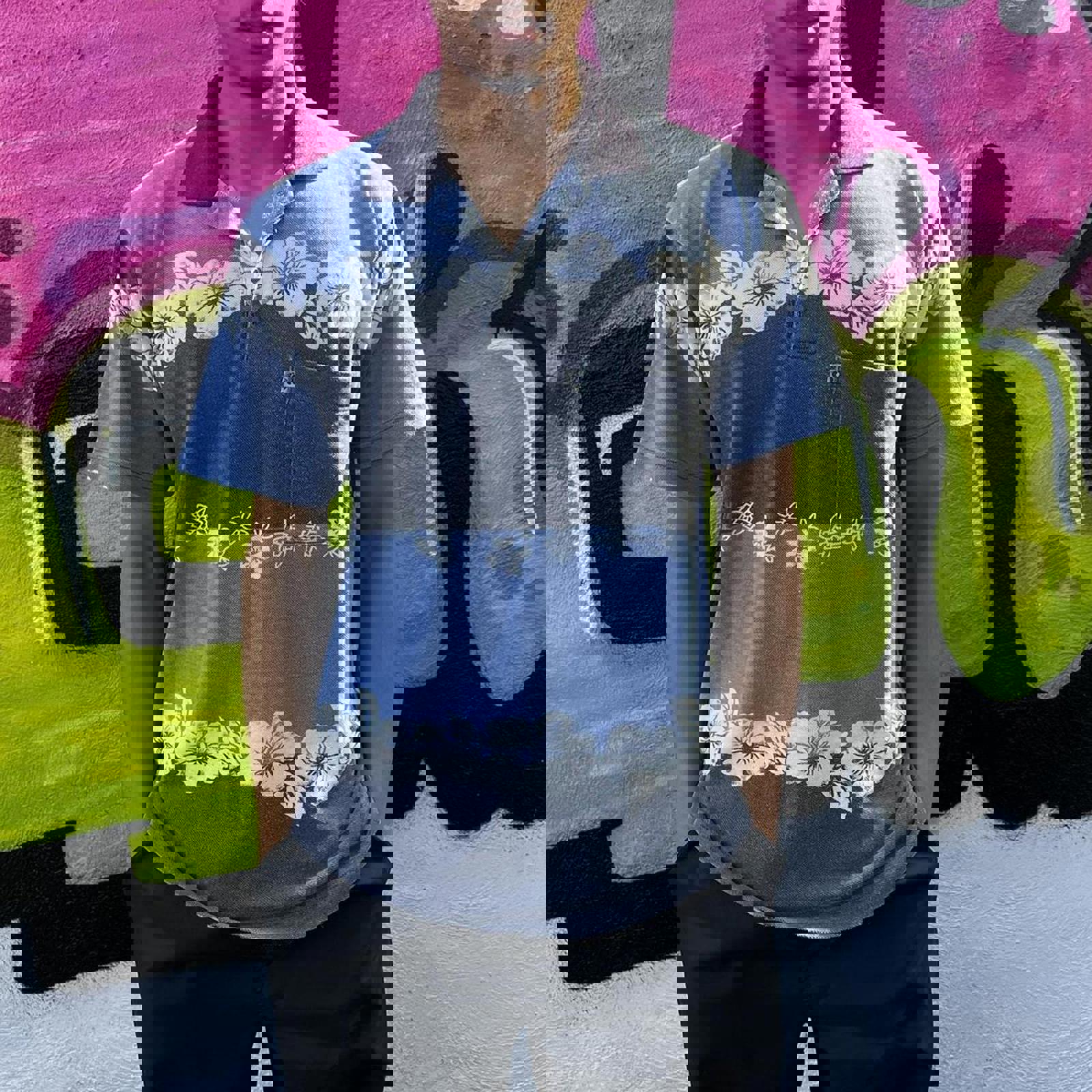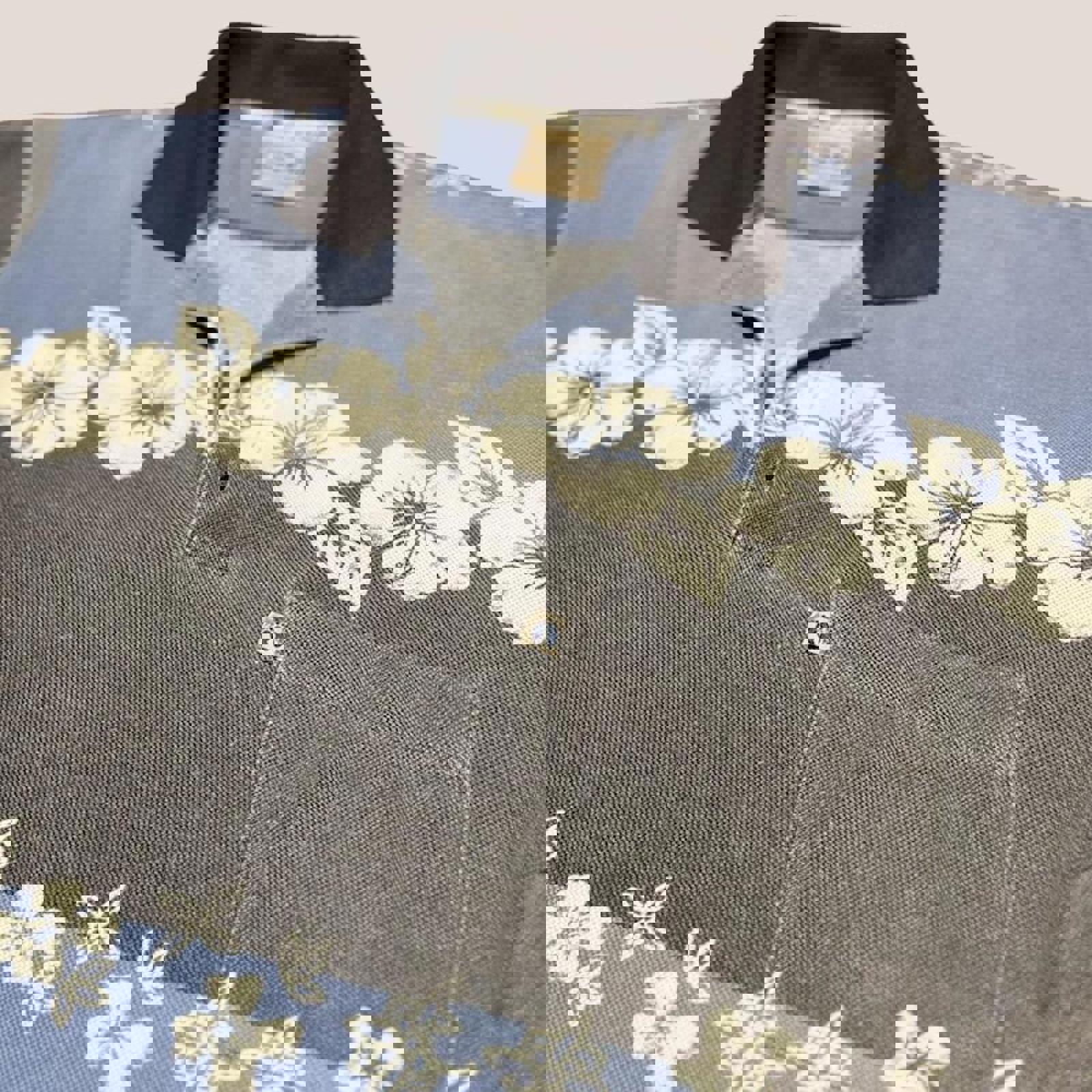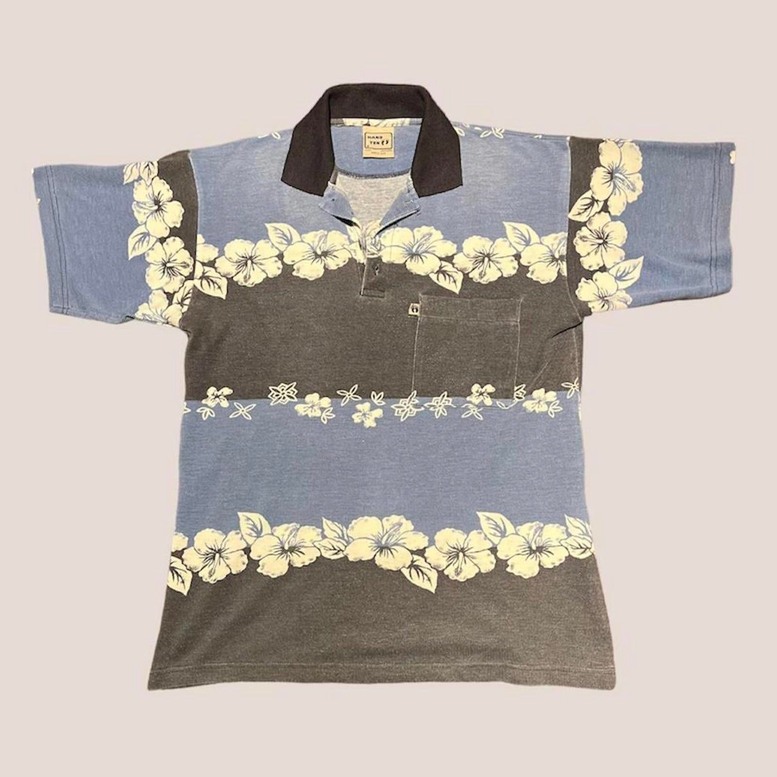 Hawaiian graphic wrapping around the whole polo tab with classic feet logo on side of pocket nice vintage faded look